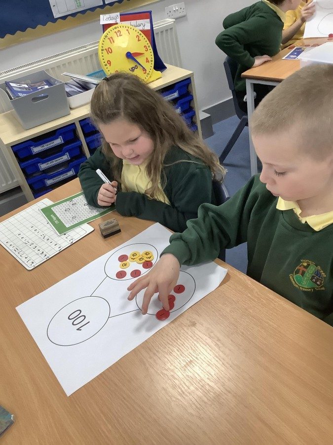 This week, the children have been learning how to find pairs to 100. We first recapped their number bonds to 20 with a game which they all enjoyed. We then looked at how to find pairs to 100 using counters. The children used a part whole model and counters to find the pair to 100 by building a number, and then found the pair using the trick that the tens need to total to 90 and the ones need to total to 10. After some practise, the children were able find pairs to 100 mentally. The children cannot wait to use this trick when playing the complements to 100 game on Monday.