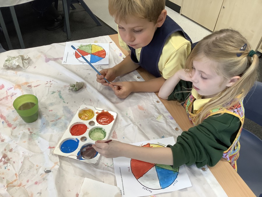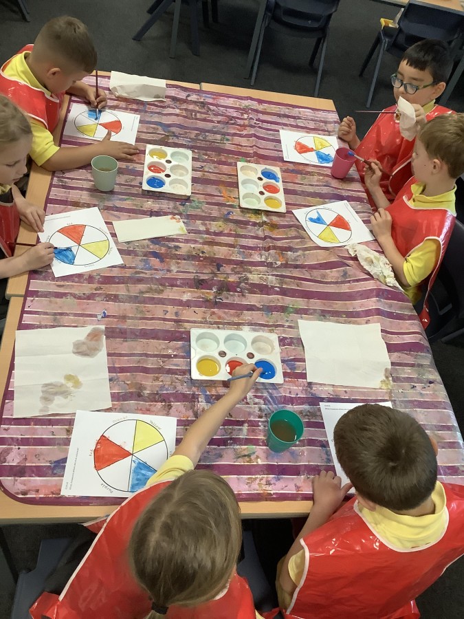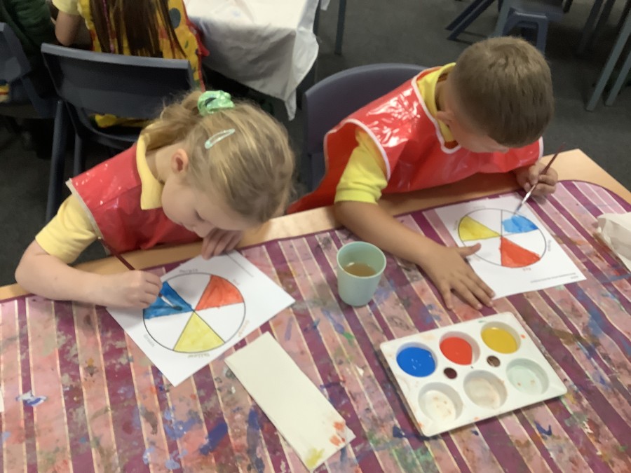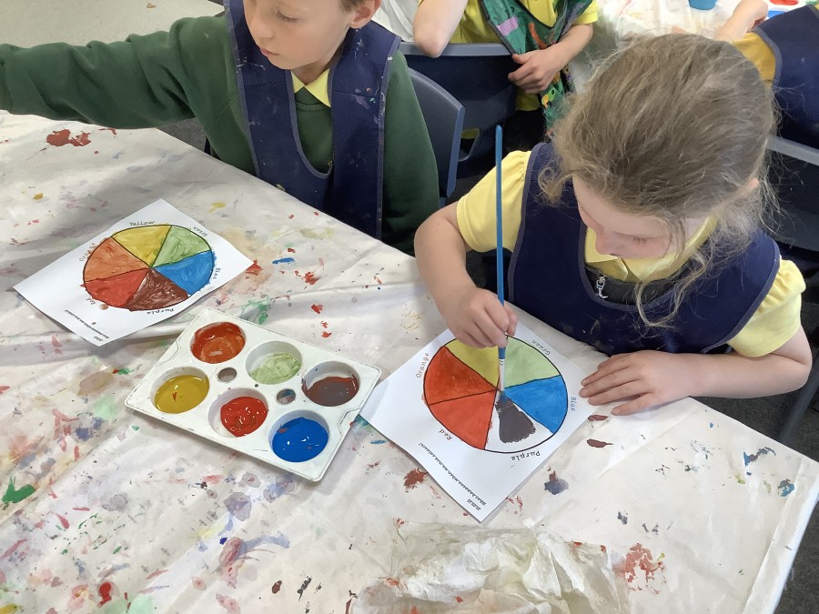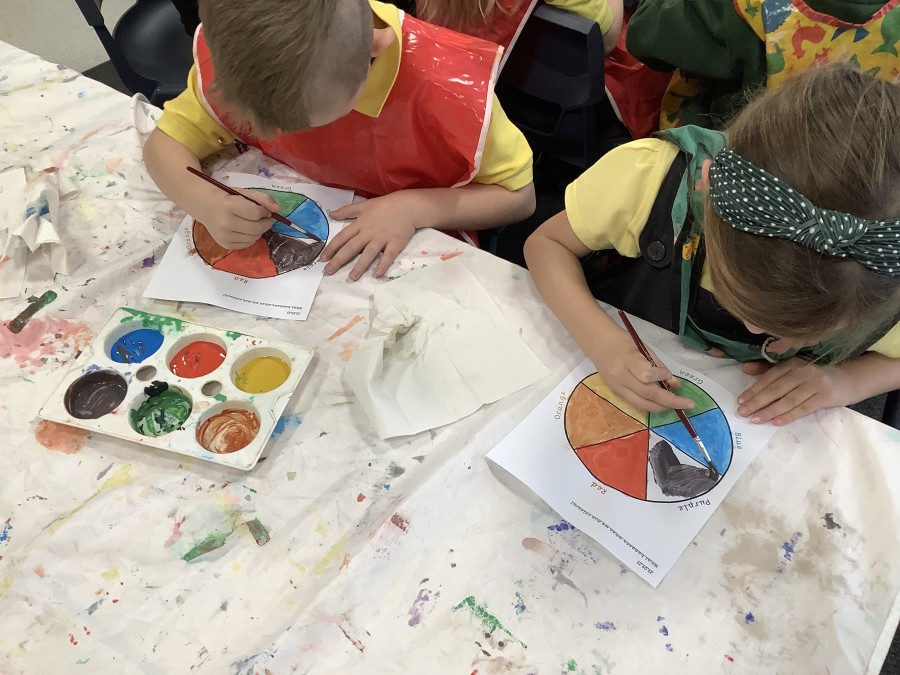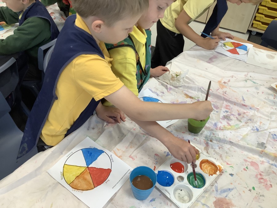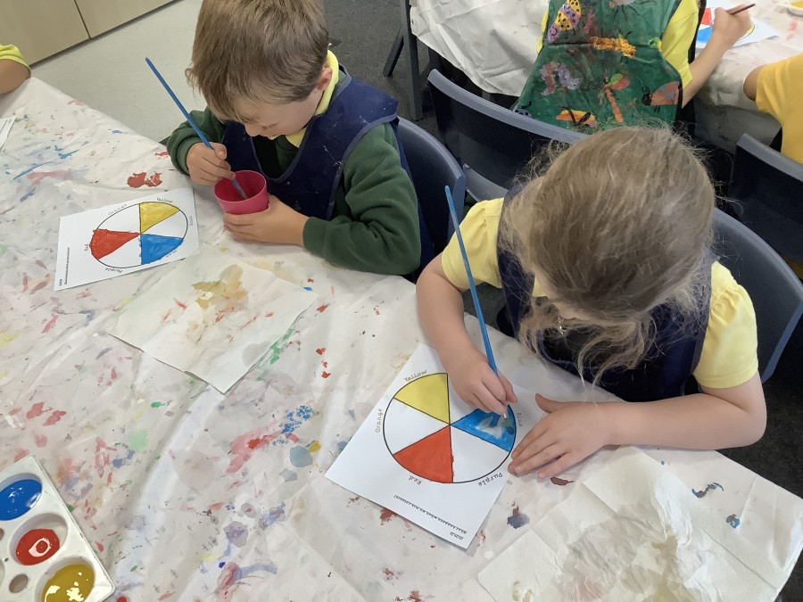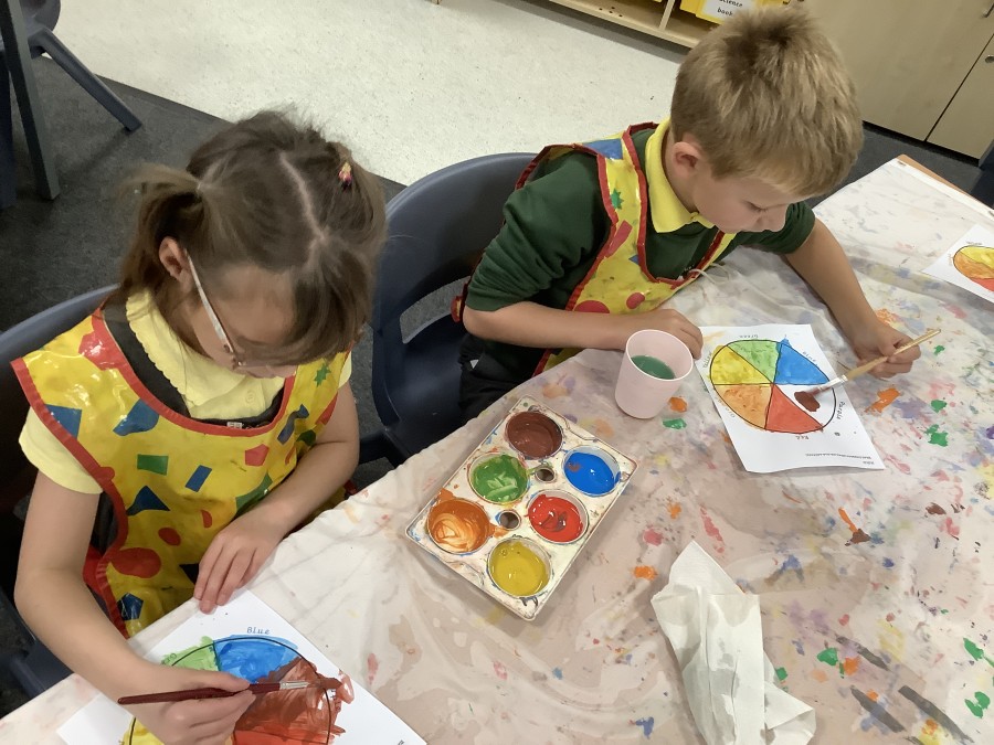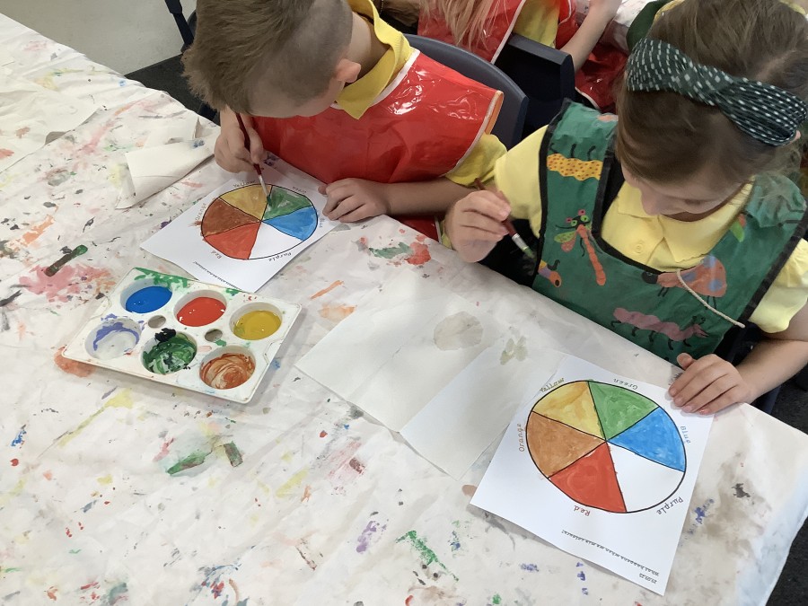 First, the children learnt about primary and secondary colours. The children found out that you can make secondary colours by mixing primary colours together. They worked together to mix their colours and create a colour wheel.