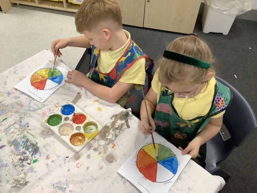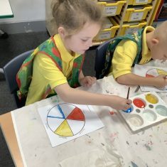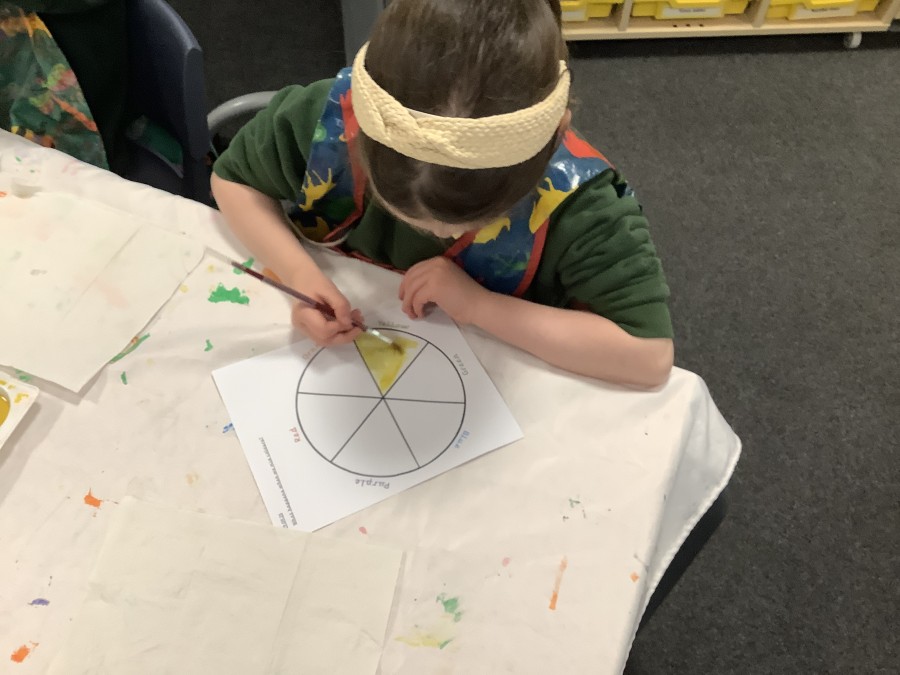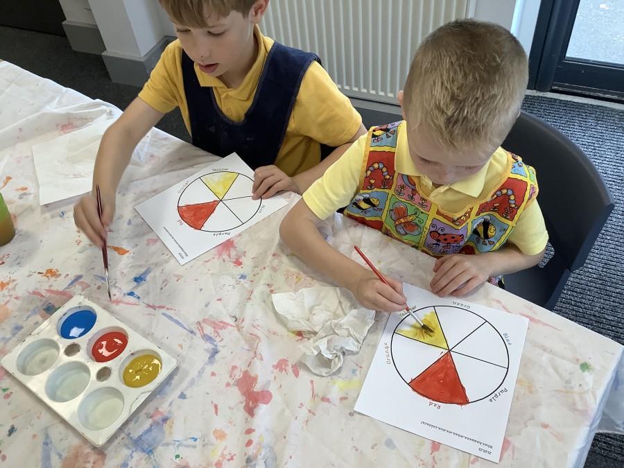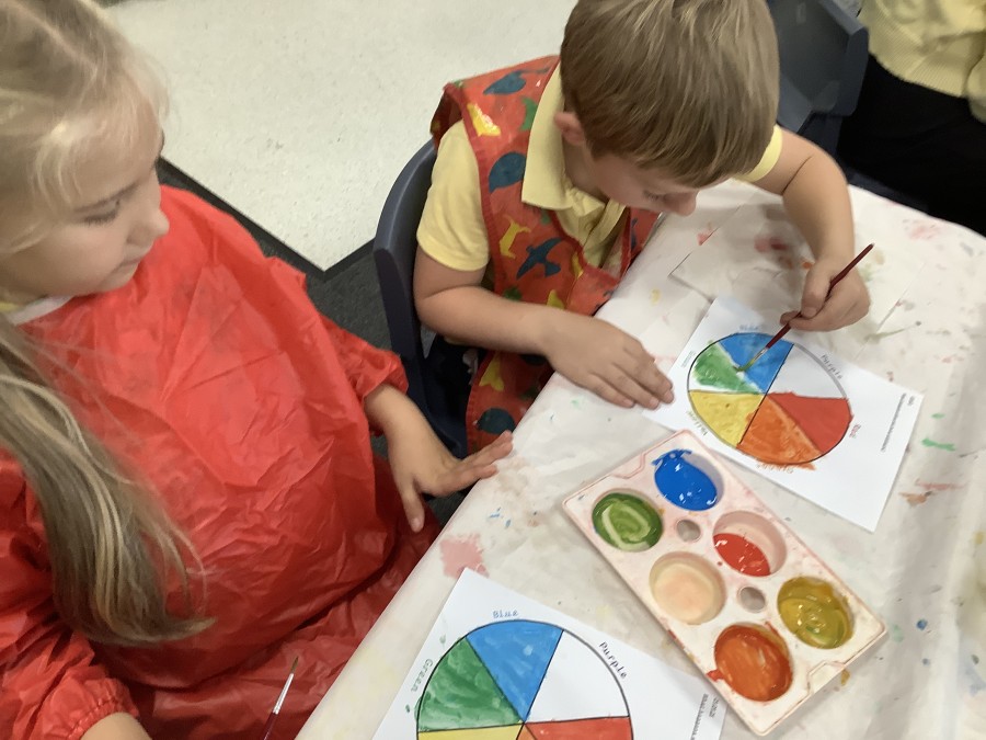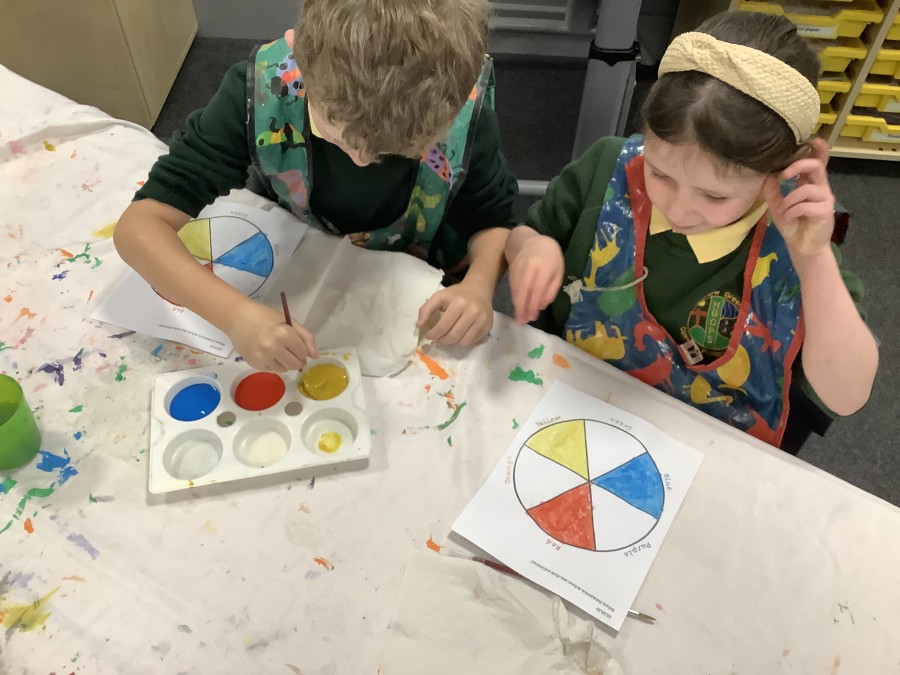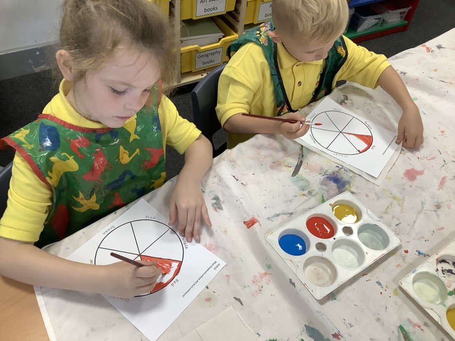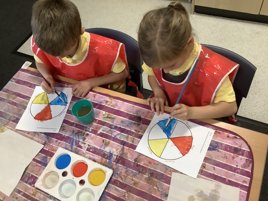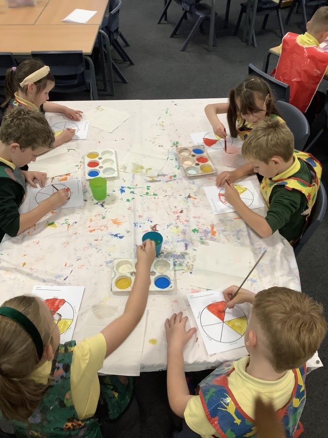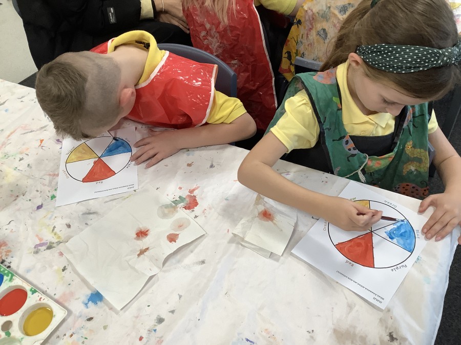 First, the children learnt about primary and secondary colours. The children found out that you can make secondary colours by mixing primary colours together. They worked together to mix their colours and create a colour wheel.