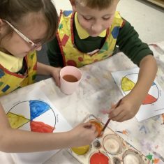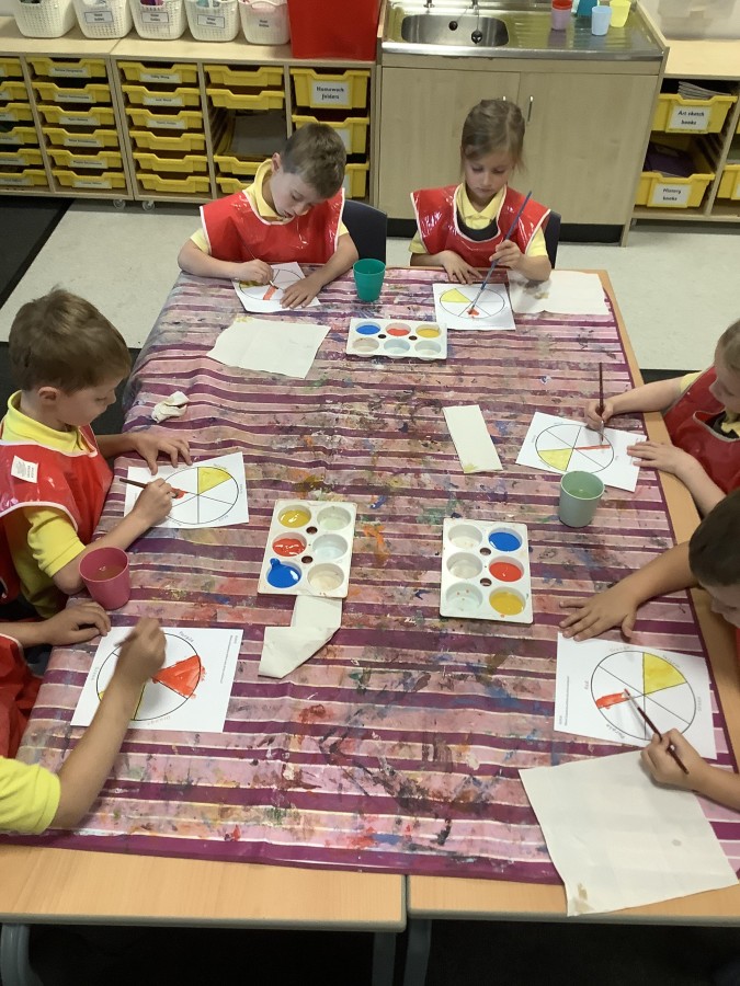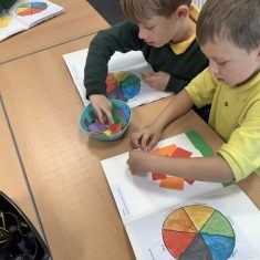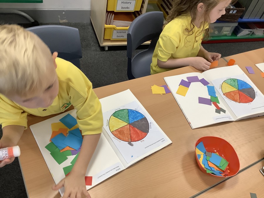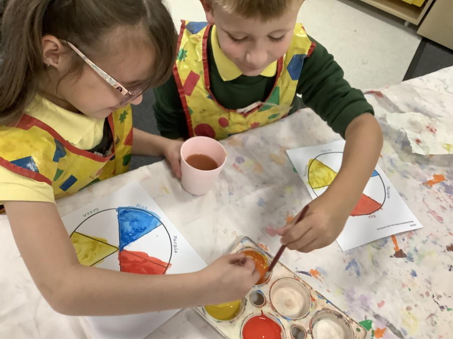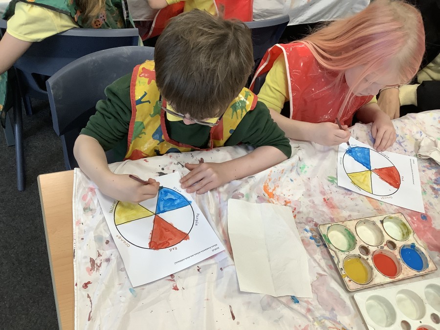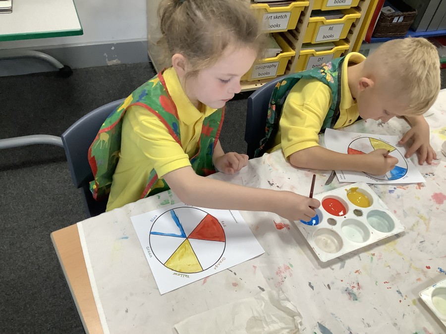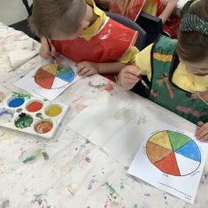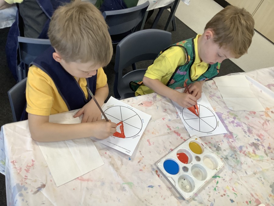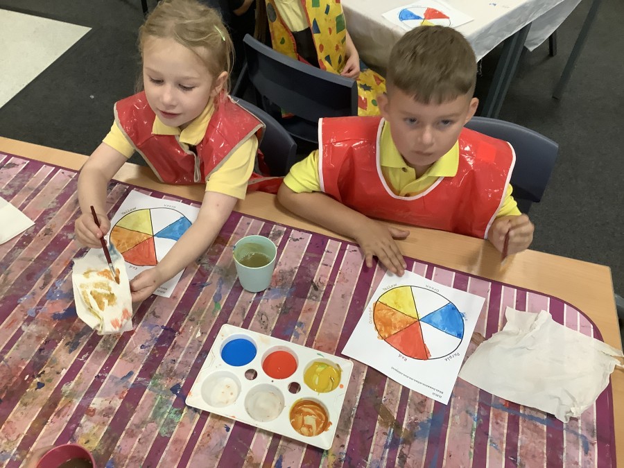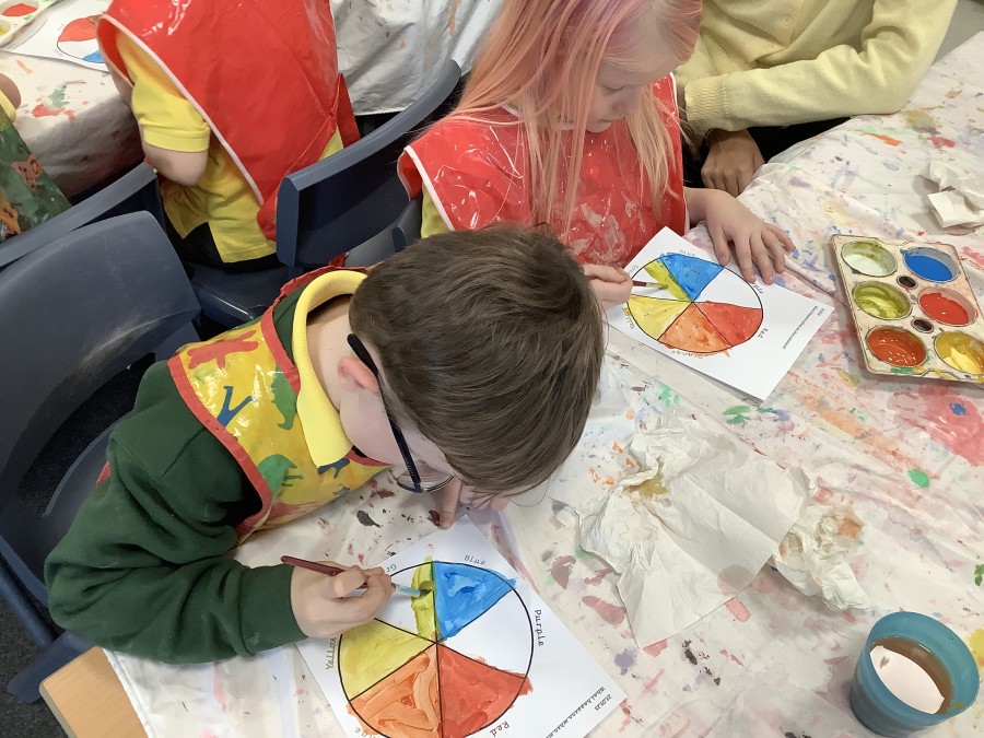 First, the children learnt about primary and secondary colours. The children found out that you can make secondary colours by mixing primary colours together. They worked together to mix their colours and create a colour wheel.