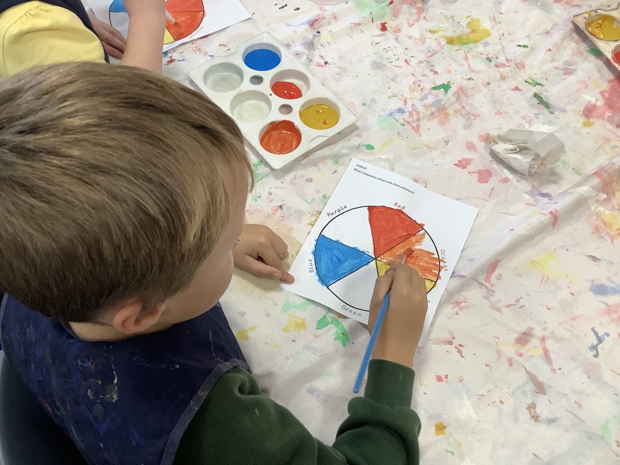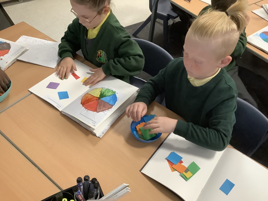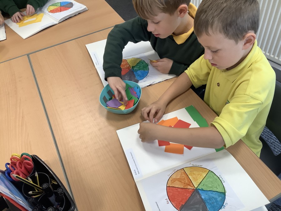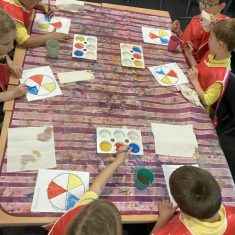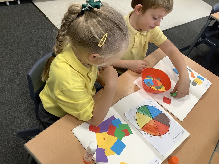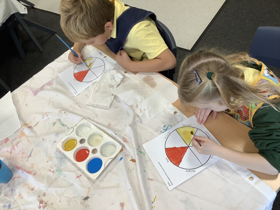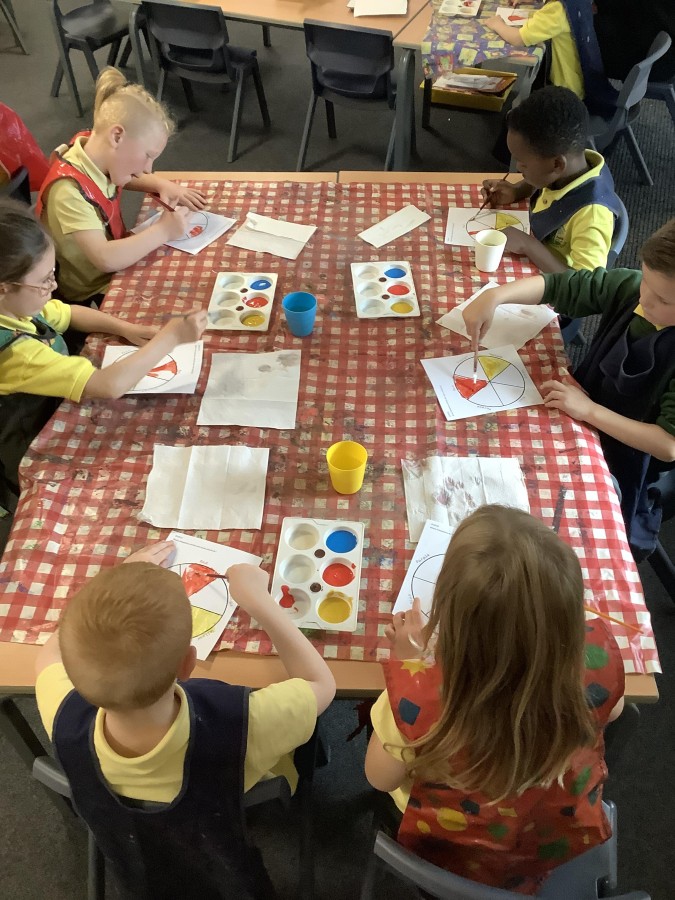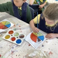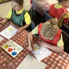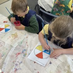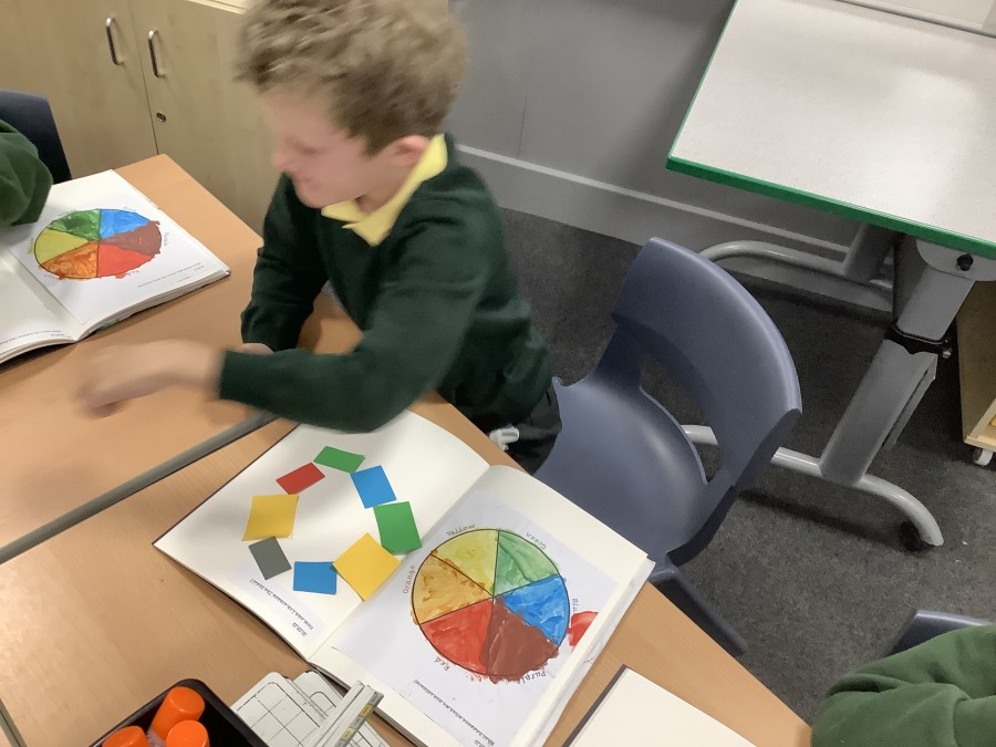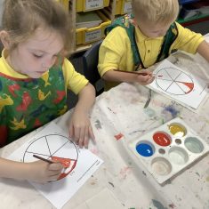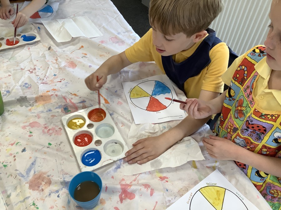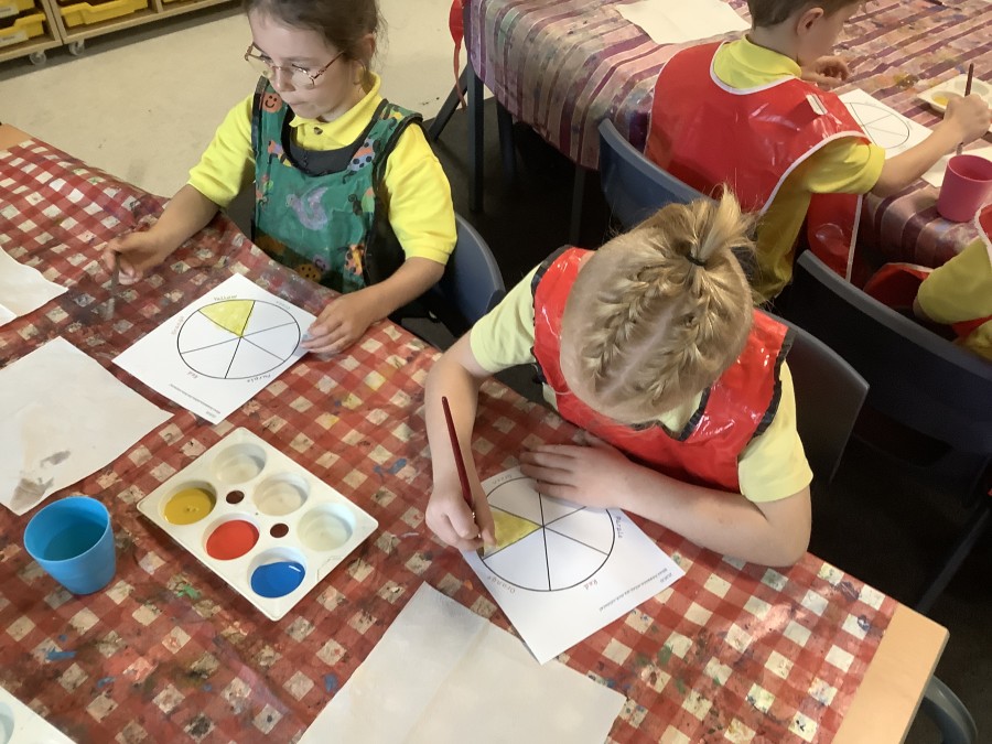 First, the children learnt about primary and secondary colours. The children found out that you can make secondary colours by mixing primary colours together. They worked together to mix their colours and create a colour wheel.