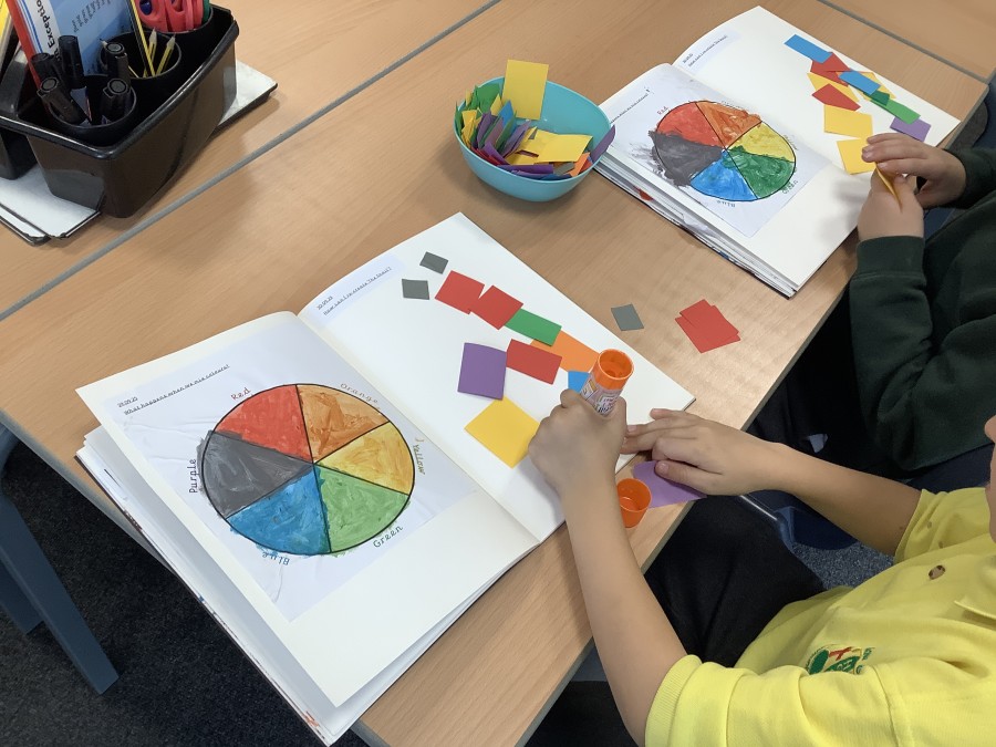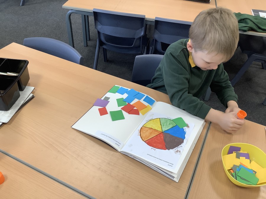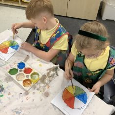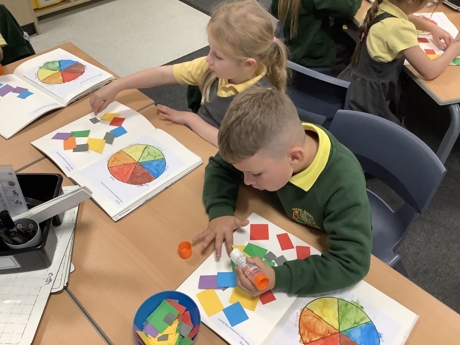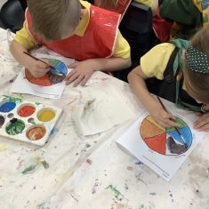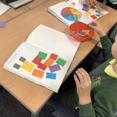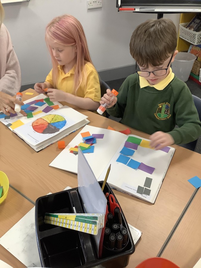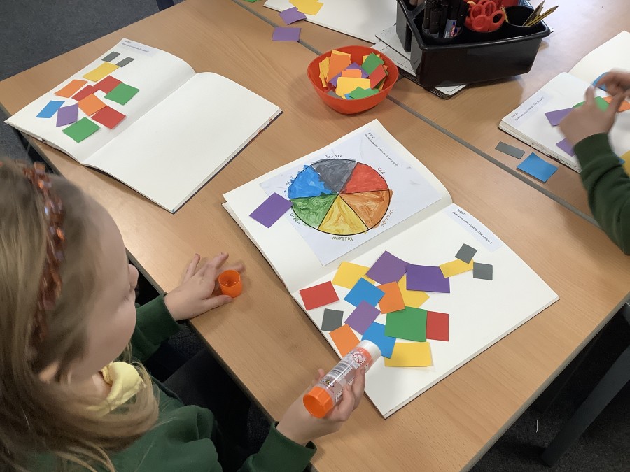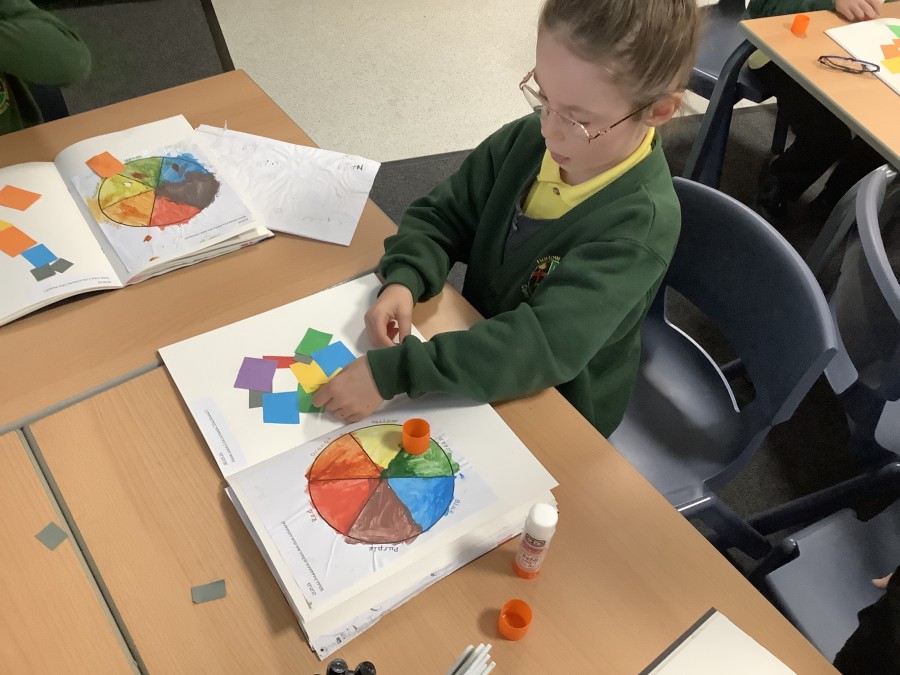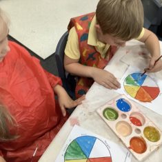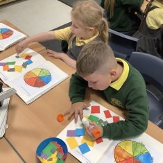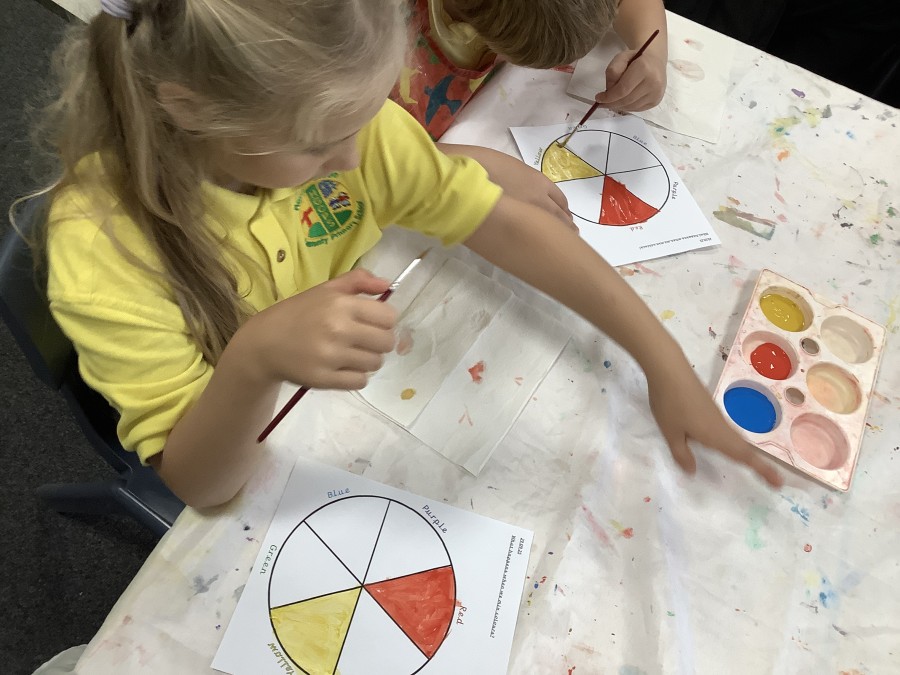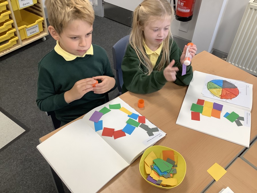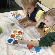 First, the children learnt about primary and secondary colours. The children found out that you can make secondary colours by mixing primary colours together. They worked together to mix their colours and create a colour wheel.