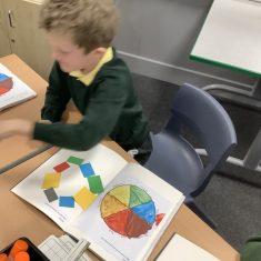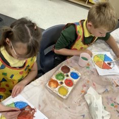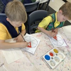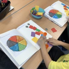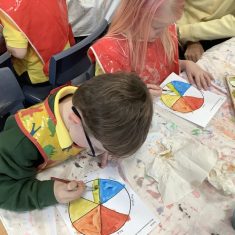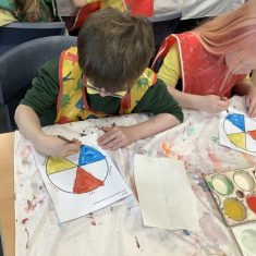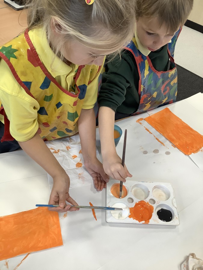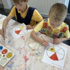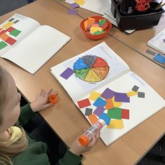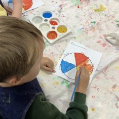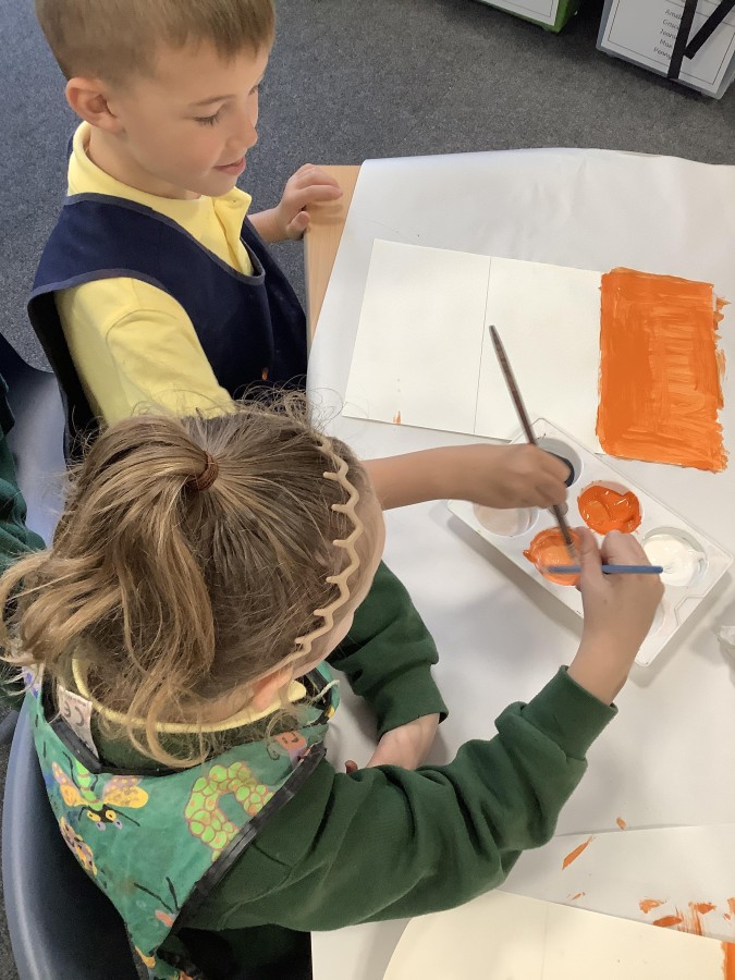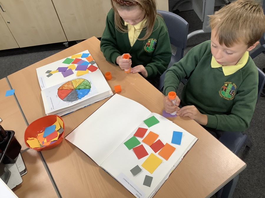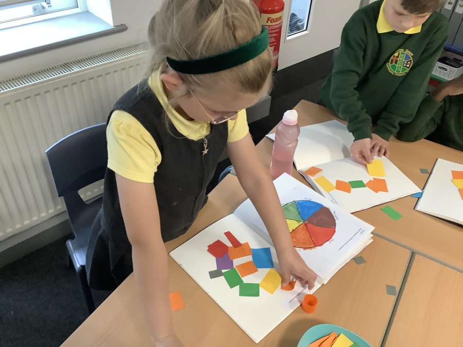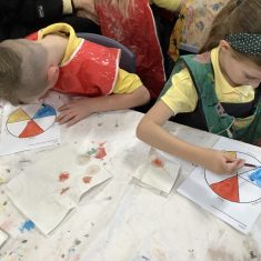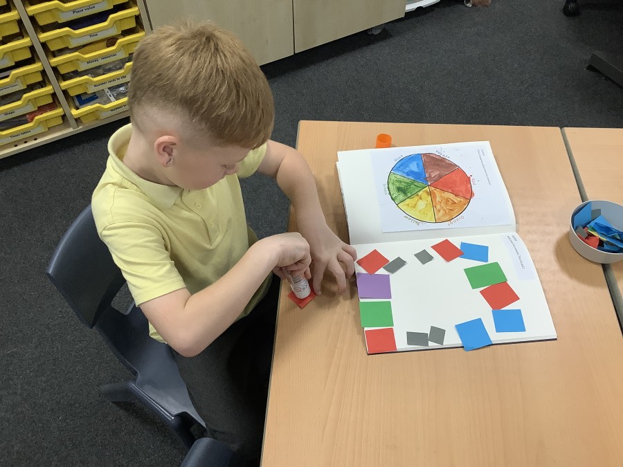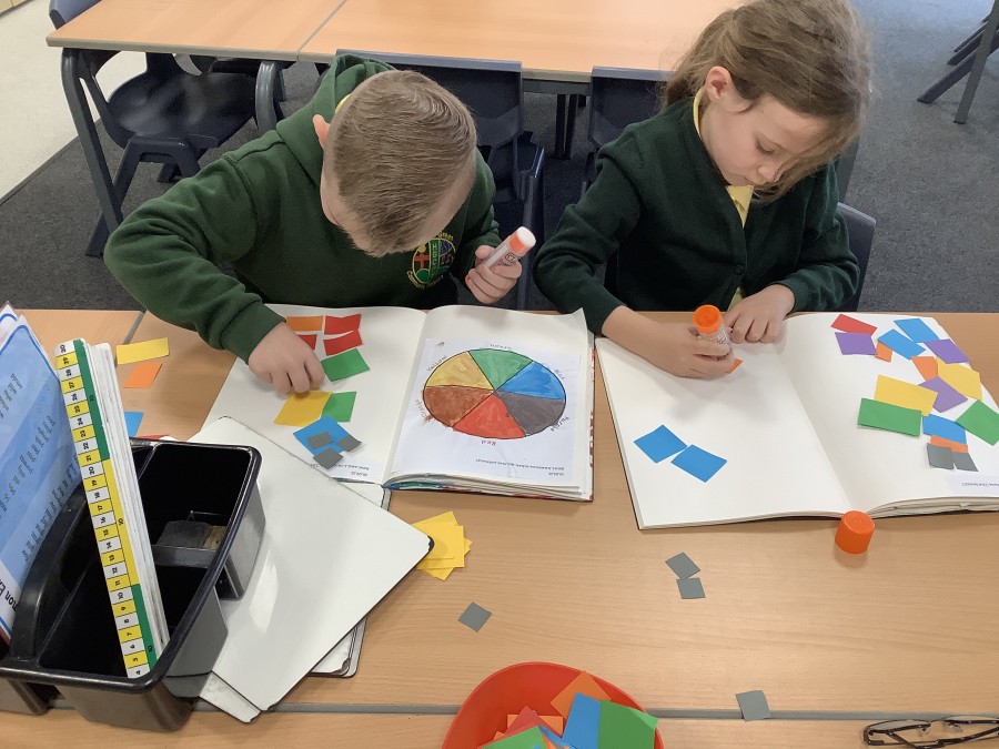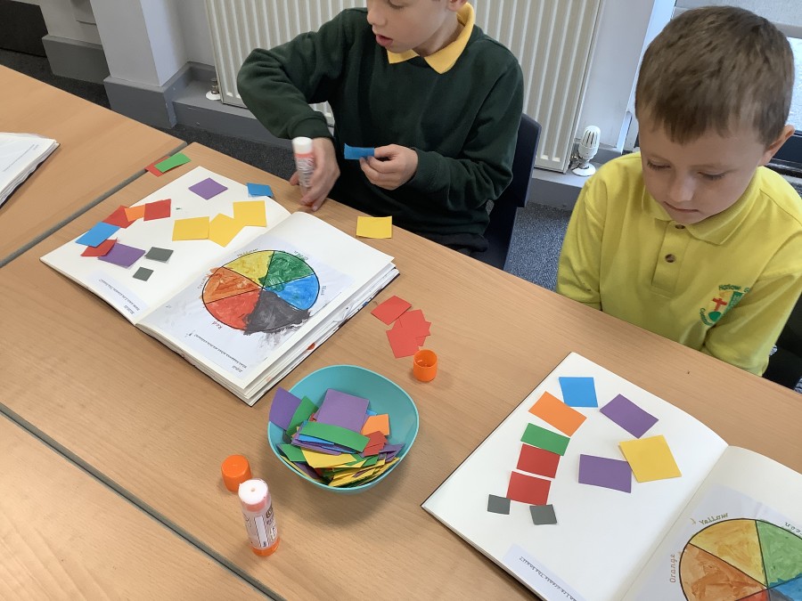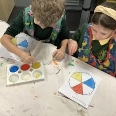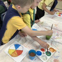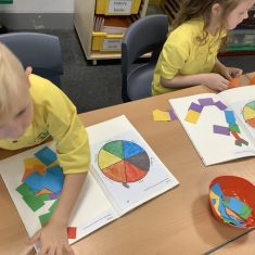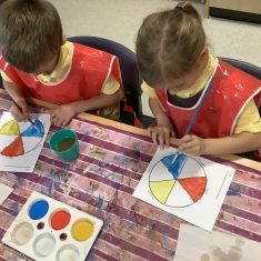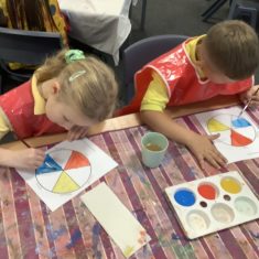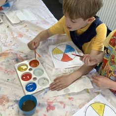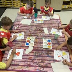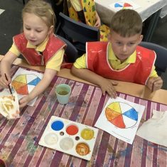 First, the children learnt about primary and secondary colours. The children found out that you can make secondary colours by mixing primary colours together. They worked together to mix their colours and create a colour wheel.