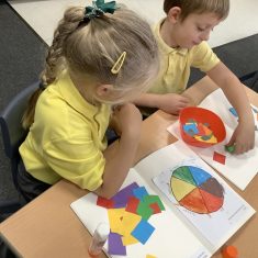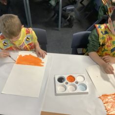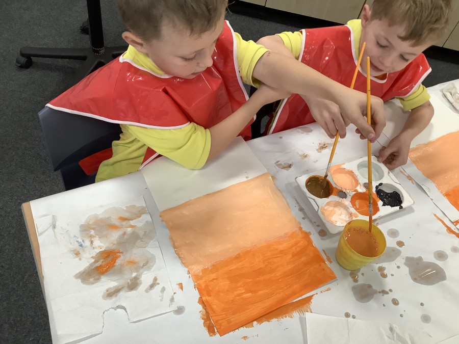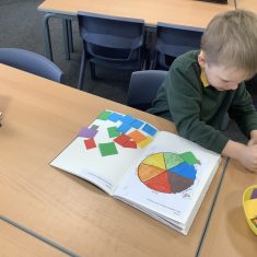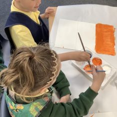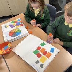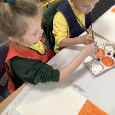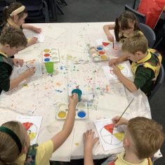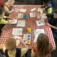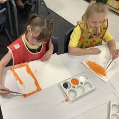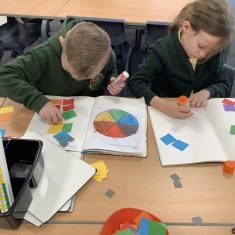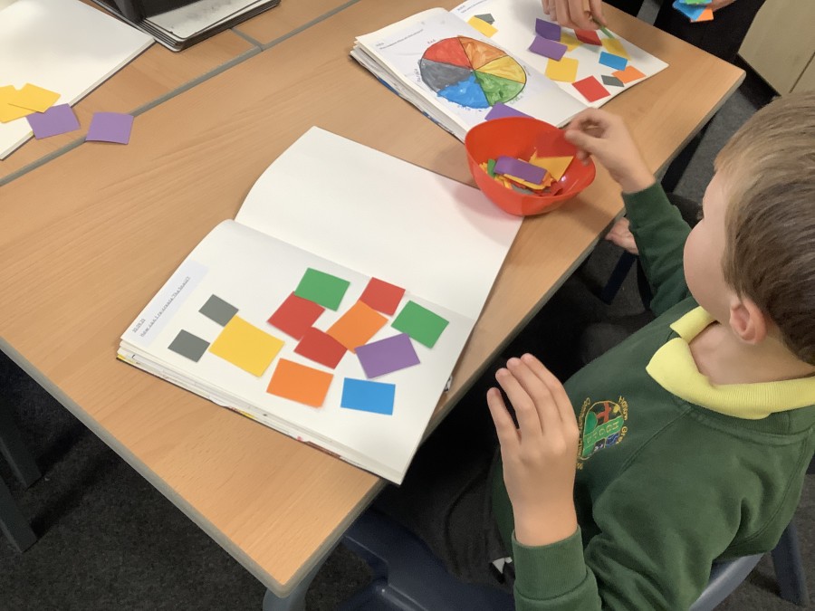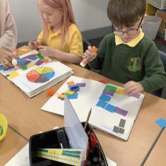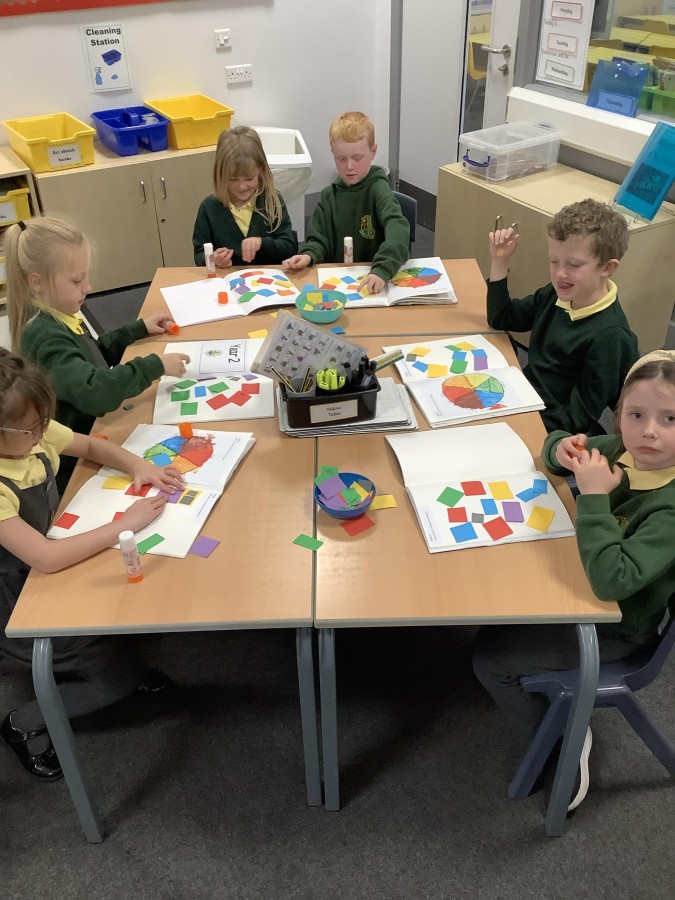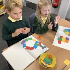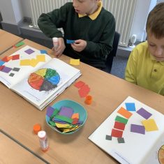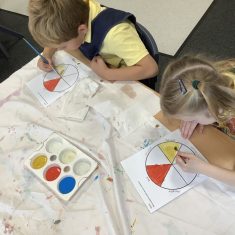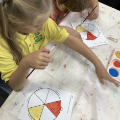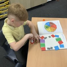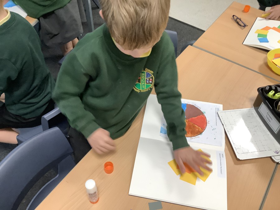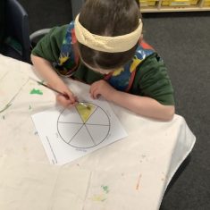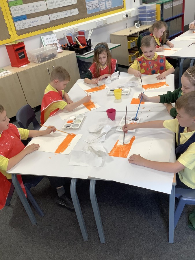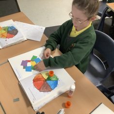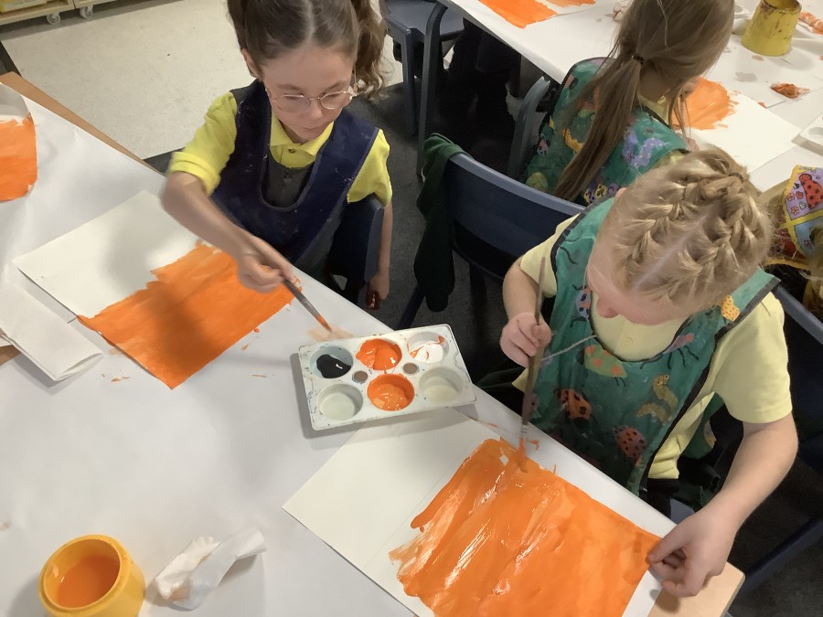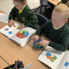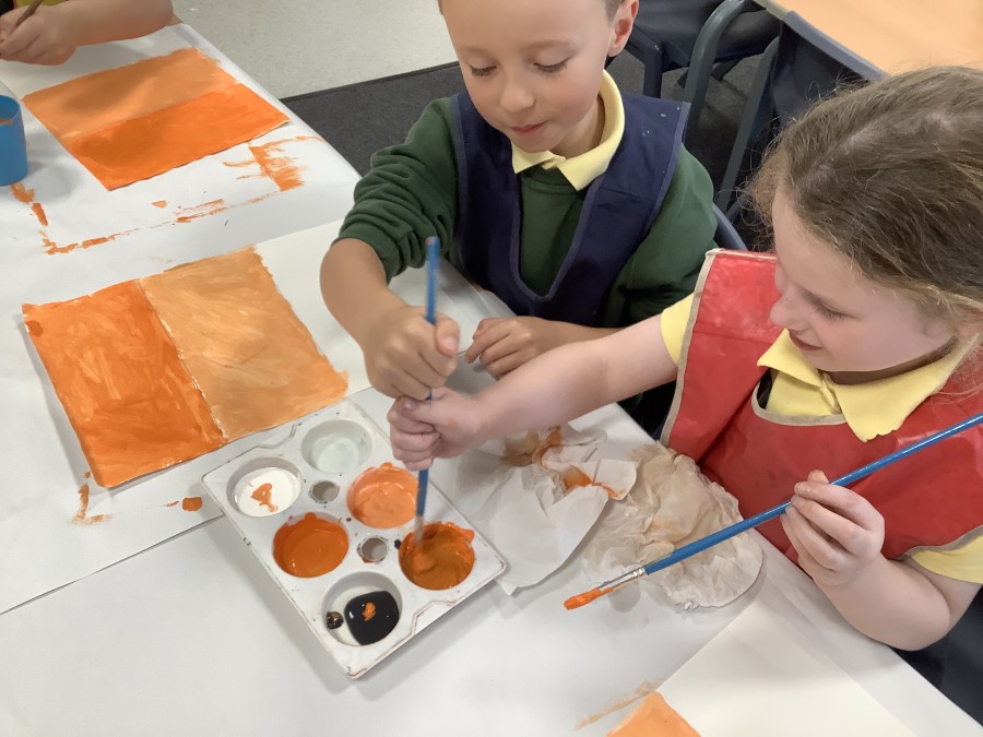 First, the children learnt about primary and secondary colours. The children found out that you can make secondary colours by mixing primary colours together. They worked together to mix their colours and create a colour wheel.