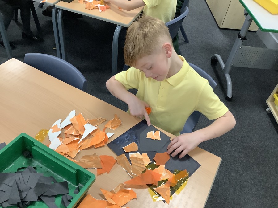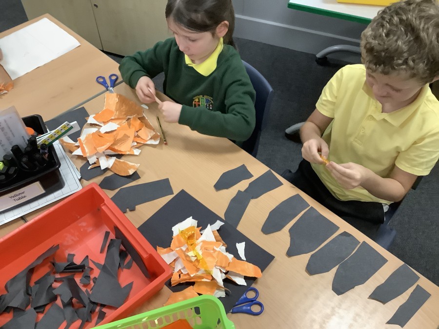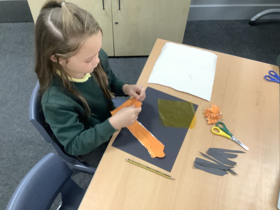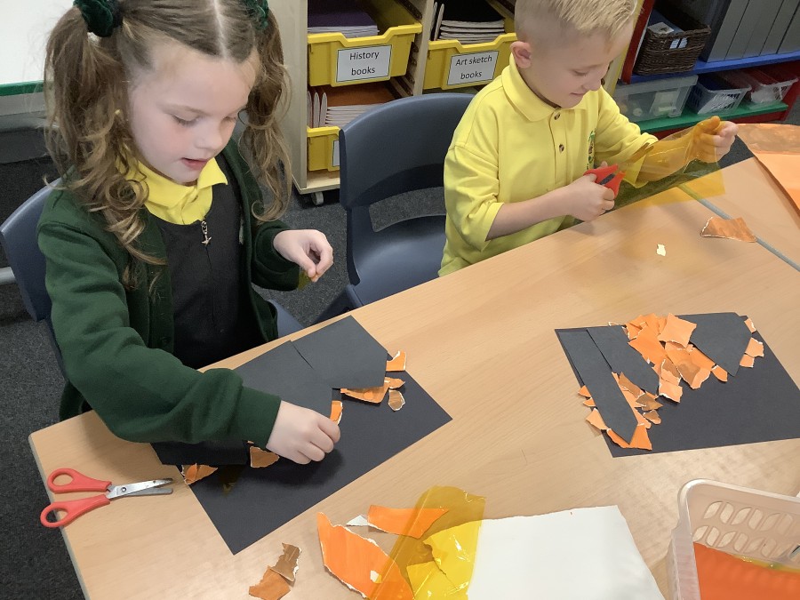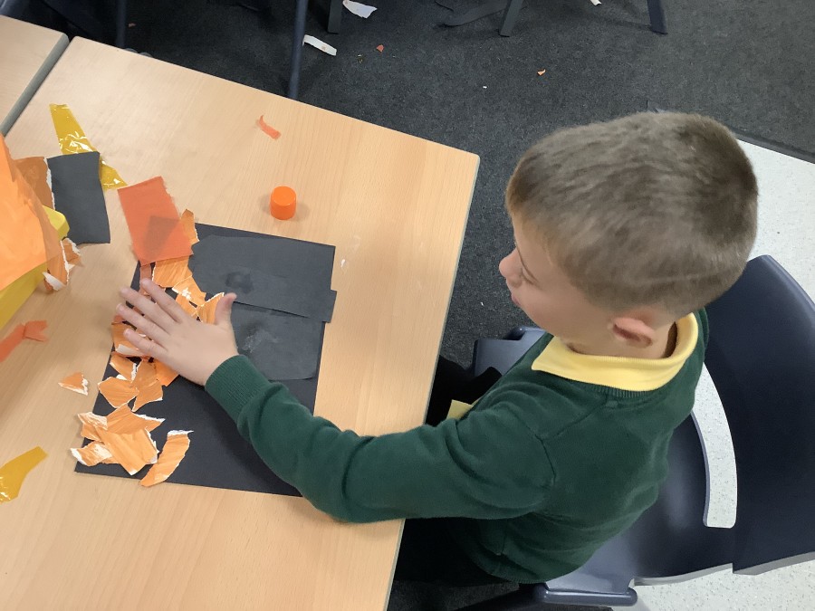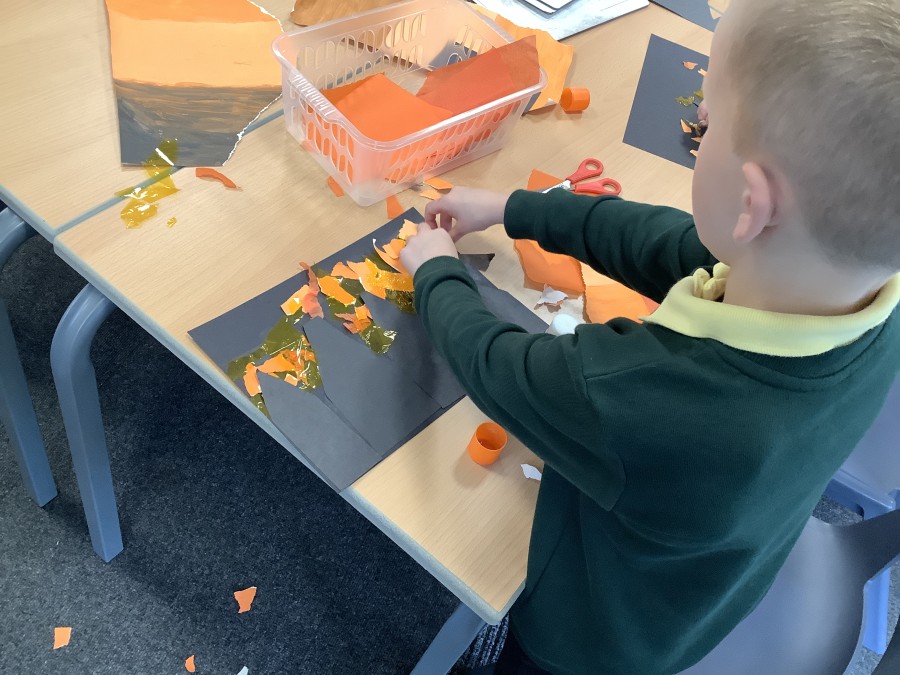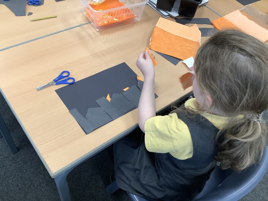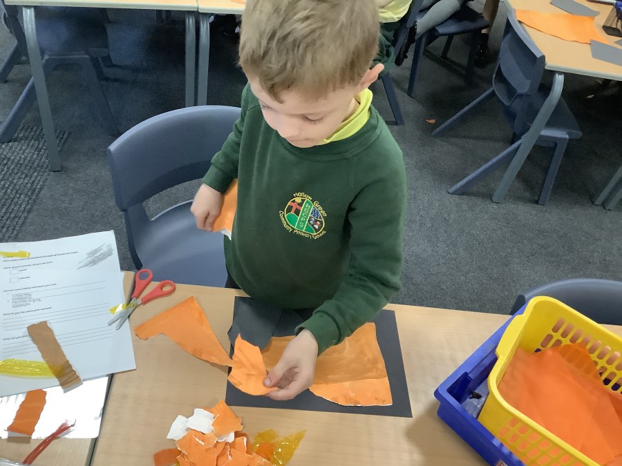 After that, the boys and girls learnt how to create shades and tints of the same colour. They added white paint to orange to create a lighter tint and black paint to orange to create a darker shade. Finally, it was time for the children to create their own collages. They used the different oranges they had painted, along with tissue paper and cellophane to create a scene showing houses on fire. The children ripped up their different materials to represent flames before arranging them to create their final piece.
