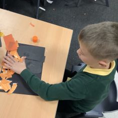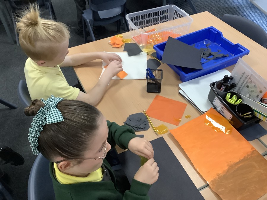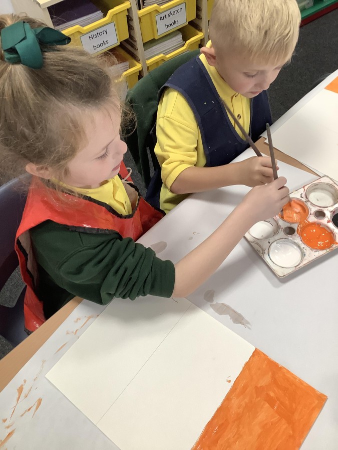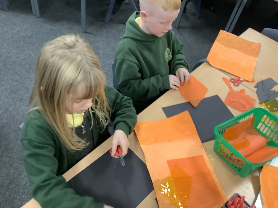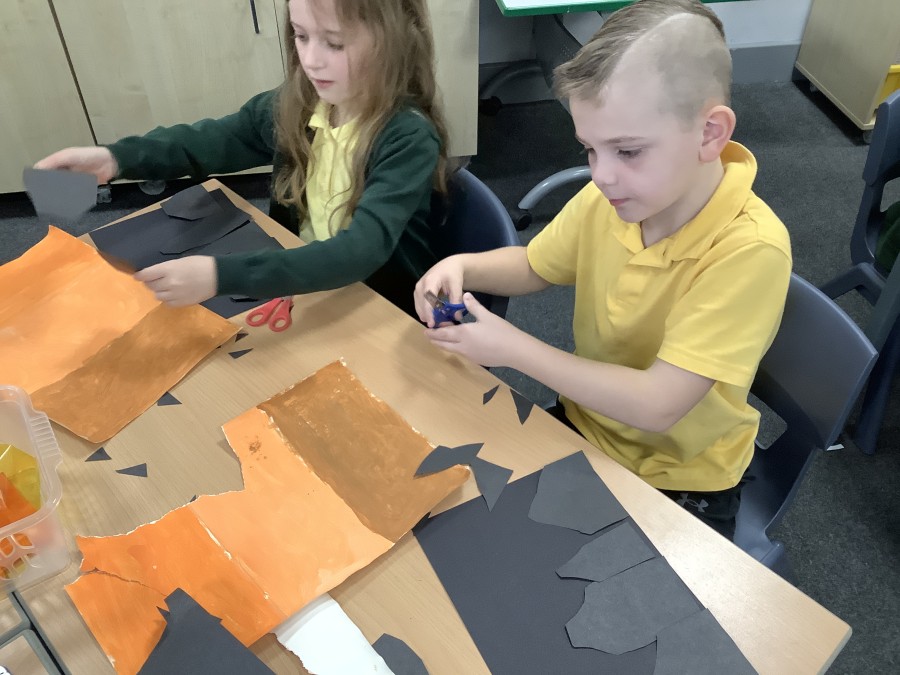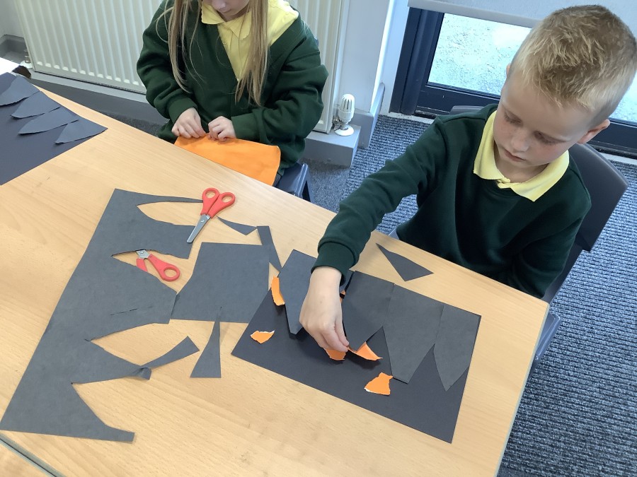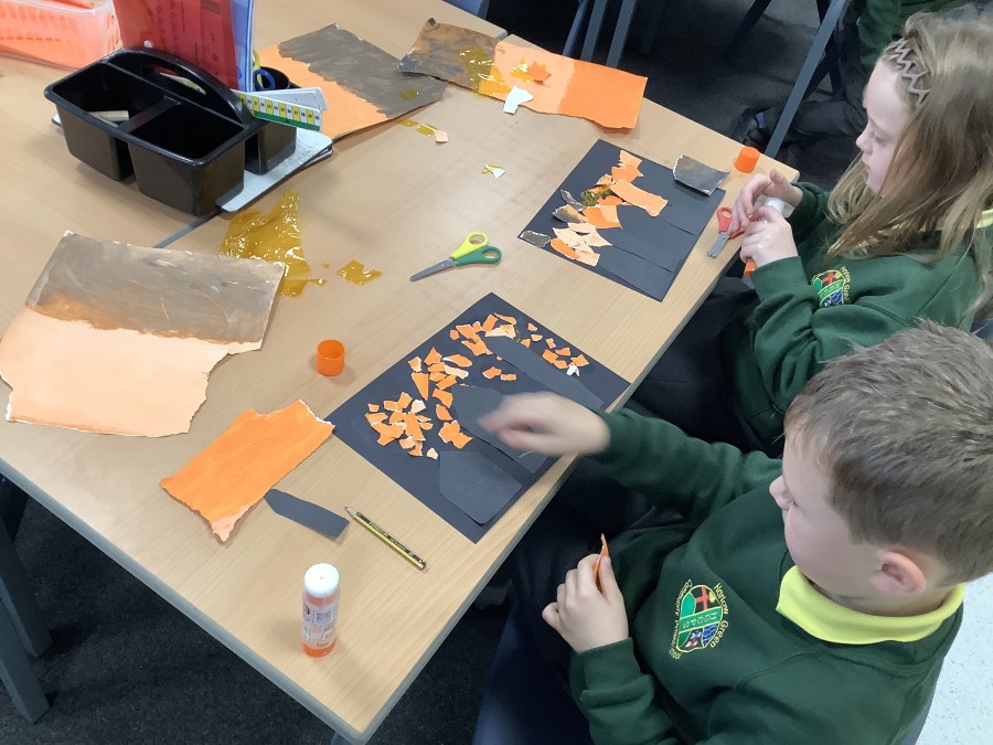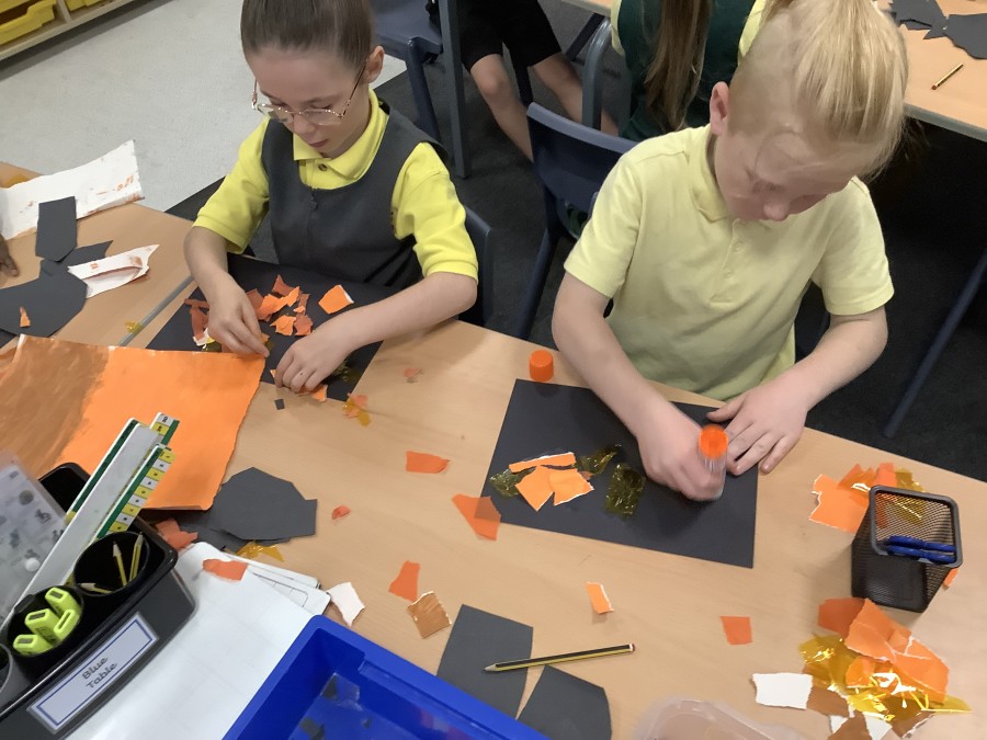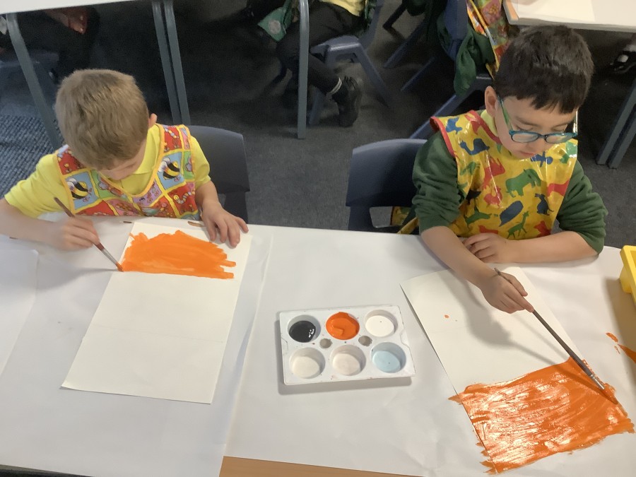After that, the boys and girls learnt how to create shades and tints of the same colour. They added white paint to orange to create a lighter tint and black paint to orange to create a darker shade. Finally, it was time for the children to create their own collages. They used the different oranges they had painted, along with tissue paper and cellophane to create a scene showing houses on fire. The children ripped up their different materials to represent flames before arranging them to create their final piece.