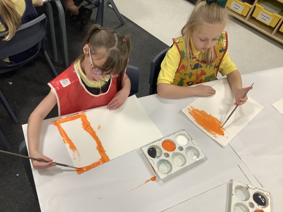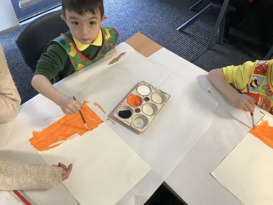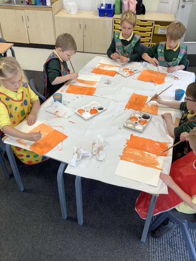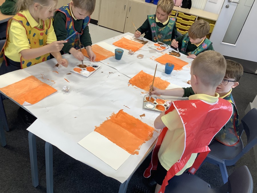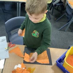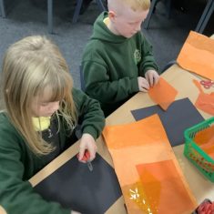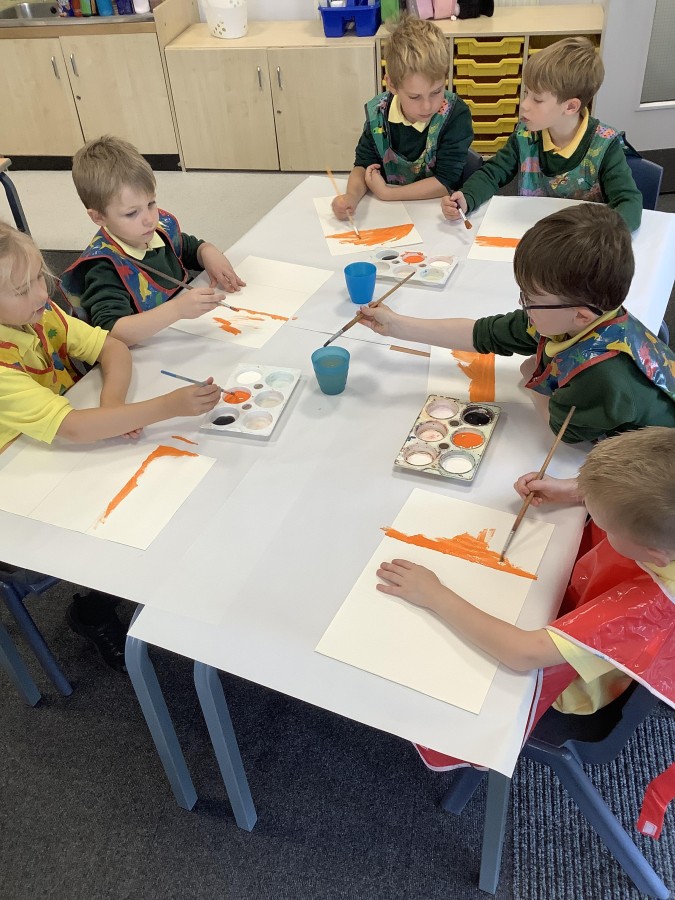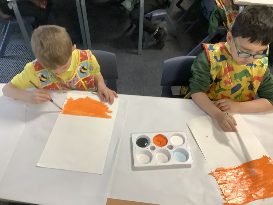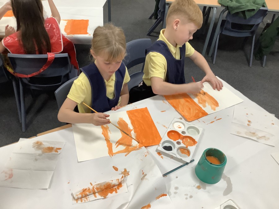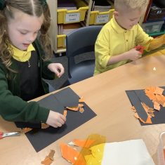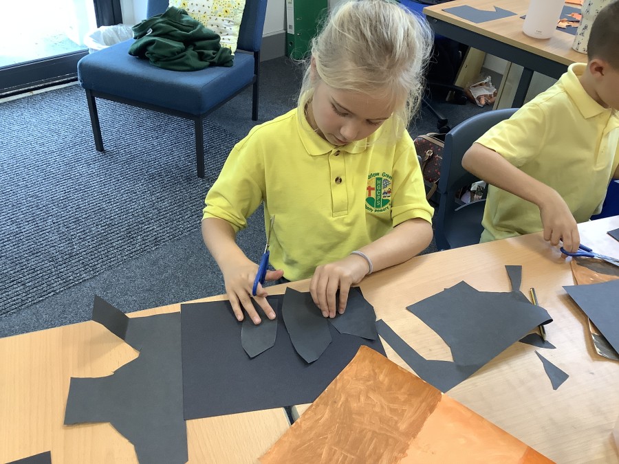 After that, the boys and girls learnt how to create shades and tints of the same colour. They added white paint to orange to create a lighter tint and black paint to orange to create a darker shade. Finally, it was time for the children to create their own collages. They used the different oranges they had painted, along with tissue paper and cellophane to create a scene showing houses on fire. The children ripped up their different materials to represent flames before arranging them to create their final piece.