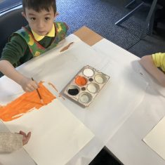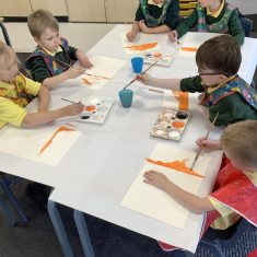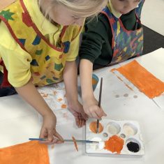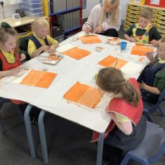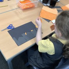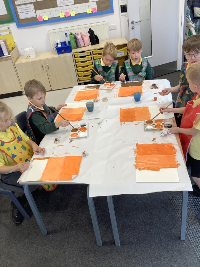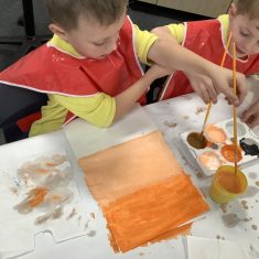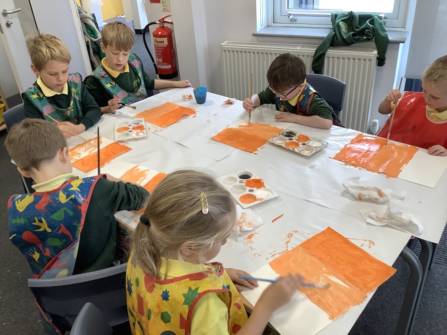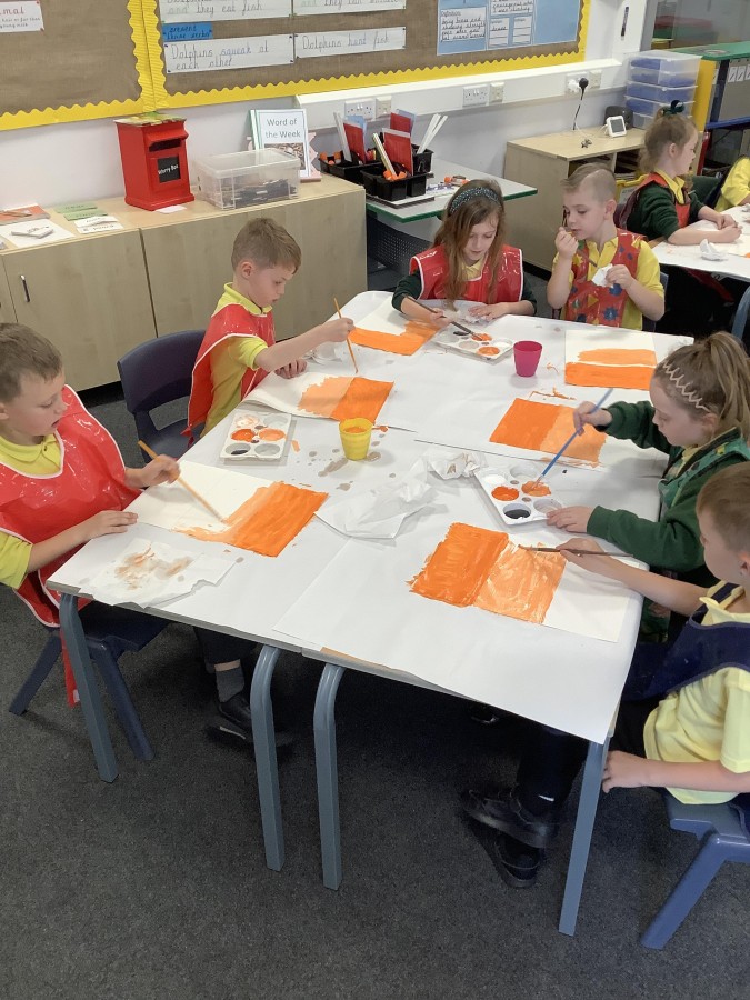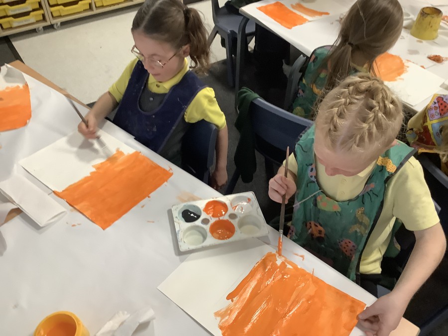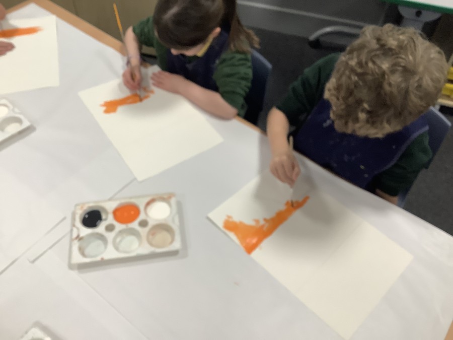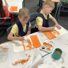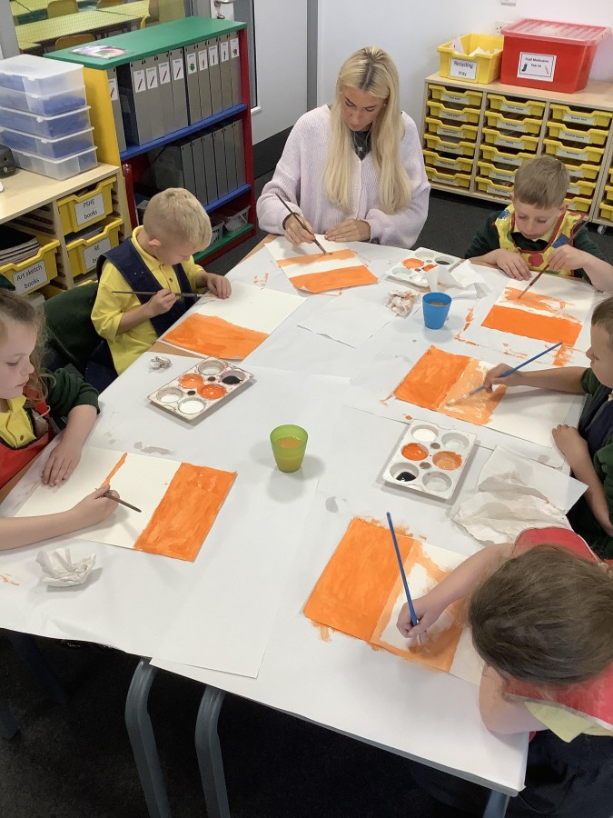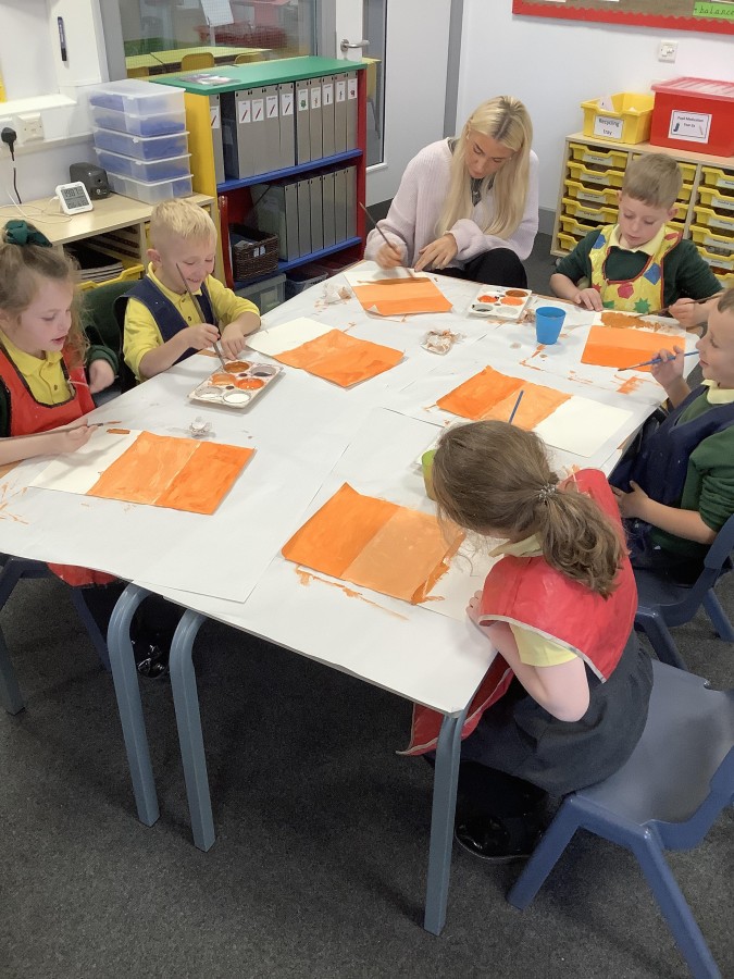 After that, the boys and girls learnt how to create shades and tints of the same colour. They added white paint to orange to create a lighter tint and black paint to orange to create a darker shade. Finally, it was time for the children to create their own collages. They used the different oranges they had painted, along with tissue paper and cellophane to create a scene showing houses on fire. The children ripped up their different materials to represent flames before arranging them to create their final piece.