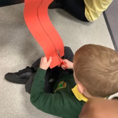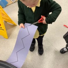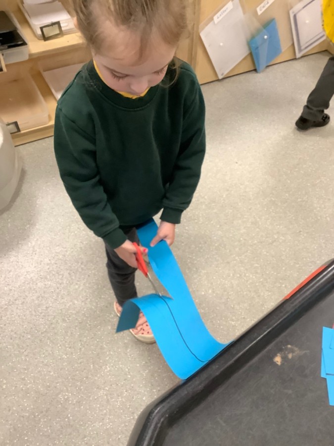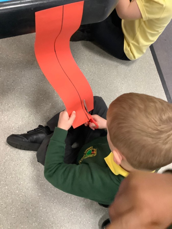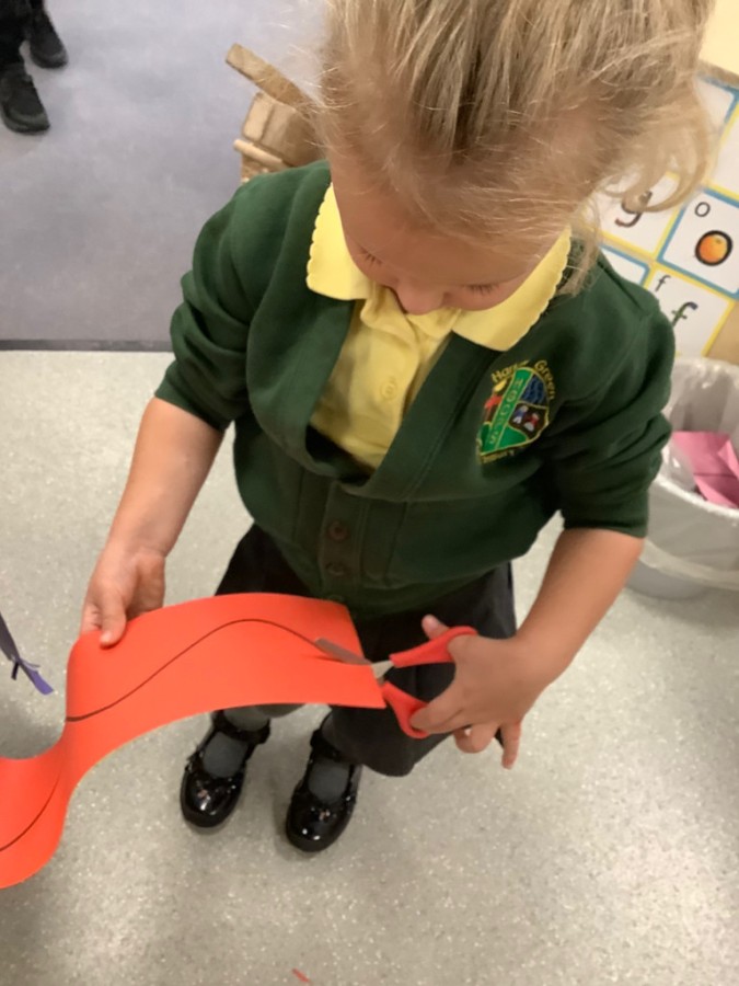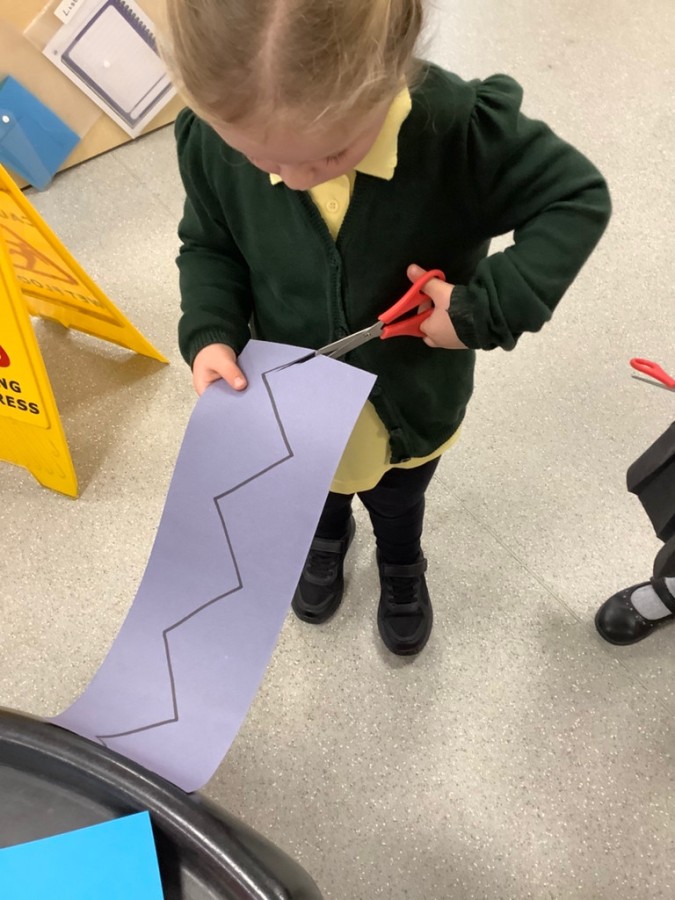 We have been working on scissor safety and have learnt that we must never leave scissors laid around the classroom, we cannot run when scissors are in our hand and we have to hold the blades in our hand when travelling around the room to stop our friends getting hurt. We learnt a rhyme which helps us to remember where to place our fingers, ‘fingers at the bottom, thumb on top, open up the mouth and say chop chop chop’! We followed three different patterns of straight lines, wavy lines and spikey lines using good control and patience.