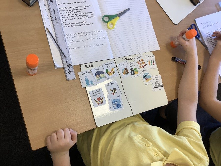 We also looked at the concept of “almsgiving” and what it means to give to those in need. The children compared wants and needs, linking this to the idea of generosity and helping others. A lively debate followed when the class discussed whether a pet is a want or a need, with some very passionate and well-reasoned arguments on both sides!