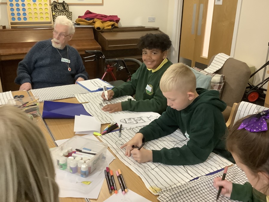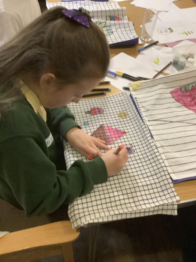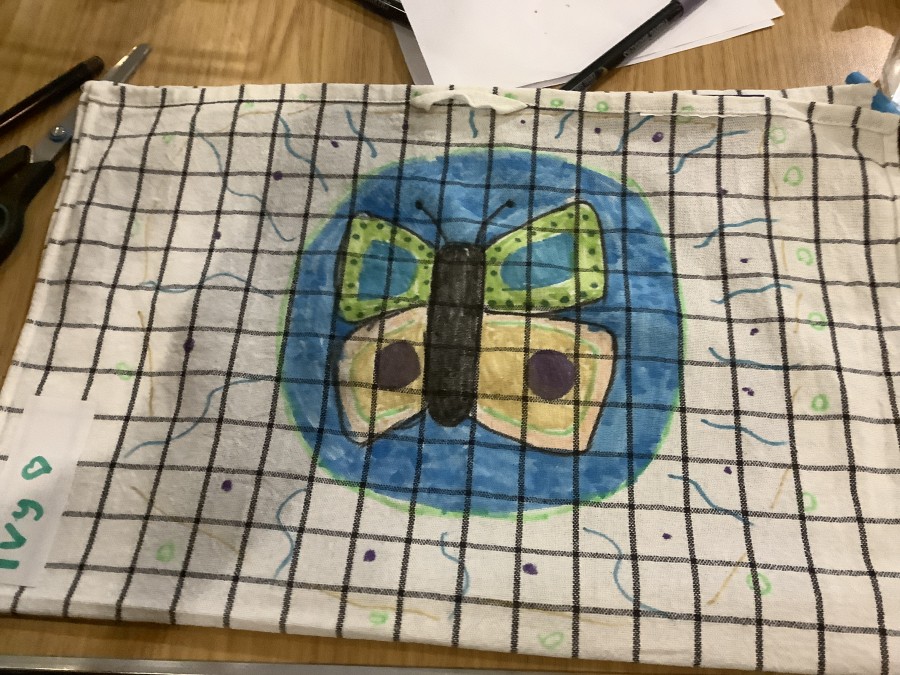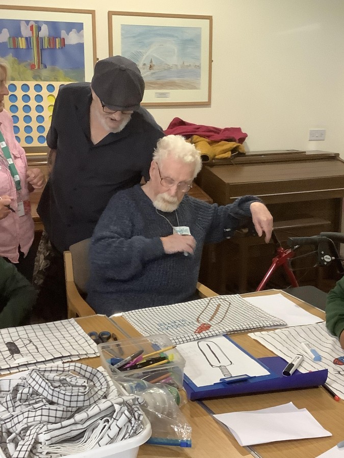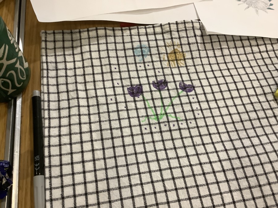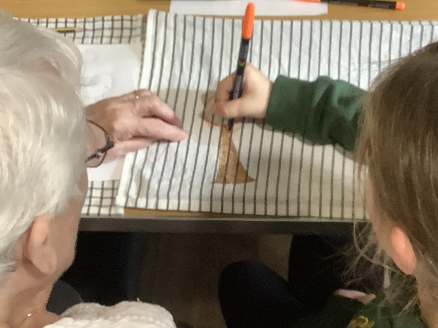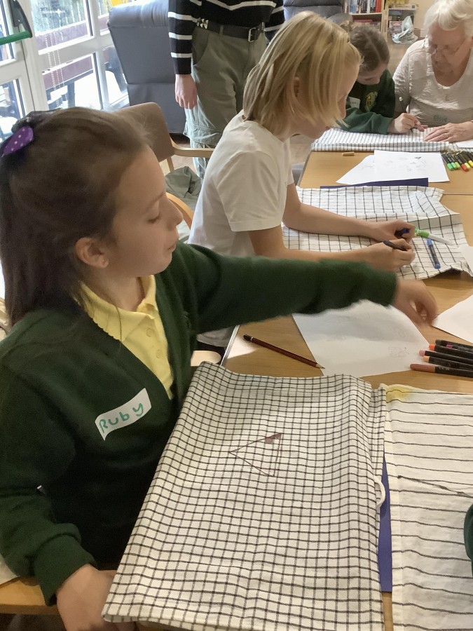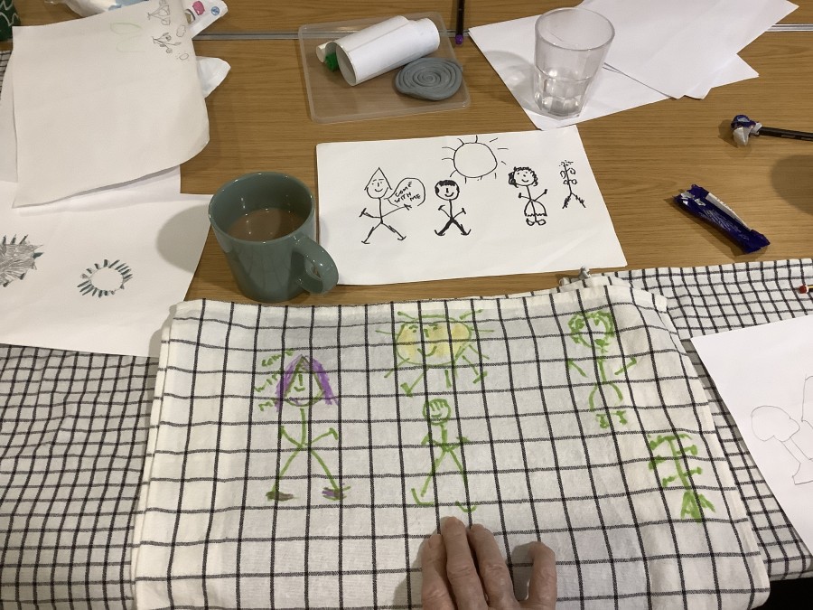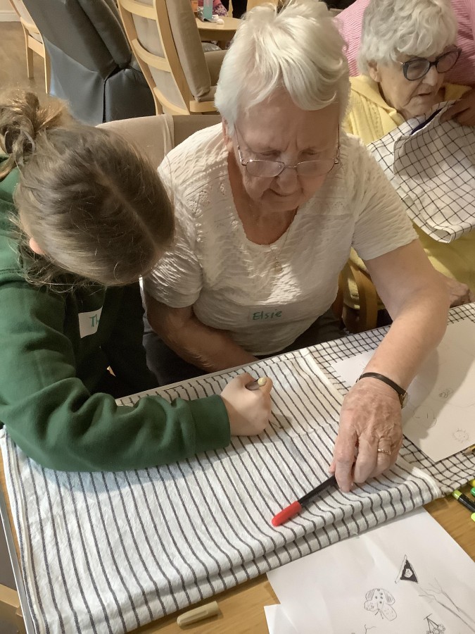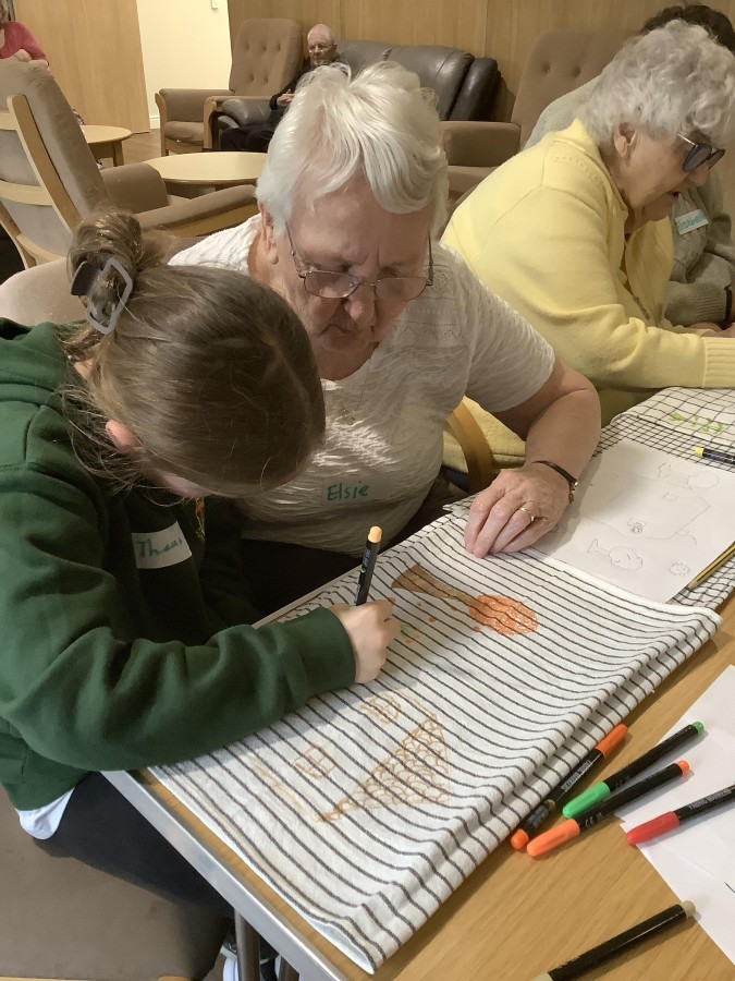 Over the last half term we have been taking part in a Music and Movement project as part of our Sports England fund. The plan this week was to design some bags for the equipment we’ve been using, so that it can be kept by the residents and stored in the community rooms. Bags for the juggling balls, the fans and feathers and the foot massagers, then some straps to hold the hoops together. They used tea towels as a base, handy because they are already hemmed. The children helped the residents to bring their ideas to life on paper first, then these images were transferred onto the material. The checks of the tea towels were really helpful to form a grid reference. Over half term the residents will sew the bags together ready for when the new equipment arrives.