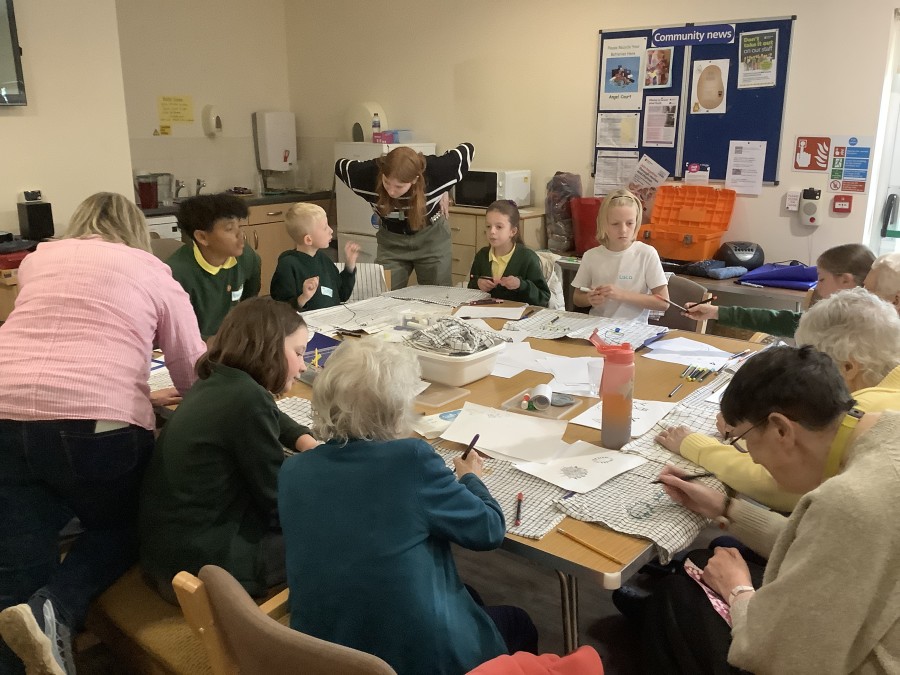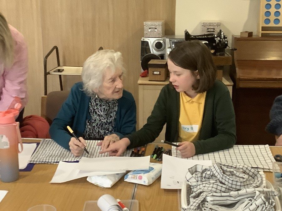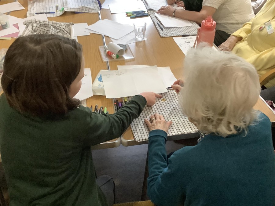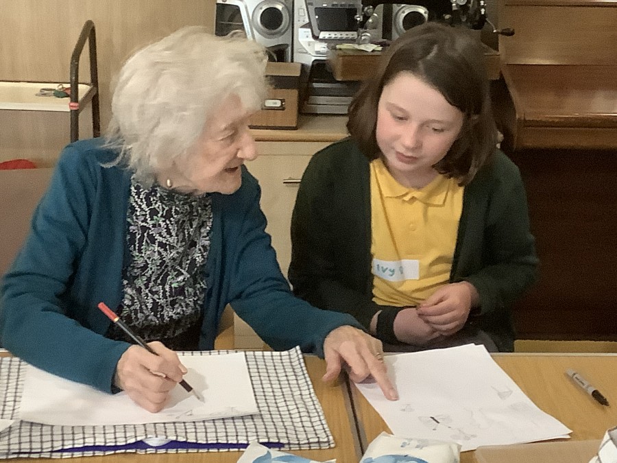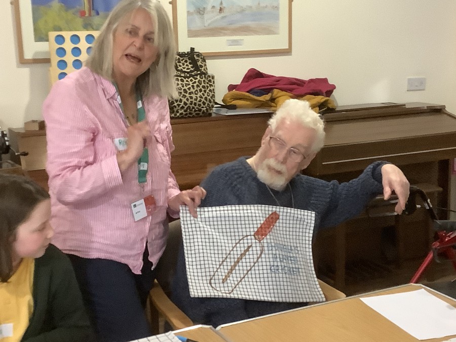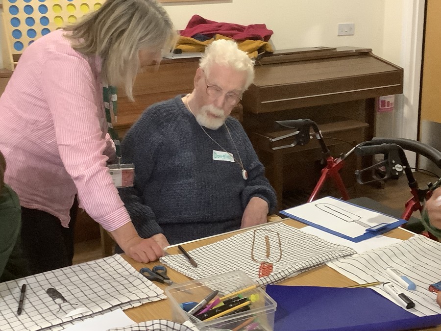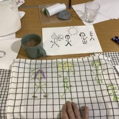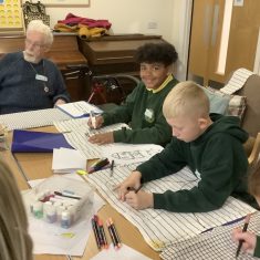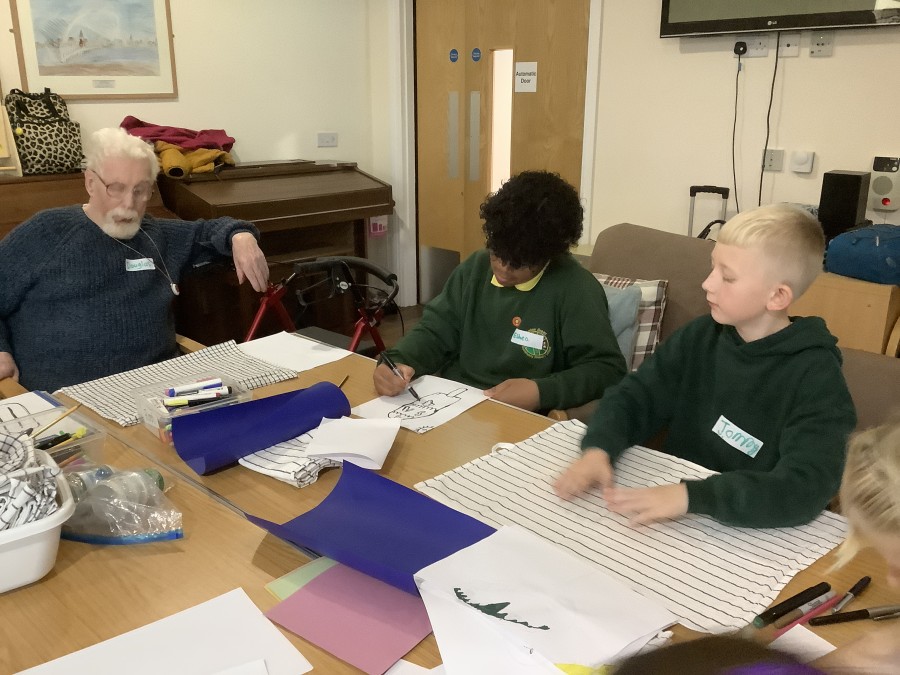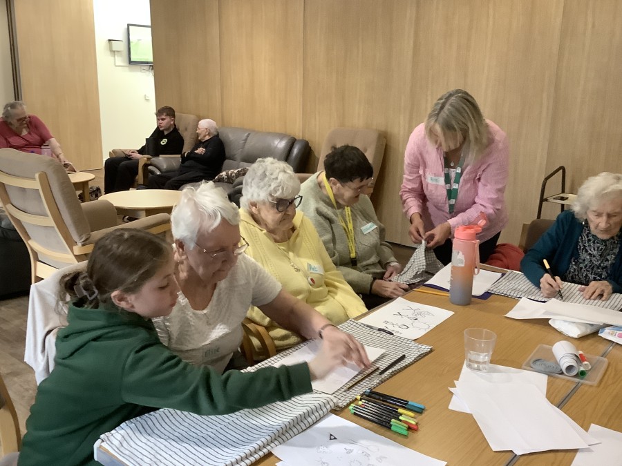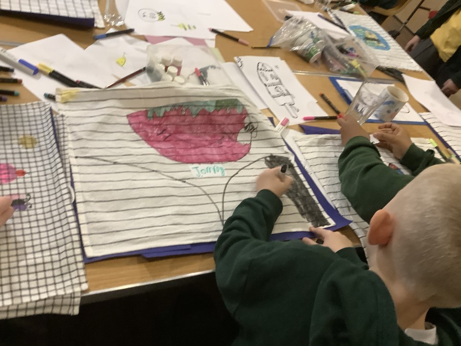 Over the last half term we have been taking part in a Music and Movement project as part of our Sports England fund. The plan this week was to design some bags for the equipment we’ve been using, so that it can be kept by the residents and stored in the community rooms. Bags for the juggling balls, the fans and feathers and the foot massagers, then some straps to hold the hoops together. They used tea towels as a base, handy because they are already hemmed. The children helped the residents to bring their ideas to life on paper first, then these images were transferred onto the material. The checks of the tea towels were really helpful to form a grid reference. Over half term the residents will sew the bags together ready for when the new equipment arrives.