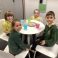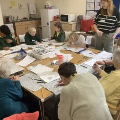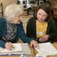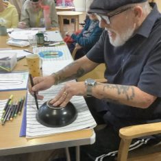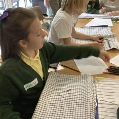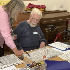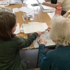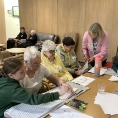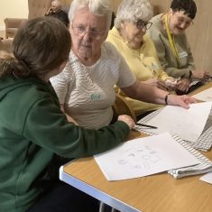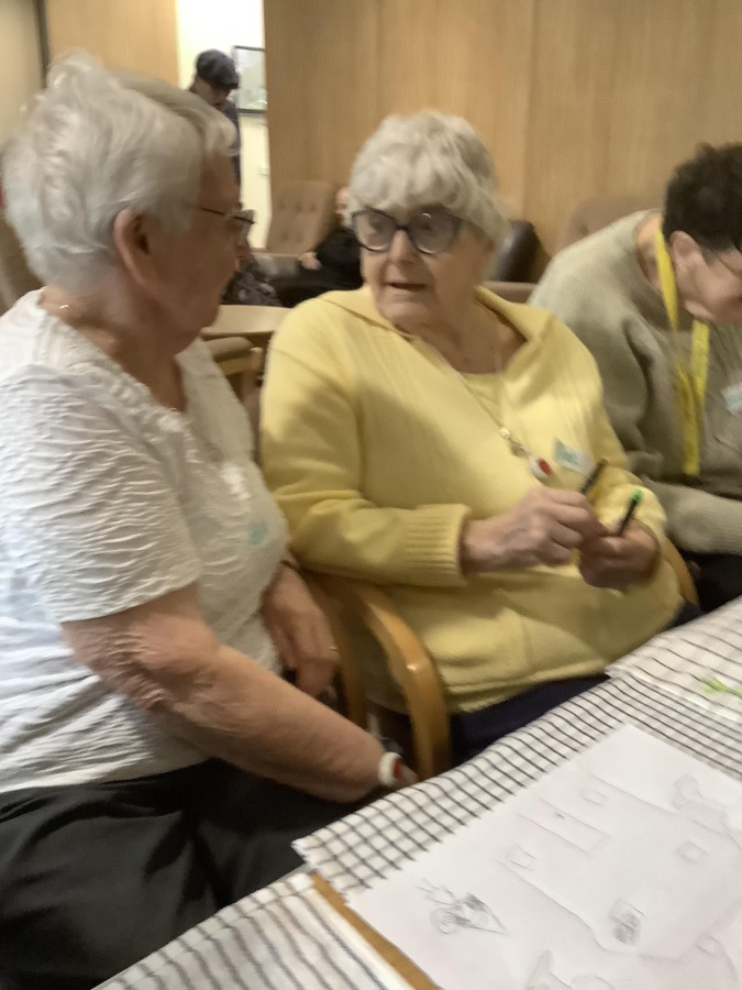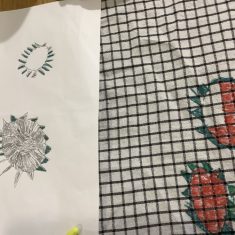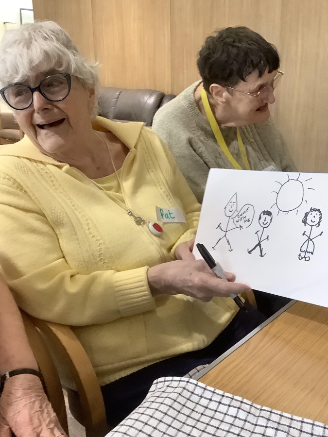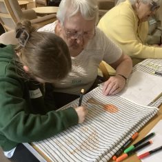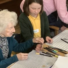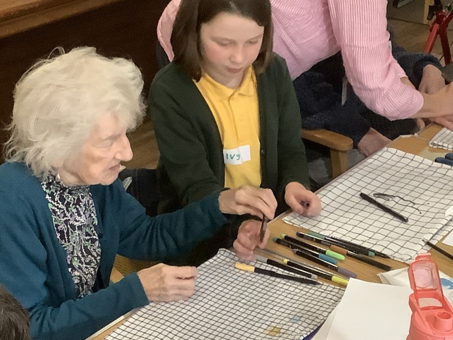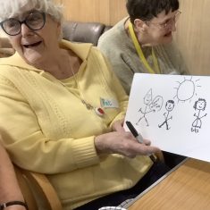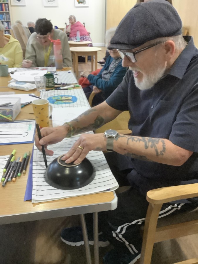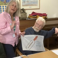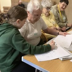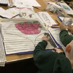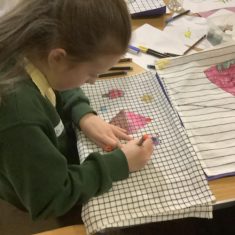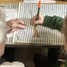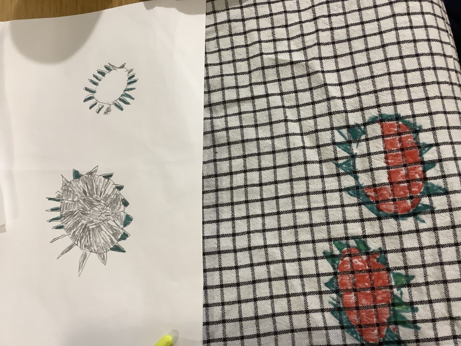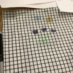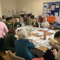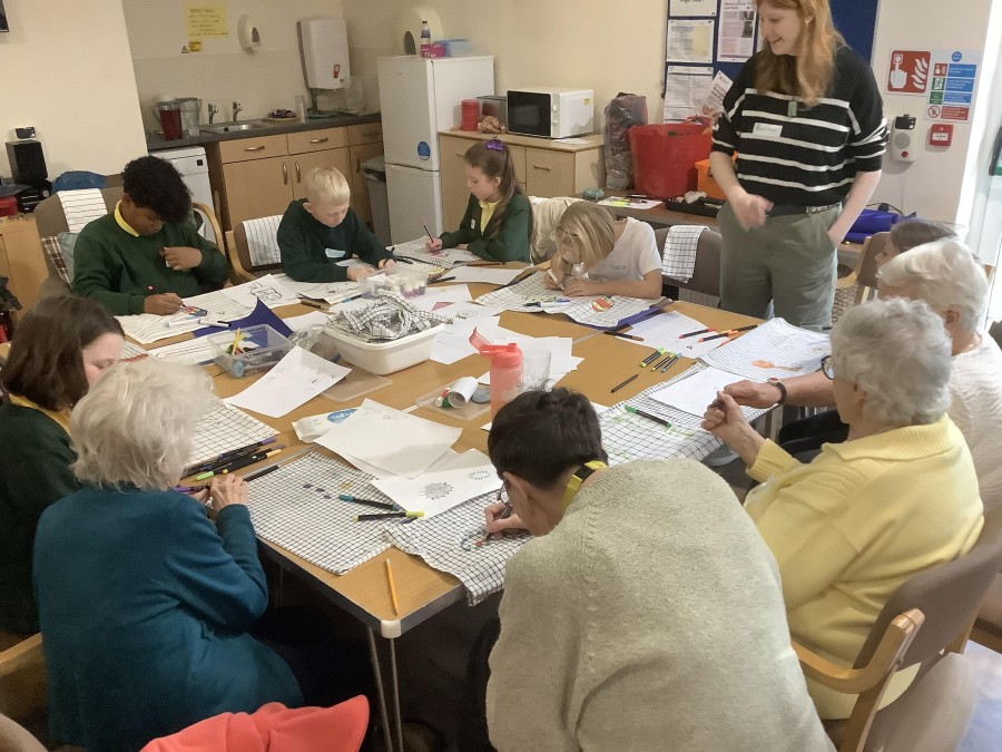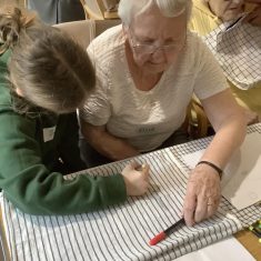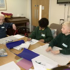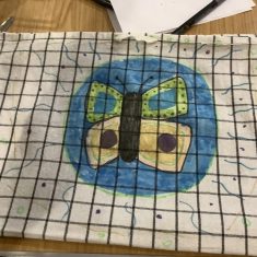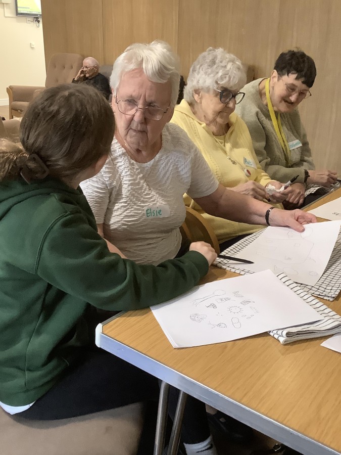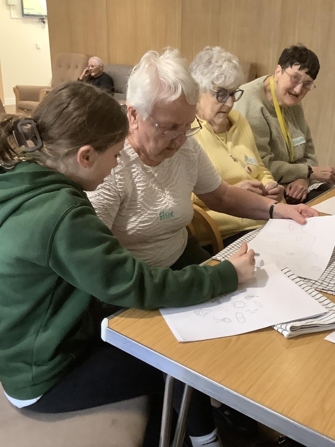 Over the last half term we have been taking part in a Music and Movement project as part of our Sports England fund. The plan this week was to design some bags for the equipment we’ve been using, so that it can be kept by the residents and stored in the community rooms. Bags for the juggling balls, the fans and feathers and the foot massagers, then some straps to hold the hoops together. They used tea towels as a base, handy because they are already hemmed. The children helped the residents to bring their ideas to life on paper first, then these images were transferred onto the material. The checks of the tea towels were really helpful to form a grid reference. Over half term the residents will sew the bags together ready for when the new equipment arrives.