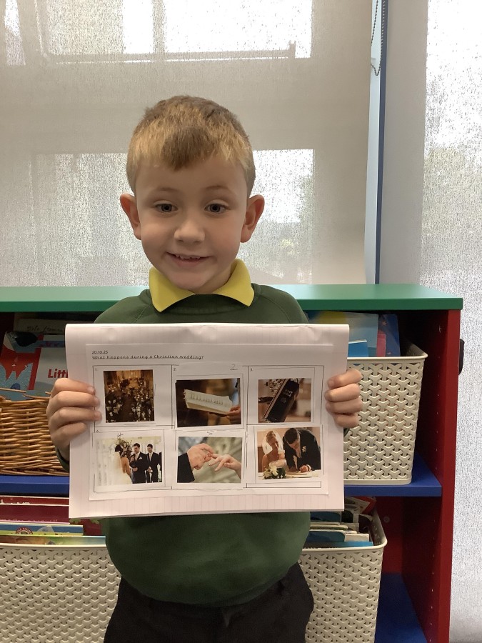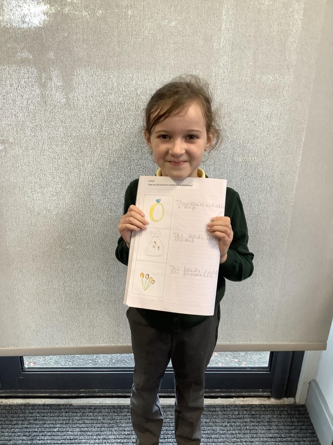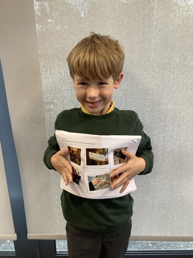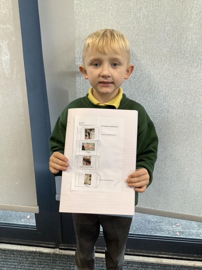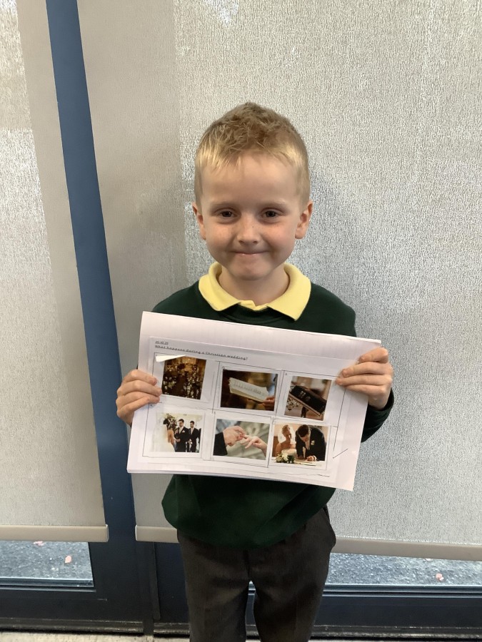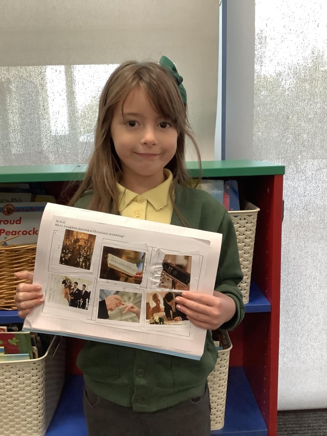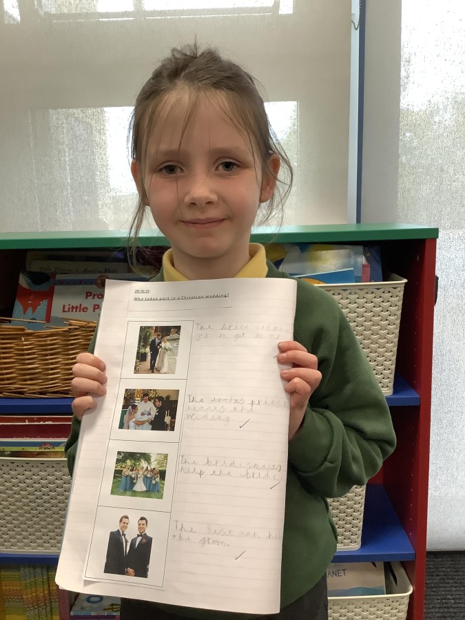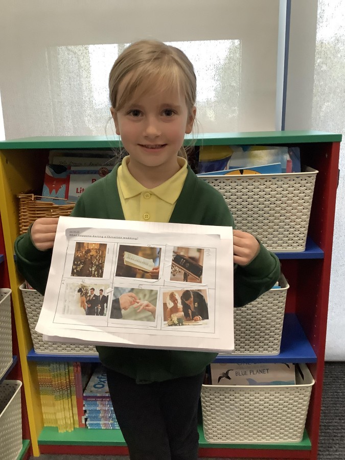 Following this, the children looked more closely at a Christian wedding. They identified the different people who take part and the roles they play. Did you know that Christians sing special songs called hymns during a wedding? The class also learnt about the sequence of events in a Christian wedding and demonstrated their understanding by putting pictures in the correct order.