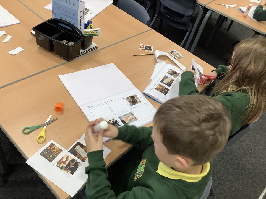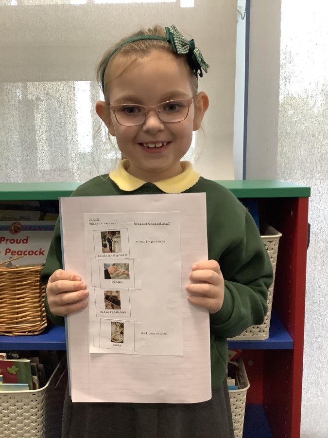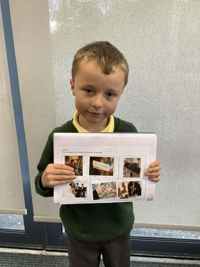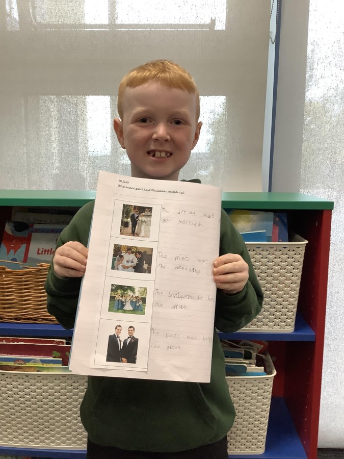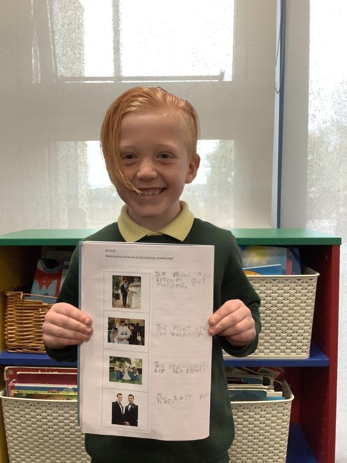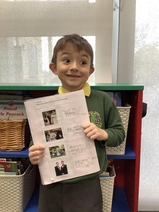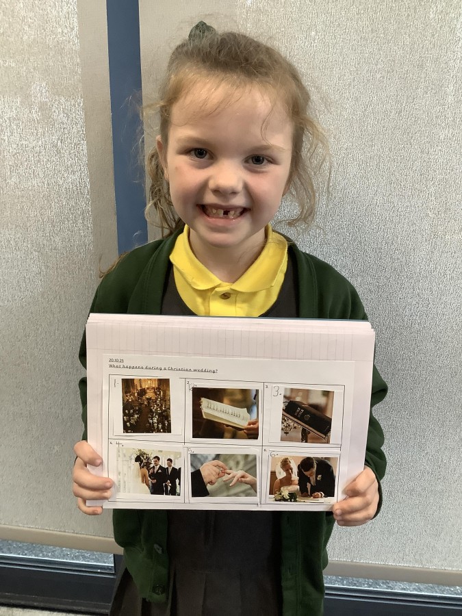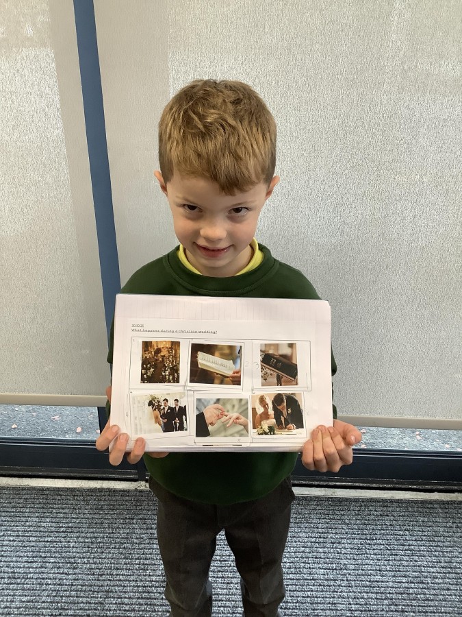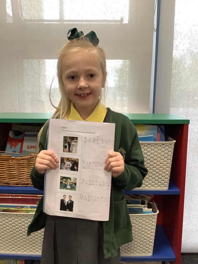 Following this, the children looked more closely at a Christian wedding. They identified the different people who take part and the roles they play. Did you know that Christians sing special songs called hymns during a wedding? The class also learnt about the sequence of events in a Christian wedding and demonstrated their understanding by putting pictures in the correct order.