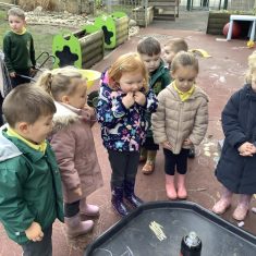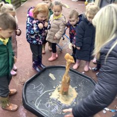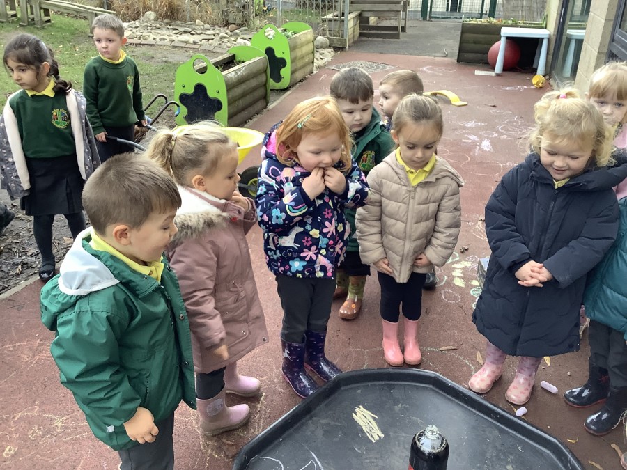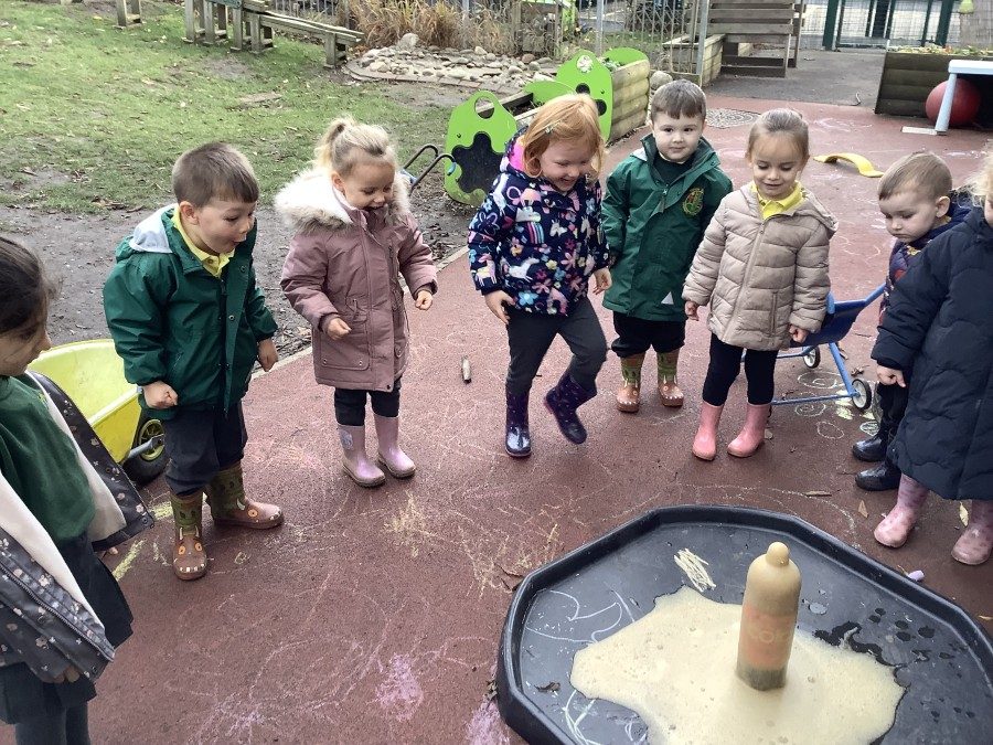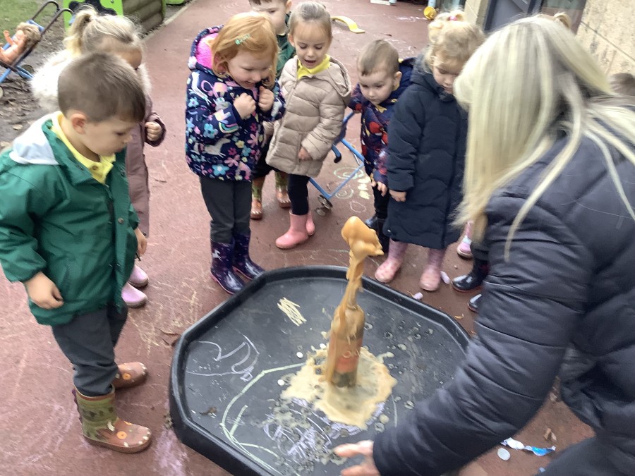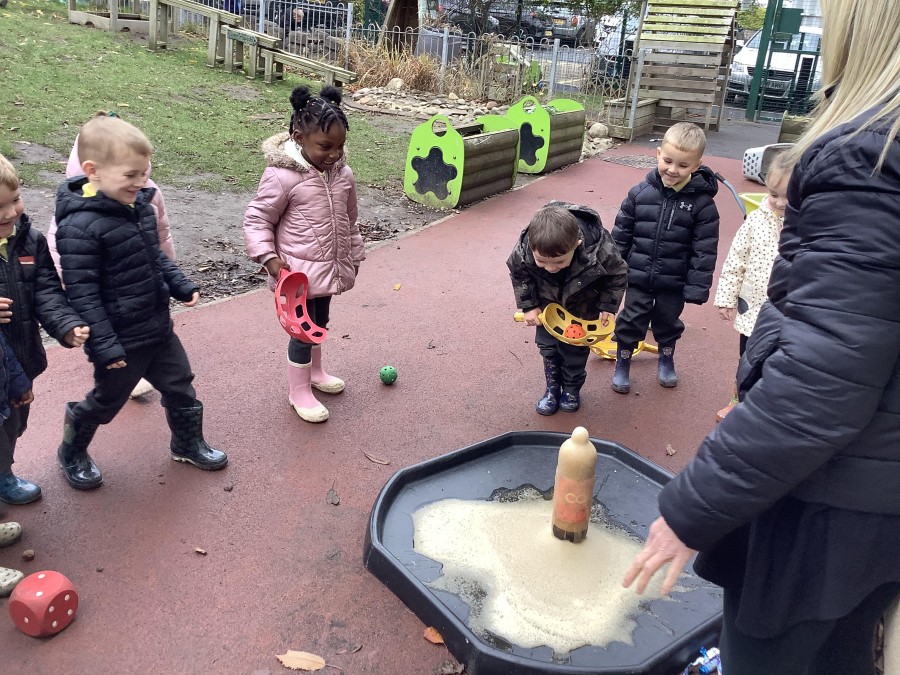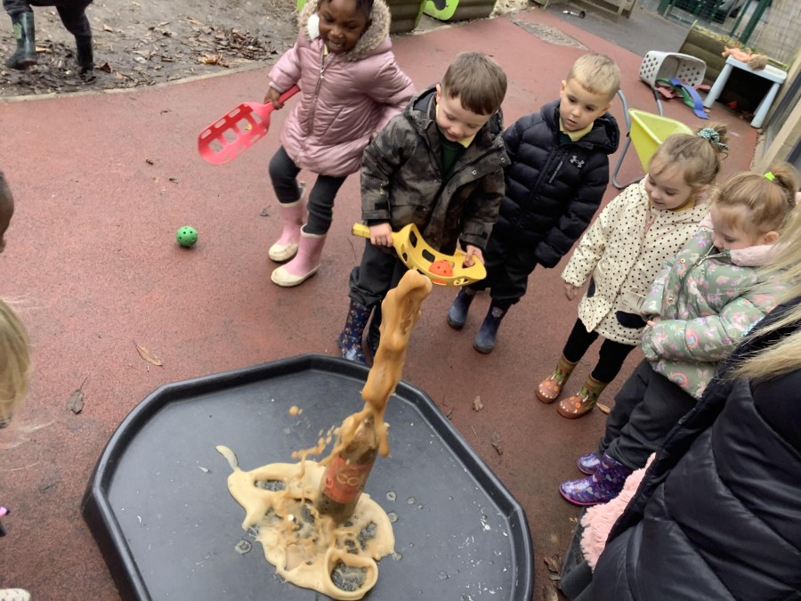 To recreate the gunpowder theme Nursery took part in a science experiment today using fizzy pop and Mentos. We dropped the mentos into the pop and watched the fizz explode into the air. We got such a shock but had so much fun!