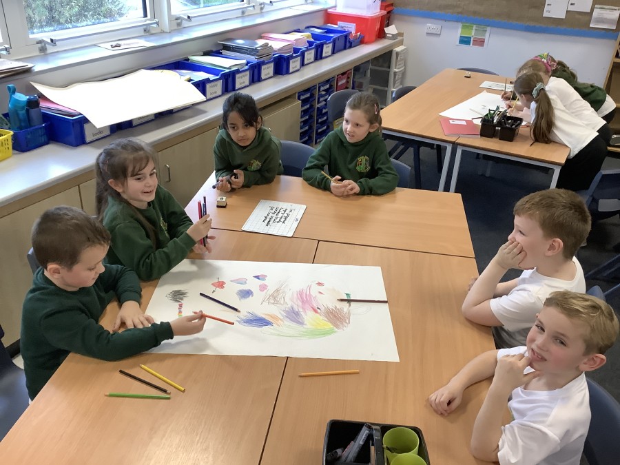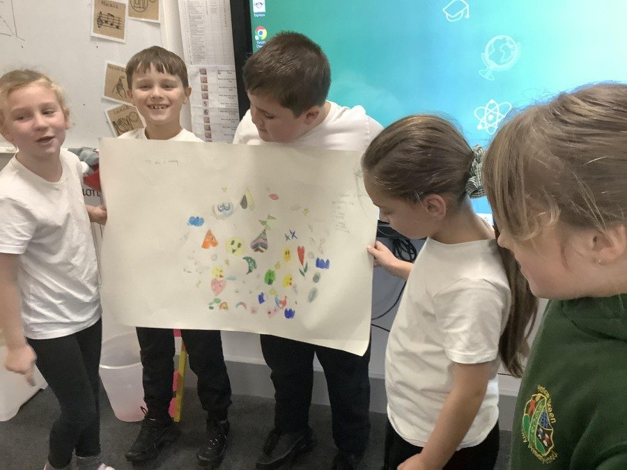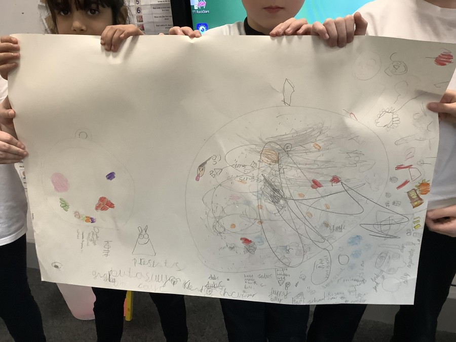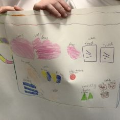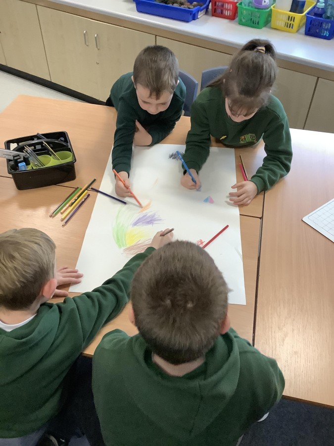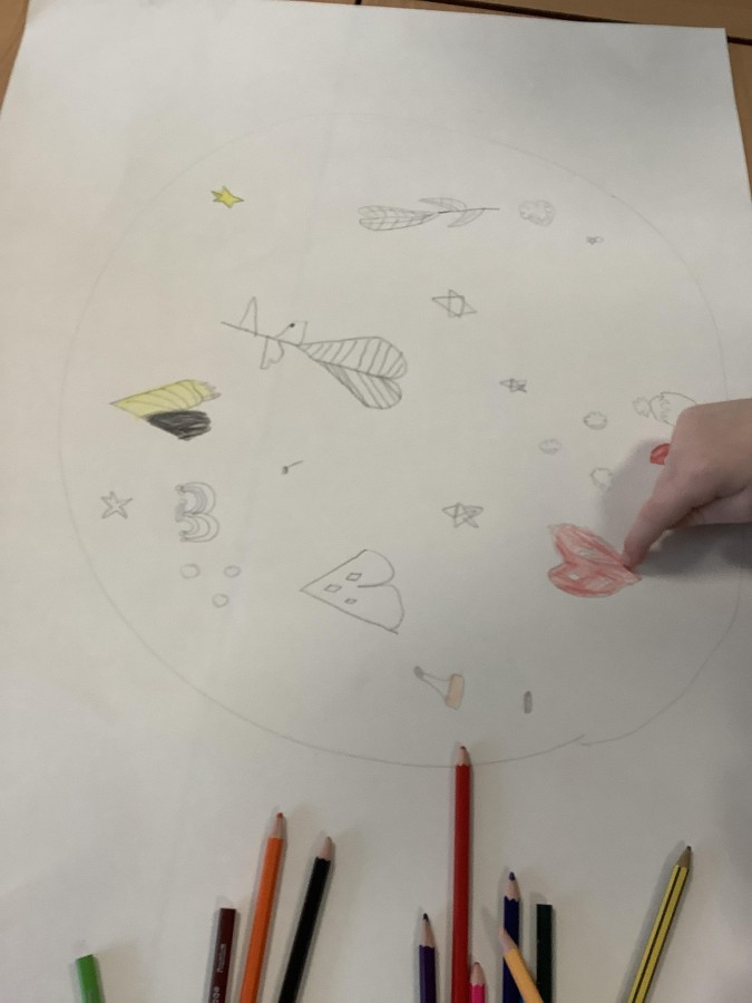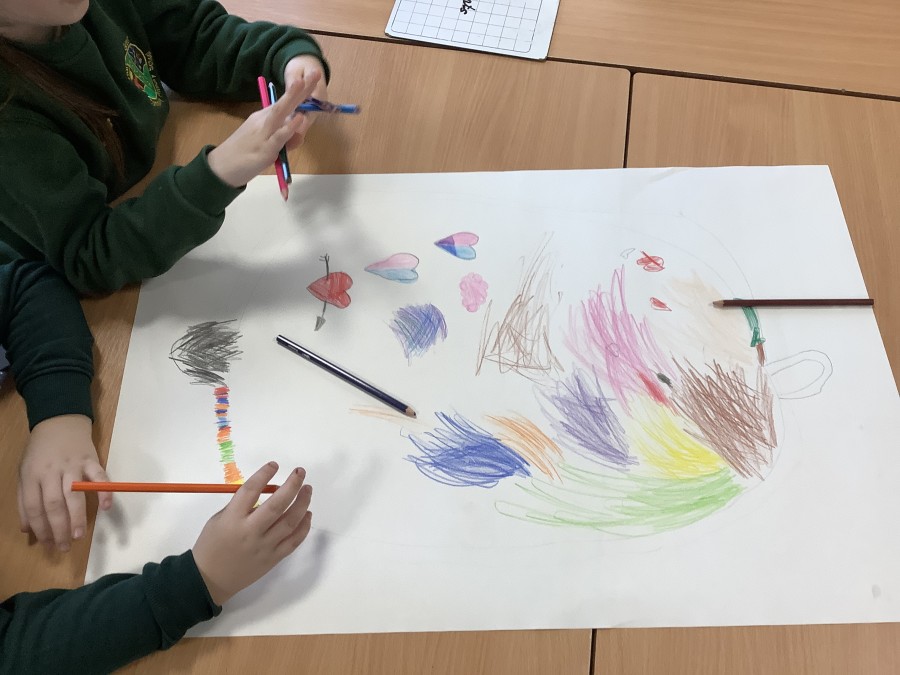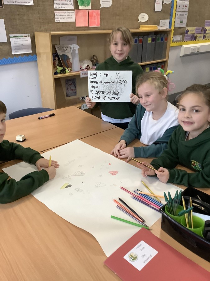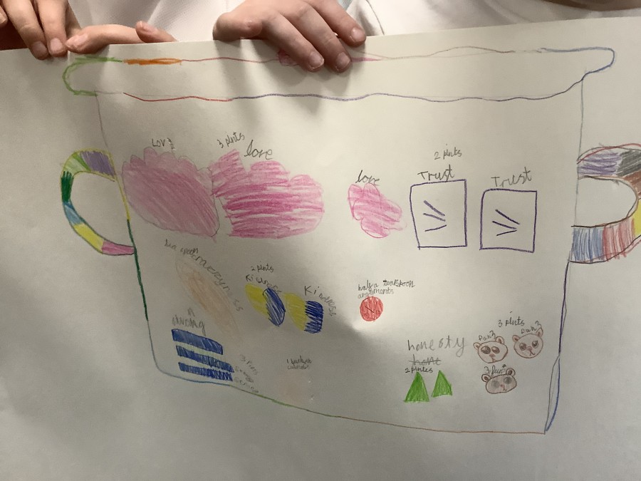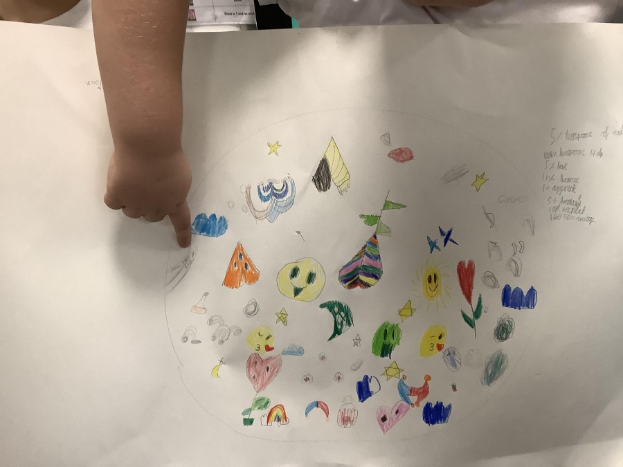 They then had to create their own recipe for friendship. Thinking carefully about what quantities they would need to get the right balance. Everyone on the team had to agree so that meant some discussion and negotiation. Once they had formulated their recipe they then had to draw it out deciding what shapes and colours they would use for each characteristic. Usually this is done outside using natural materials and some children used textures that related to things like pine cones, shiny leaves, fluffy seed pods etc. Others used emojis which made a really vivid design. One team decided to use a rainbow of colours to make their pan to represent all the wonderful things that friendship means to them, this really brought their design together.