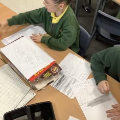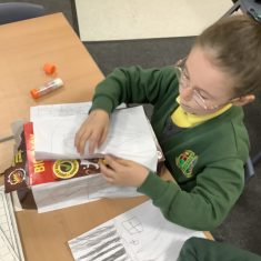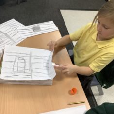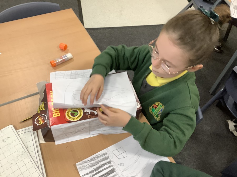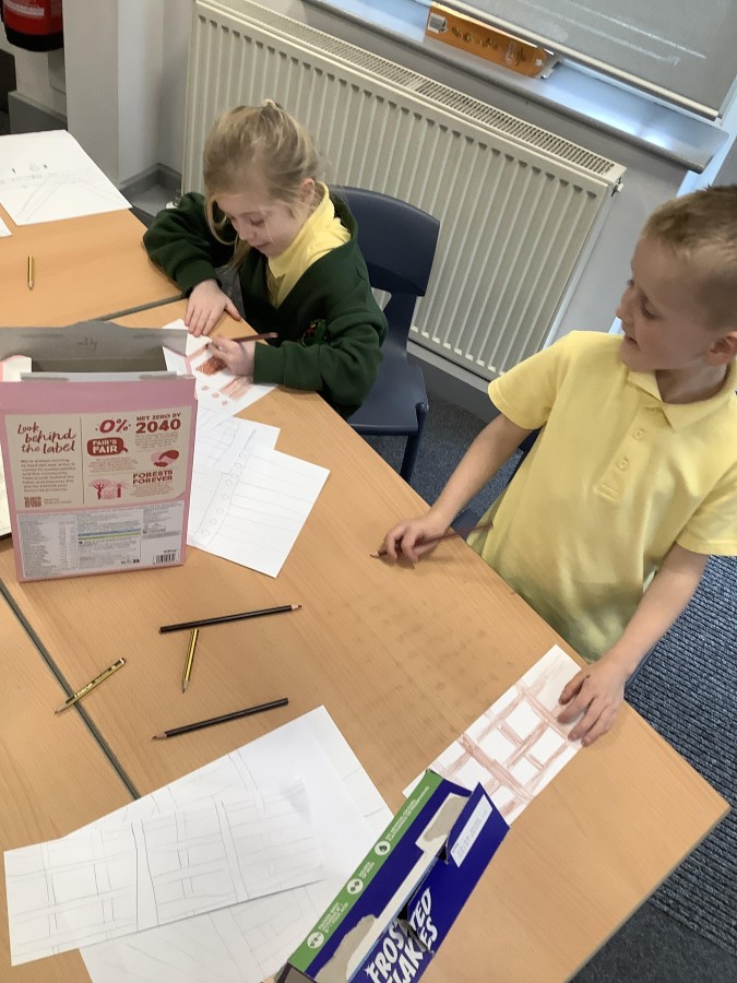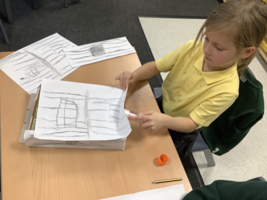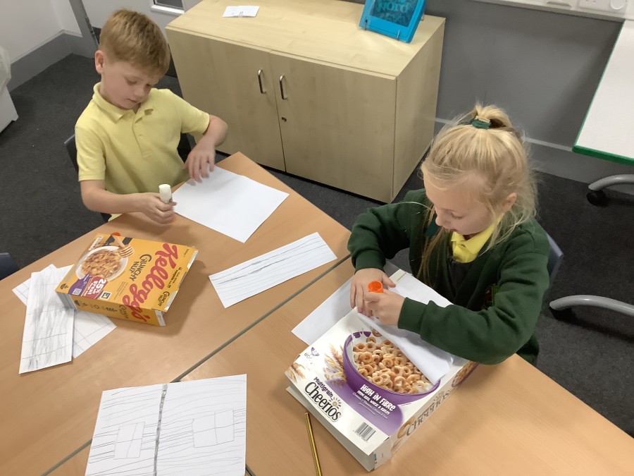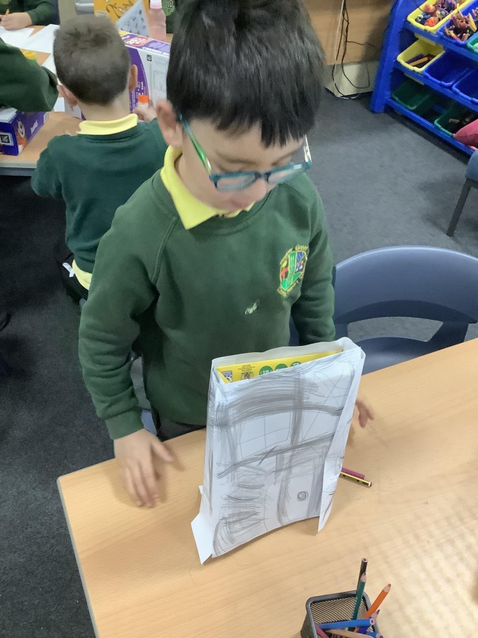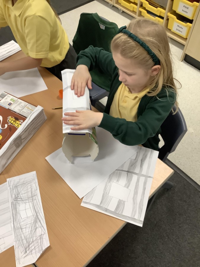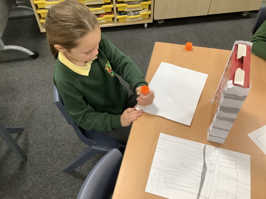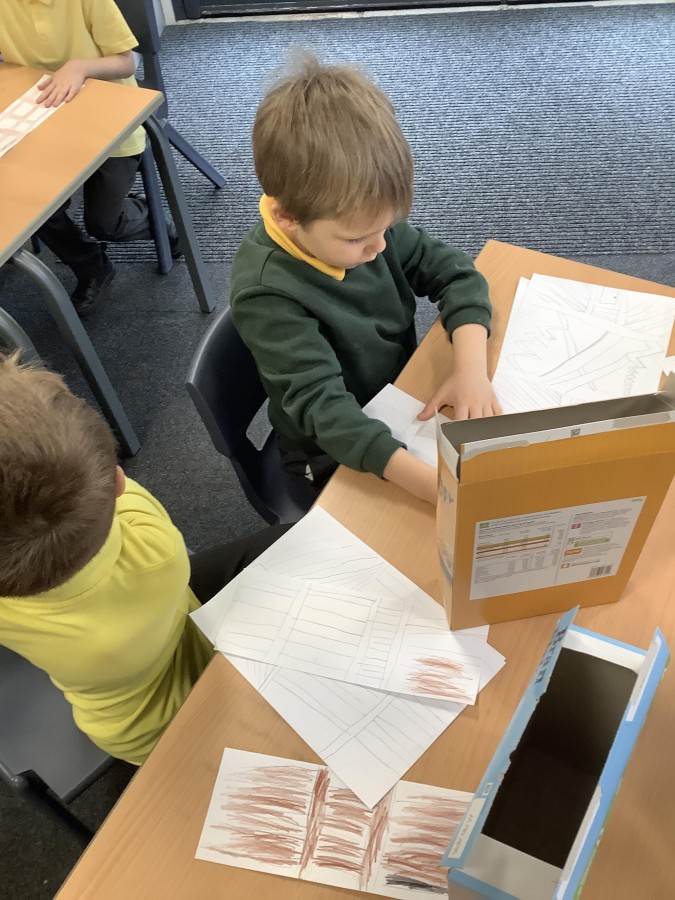 To launch the book, the children explored what houses were like in London at that time. They studied images of old buildings and noticed that many were made of wood and straw. They then created their own interpretations by sketching designs on paper and attaching them to old cereal boxes. These model houses were arranged on the school field to represent a London street in 1666. One end of the ‘street’ was set alight, and the children observed how easily the fire spread. They discovered that, because the houses were so close together, the flames travelled quickly from one building to the next.