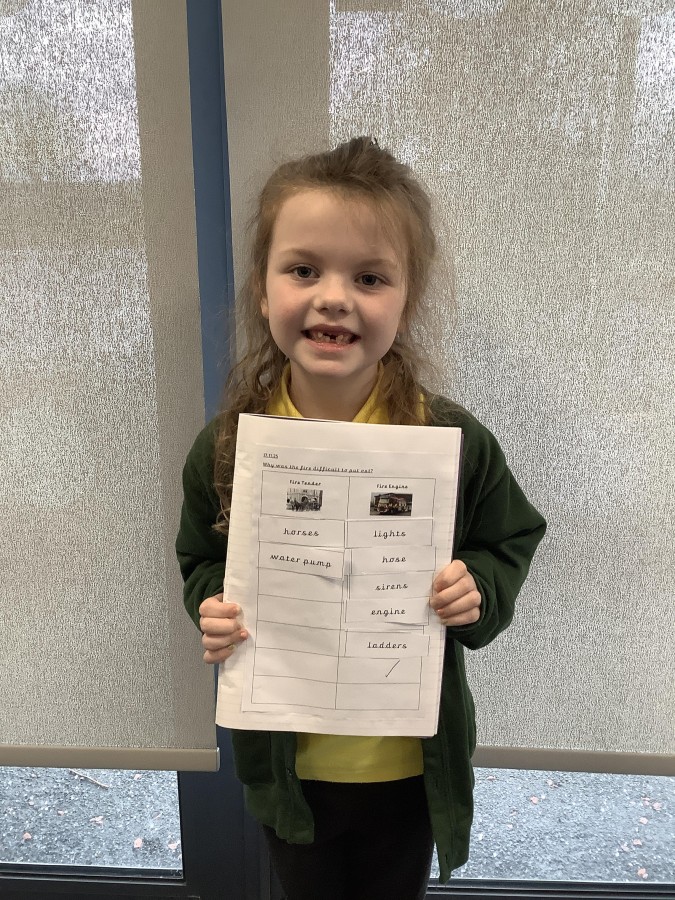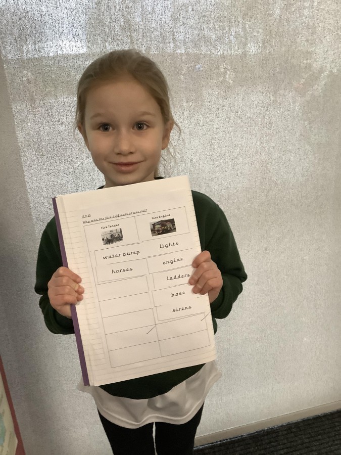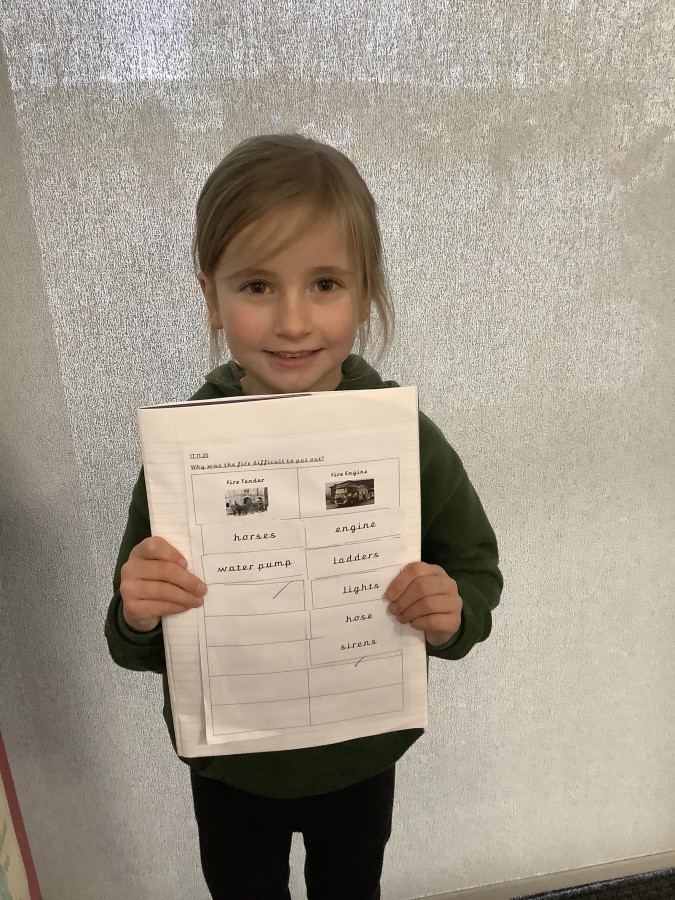 Next, the children compared Victorian fire tenders with modern-day fire engines to understand why the fire was so difficult to extinguish. They realised that today’s fire engines are far better equipped to deal with fires quickly and effectively. The children were able to identify many useful features, including sirens, a hose, and an engine.