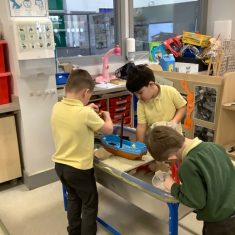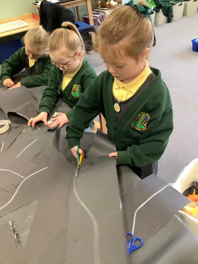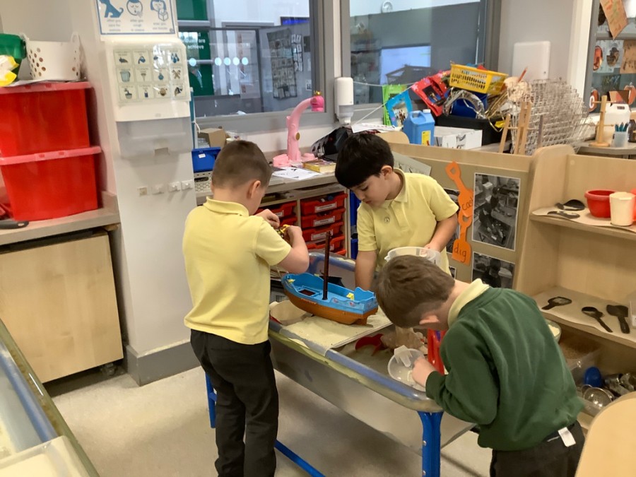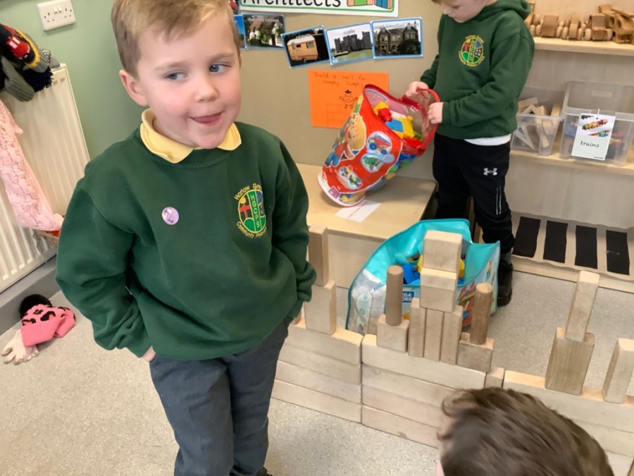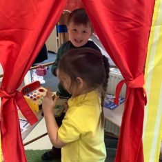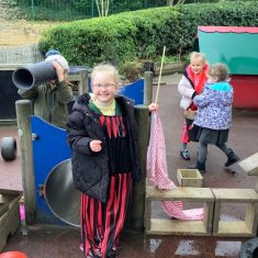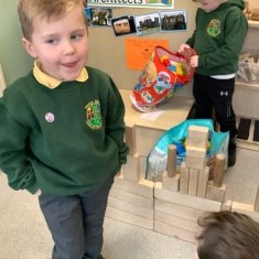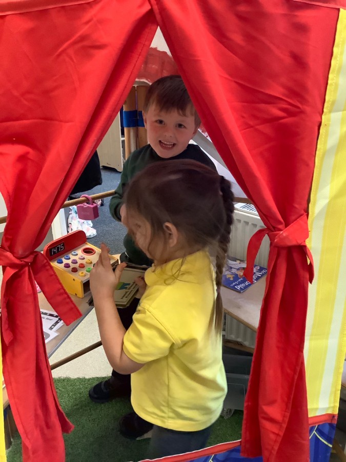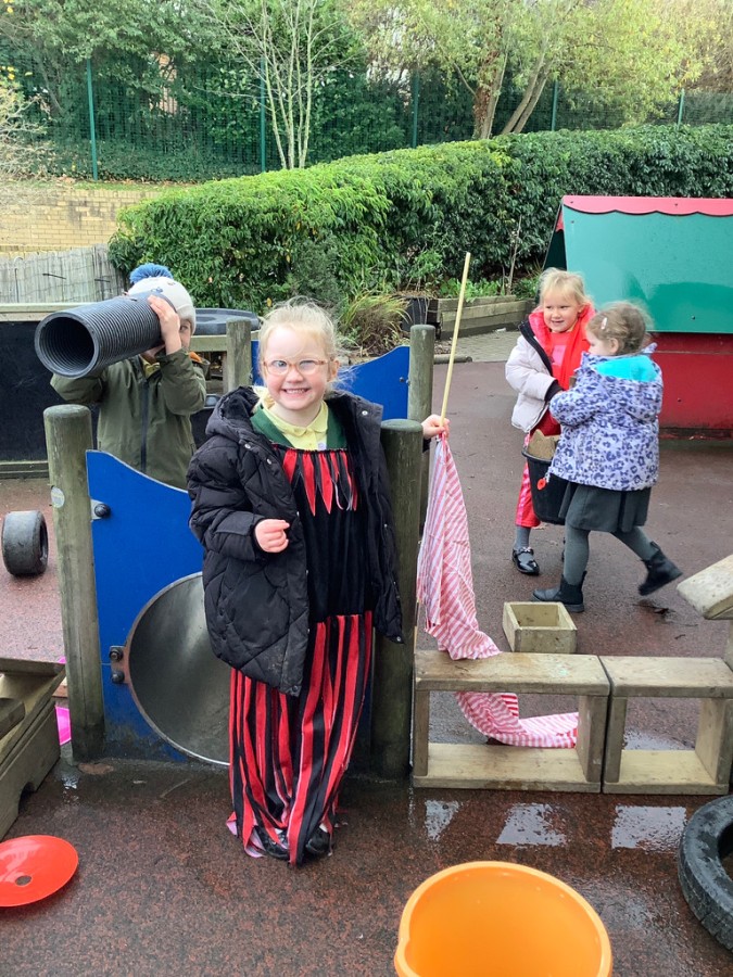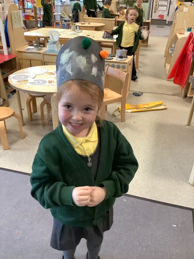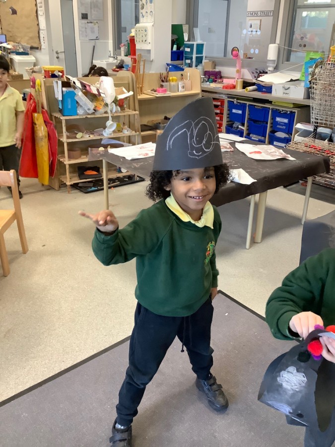 Throughout the week the children took part in a range of creative, hands-on activities linked to each rhyme. Our pirate-themed learning for When I Was One was especially popular: the children counted gold coins, drew their own treasure maps, used scissors carefully to cut out pirate hats, and even built large pirate ships outside in the construction area. For Humpty Dumpty, we worked together to build walls and used our cutting skills to make paper bricks and egg shapes, creating colourful Humpty Dumpty pictures to display in class. The role play area became our very own Nursery Rhyme Theatre, where the children acted out their favourite rhymes using props, puppets, and lots of imagination. They also enjoyed experimenting with body percussion for I Hear Thunder and exploring storytelling and number skills through Sing a Song of Sixpence.