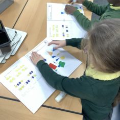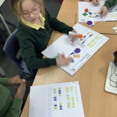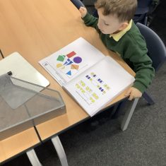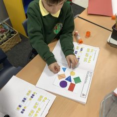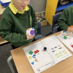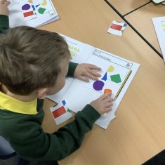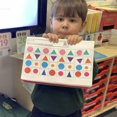 Later in the week we investigated shapes in real life and we sorted and grouped pictures of shapes.  The children also had the opportunity to investigate repeating shape patterns and had to choose the correct shapes to complete them.