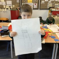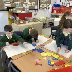 First, we learnt the names of some shapes – circle, square, triangle and rectangle.  We then used these shapes to draw a shape picture.  We were extremely creative.  A shape robot, a train and a castle were amongst the ideas.