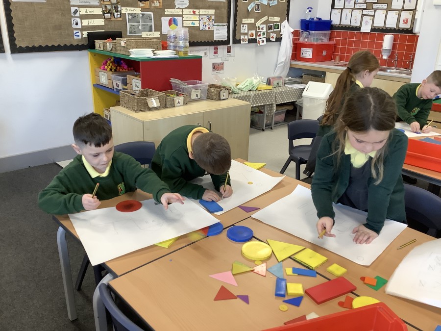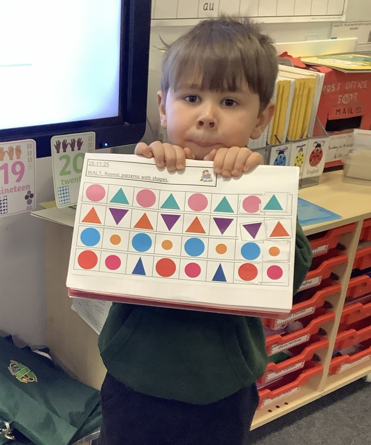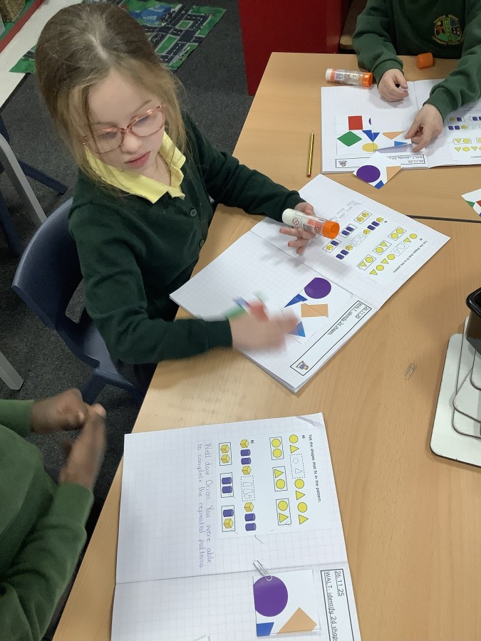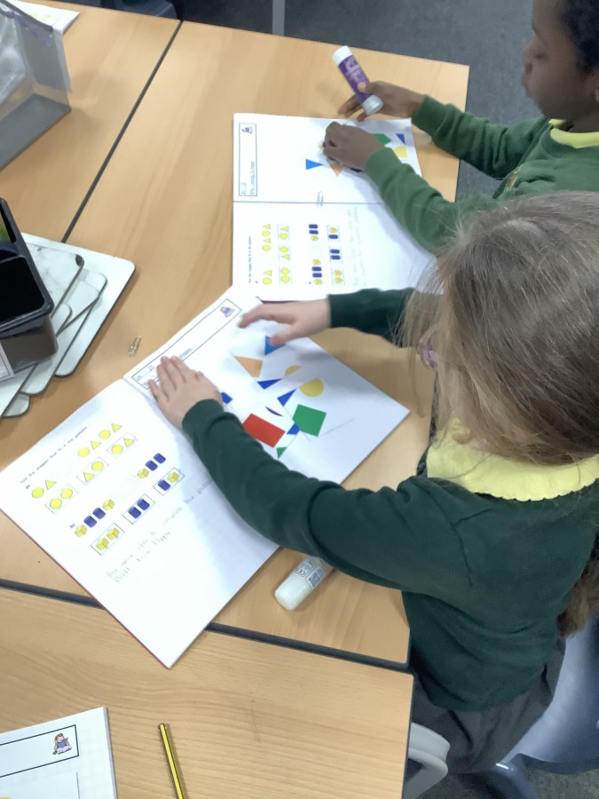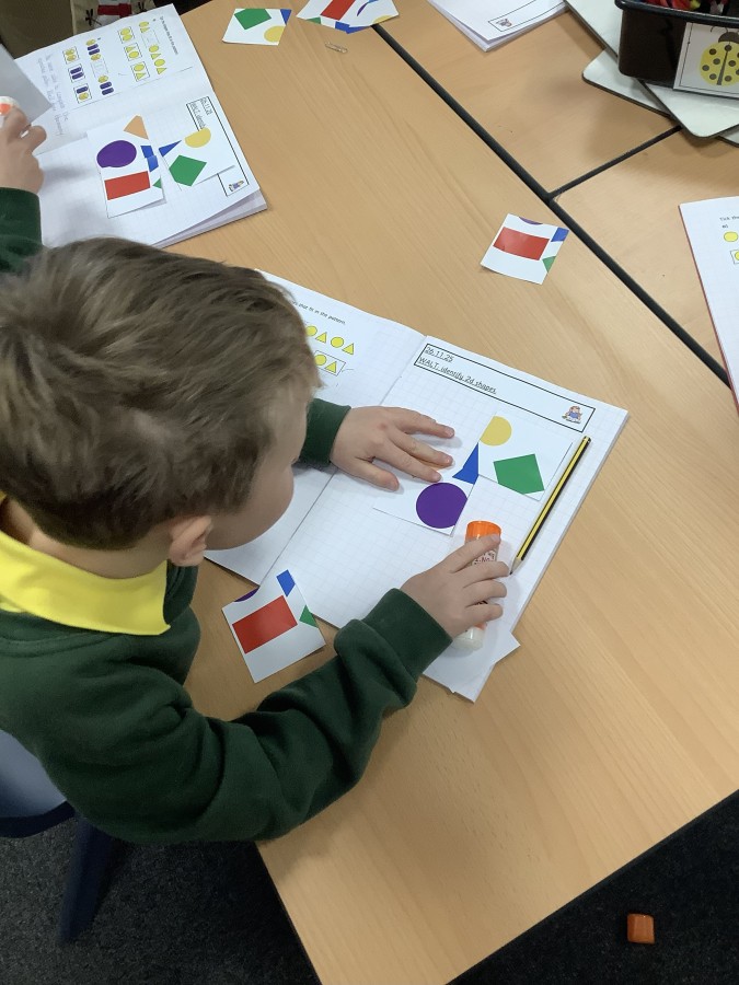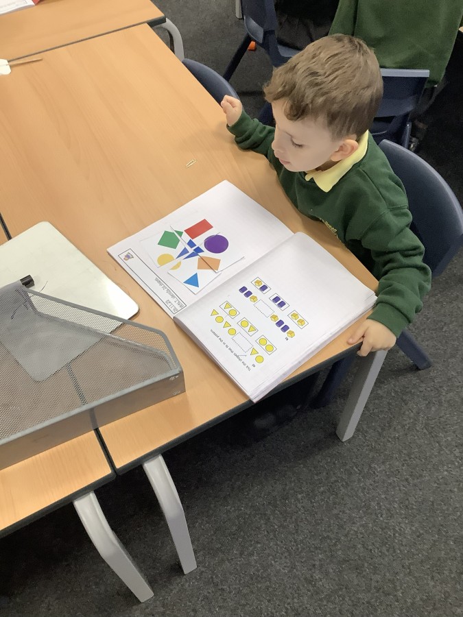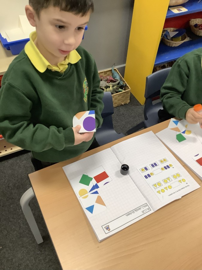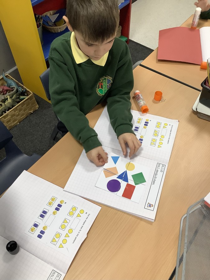 Later in the week we investigated shapes in real life and we sorted and grouped pictures of shapes.  The children also had the opportunity to investigate repeating shape patterns and had to choose the correct shapes to complete them.