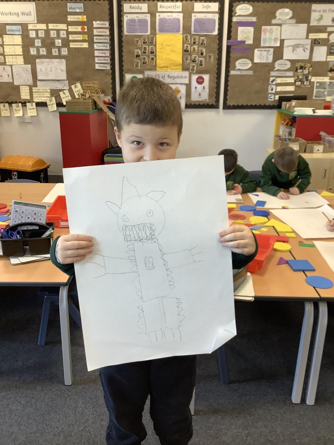 First, we learnt the names of some shapes – circle, square, triangle and rectangle.  We then used these shapes to draw a shape picture.  We were extremely creative.  A shape robot, a train and a castle were amongst the ideas.