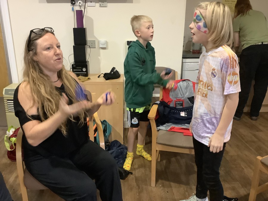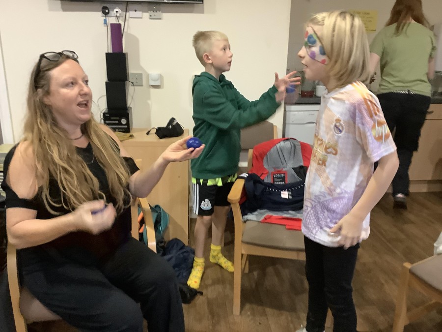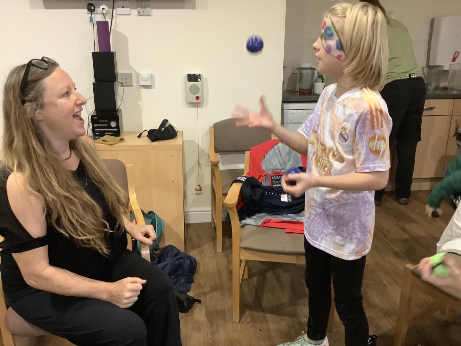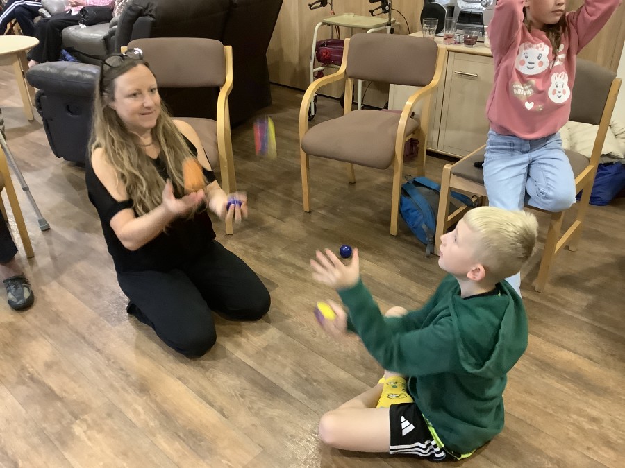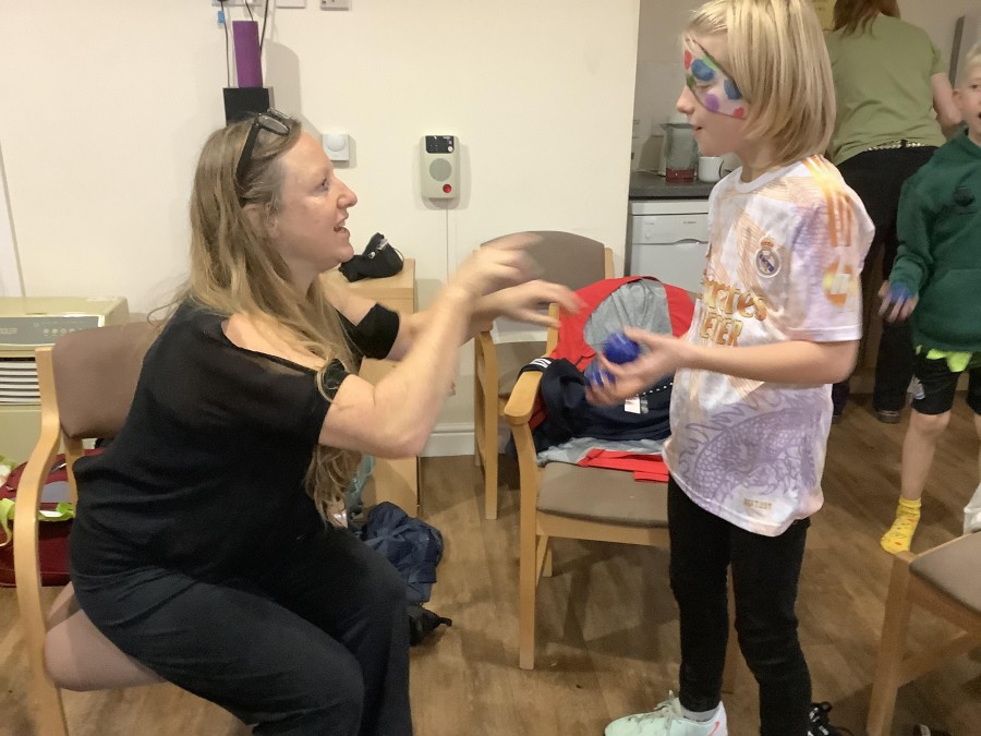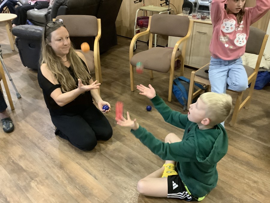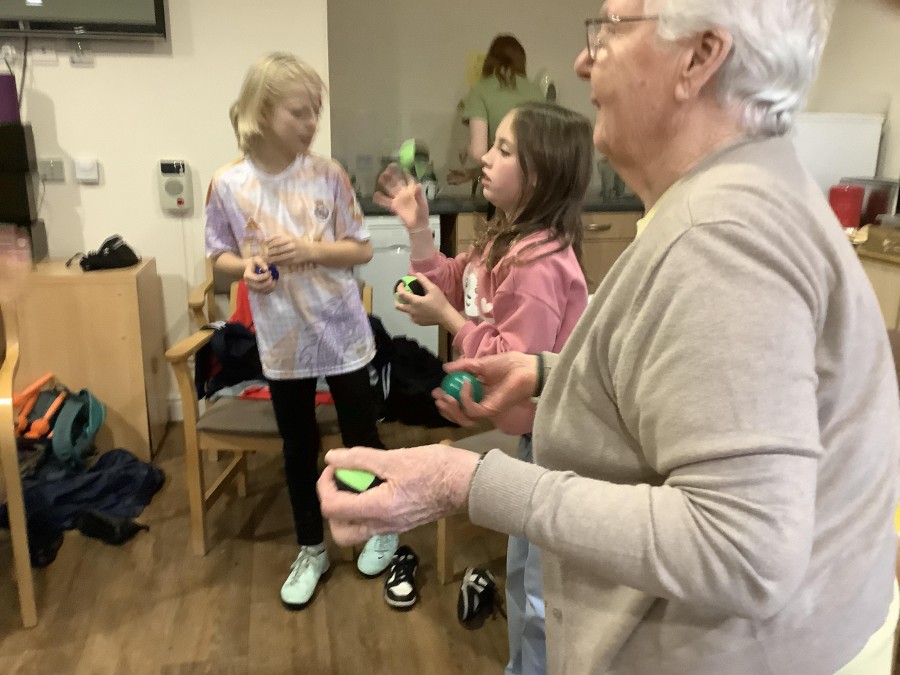 As part of a Sports England Project we are working with our friends, the residents of Angel Court, in physical workshops. These incorporate strength building and movement to increase flexibility, balance, confidence and social connections for health and wellbeing. We have seen firsthand the impact that grief and long-term health conditions can have on people’s physical mobility and their willingness to want to come down to the lounge and join others. But equally we know the difference taking part in regular, meaningful workshops can have in encouraging people back to a social activity. The children are so happy to support the group to help them to engage in accessible movement and physical activities together, sharing ideas and having a sense of working fun.