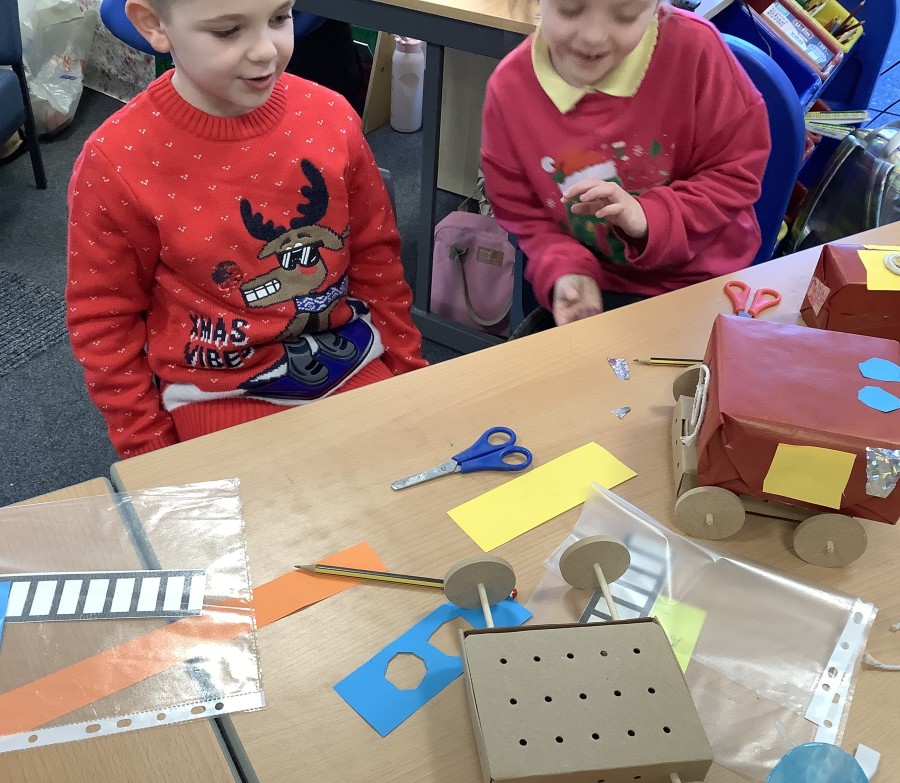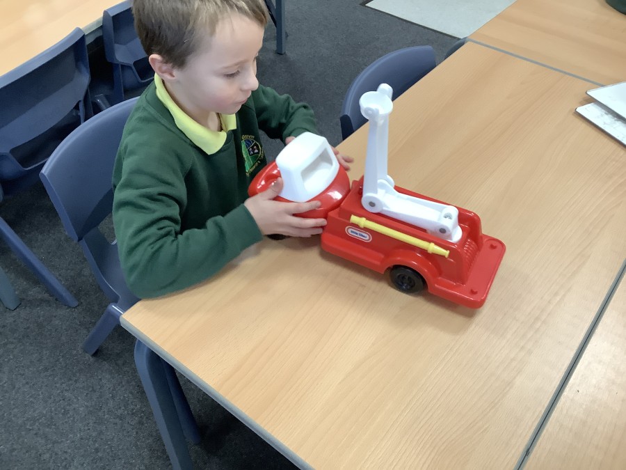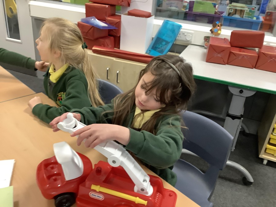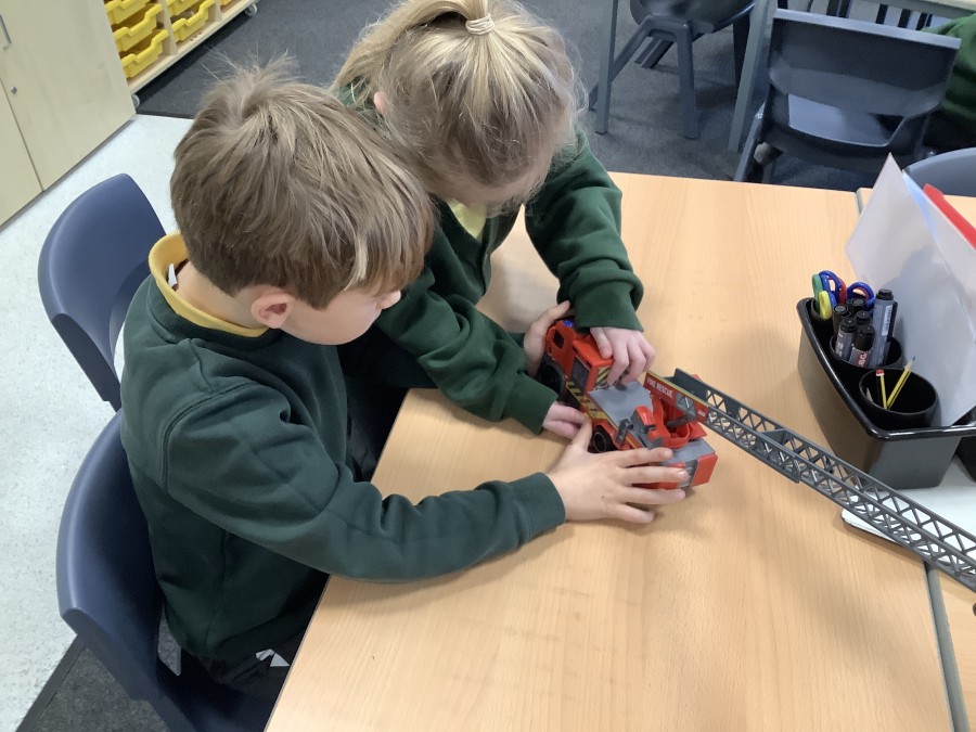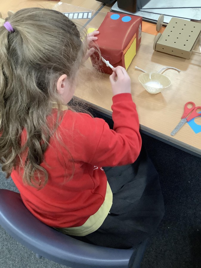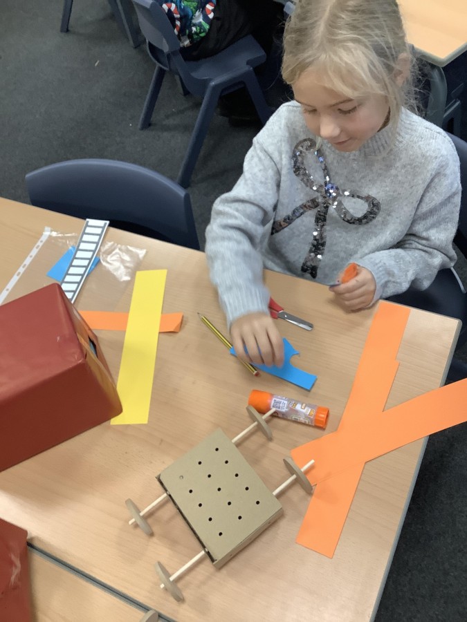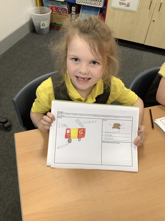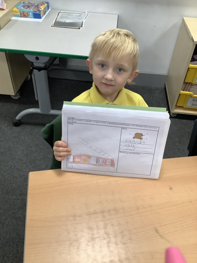 The children in Year 2 have been working hard to design and make their own fire engines. Firstly, they looked at some toy fire engines and talked about the features, describing which ones they liked and also providing reasons why. They enjoyed drawing their own engines and labelling features such as the ladder, wheels, hose and light. They also found out about specific parts that help the vehicle to move, in particular the chassis and the axle. The children were given their own cardboard chassis to build into a cuboid and then they attached two wooden axles and four wheels. Then, there was an opportunity to get creative to add the hose, windows and lights using glue, scissors and different coloured paper. Finally, the boys and girls added a wind up mechanism using a short length of doweling and some string to make the ladder move up and down. Well done!