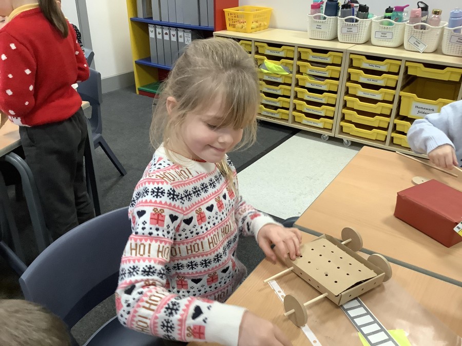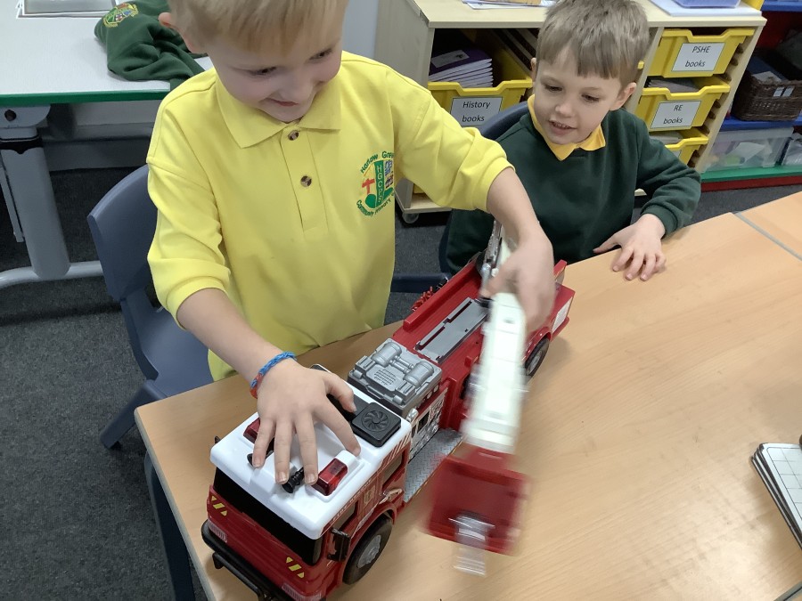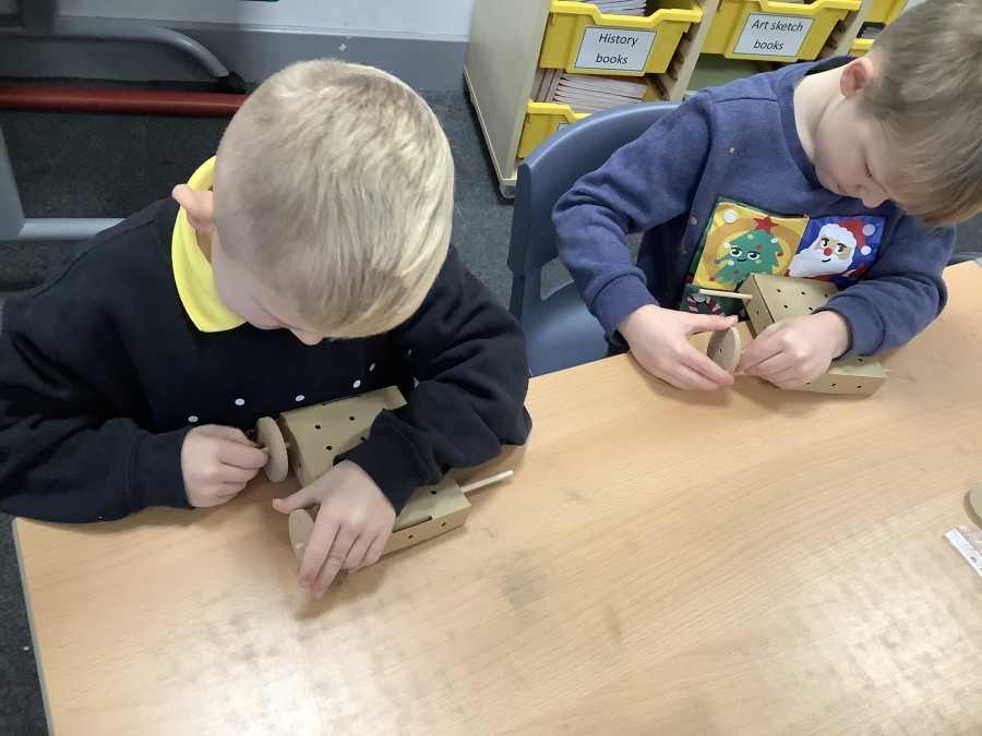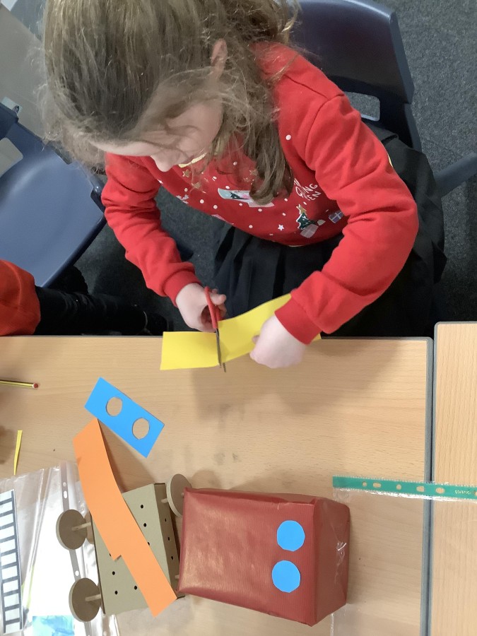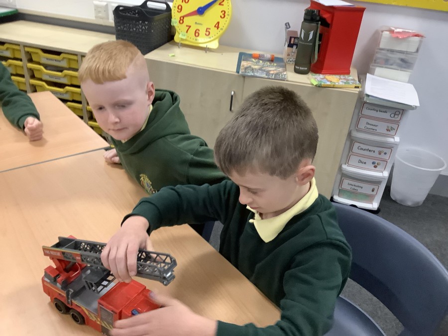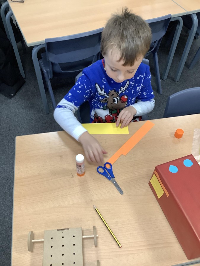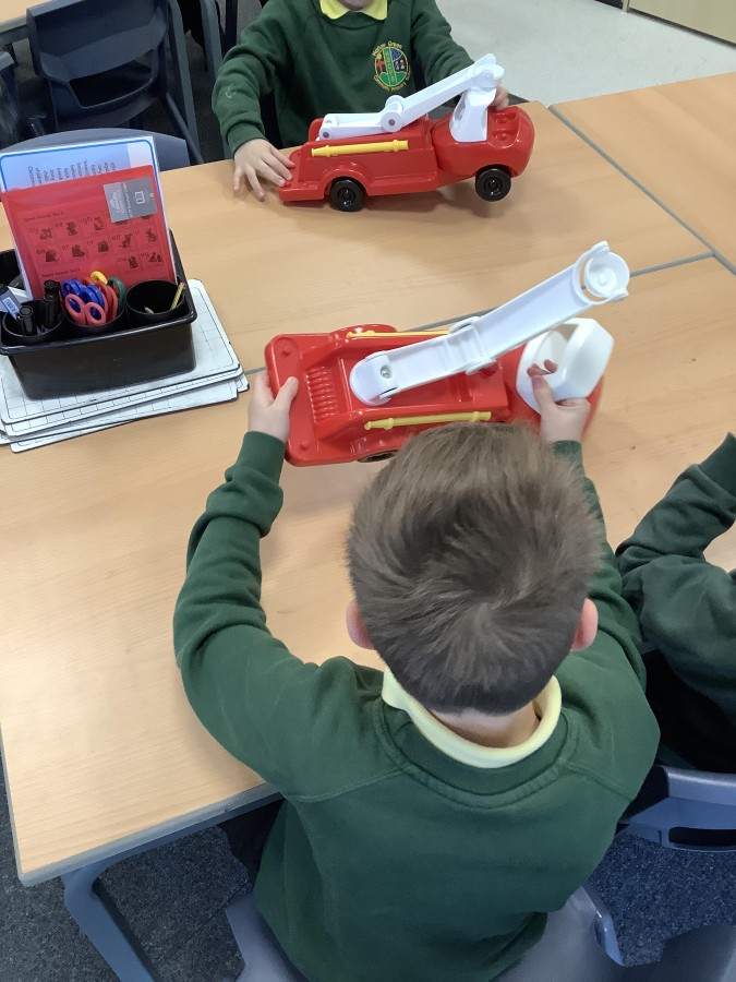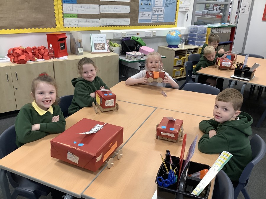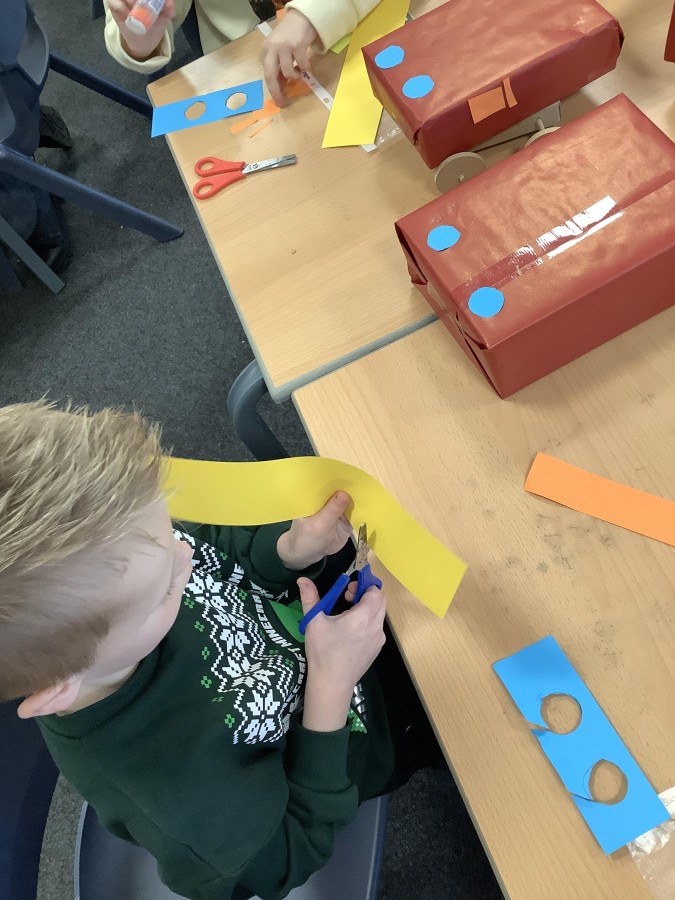 The children in Year 2 have been working hard to design and make their own fire engines. Firstly, they looked at some toy fire engines and talked about the features, describing which ones they liked and also providing reasons why. They enjoyed drawing their own engines and labelling features such as the ladder, wheels, hose and light. They also found out about specific parts that help the vehicle to move, in particular the chassis and the axle. The children were given their own cardboard chassis to build into a cuboid and then they attached two wooden axles and four wheels. Then, there was an opportunity to get creative to add the hose, windows and lights using glue, scissors and different coloured paper. Finally, the boys and girls added a wind up mechanism using a short length of doweling and some string to make the ladder move up and down. Well done!