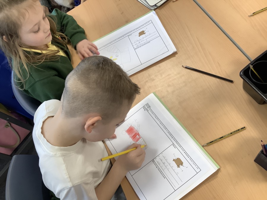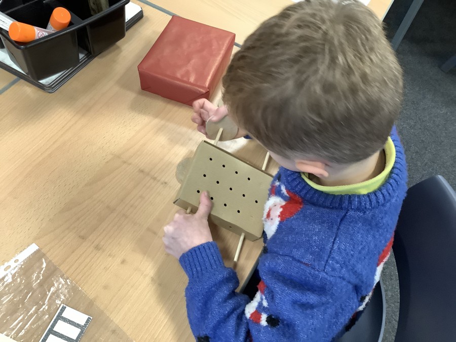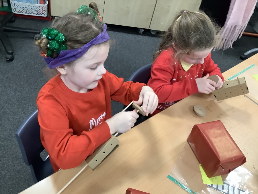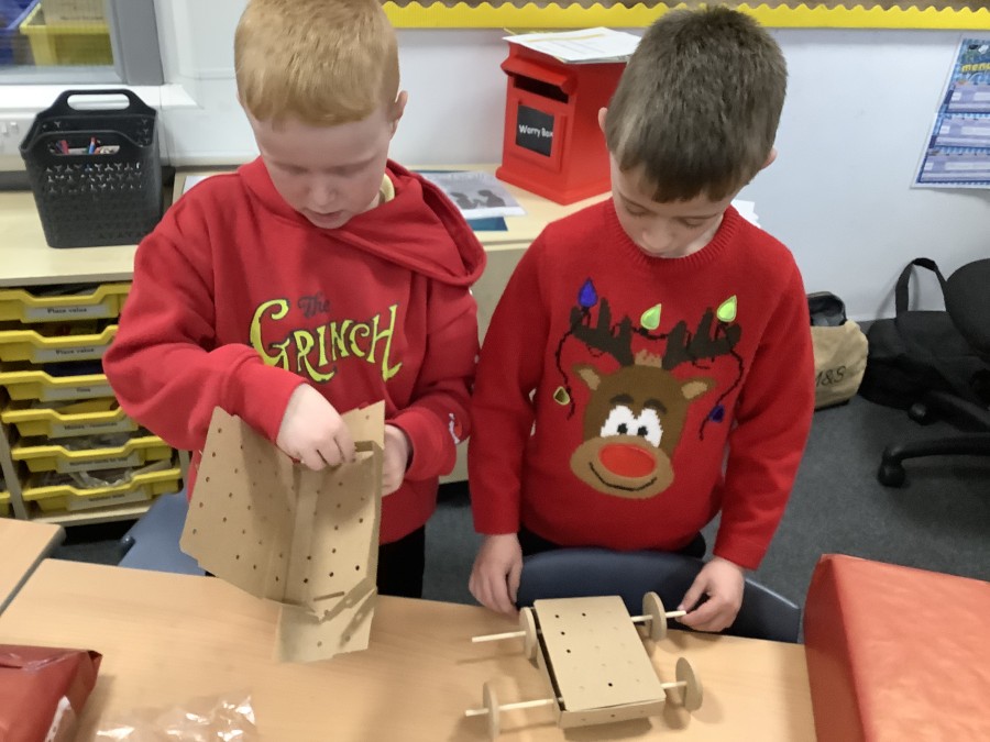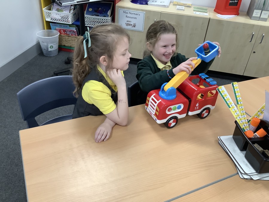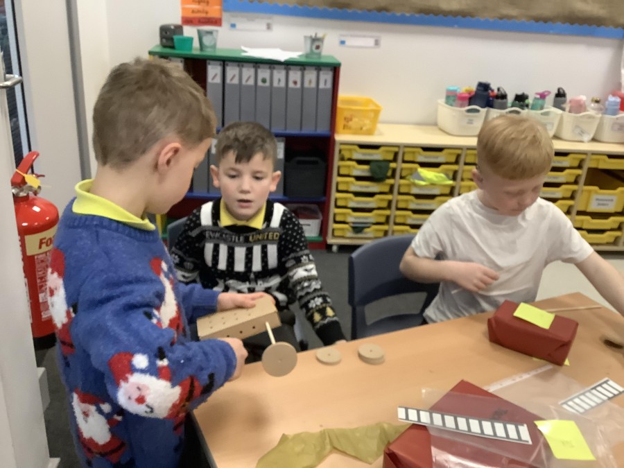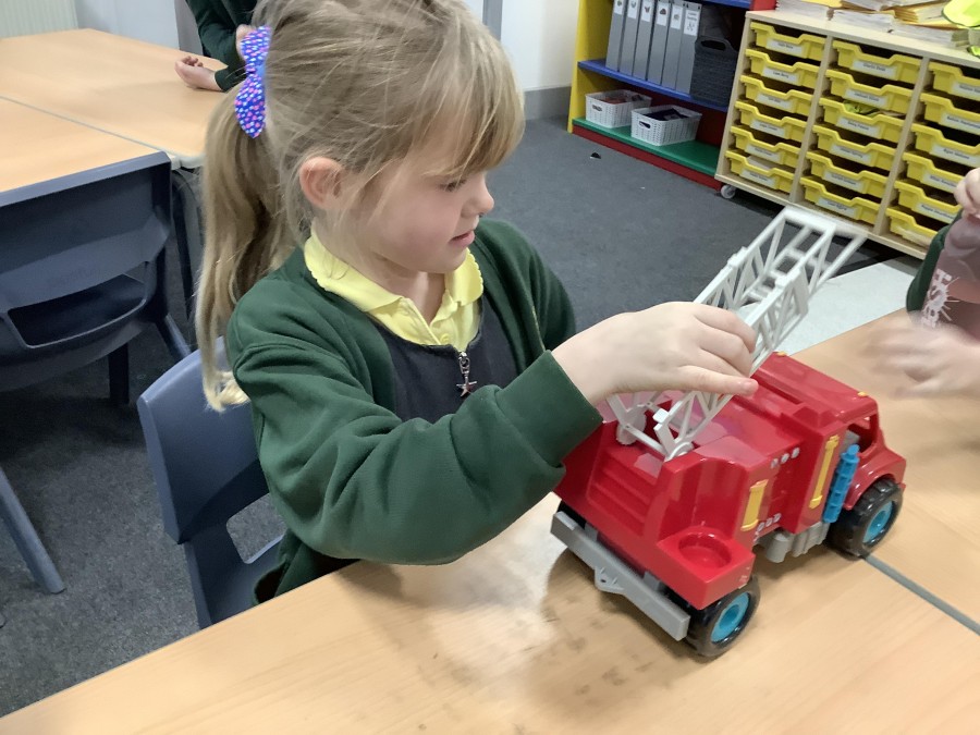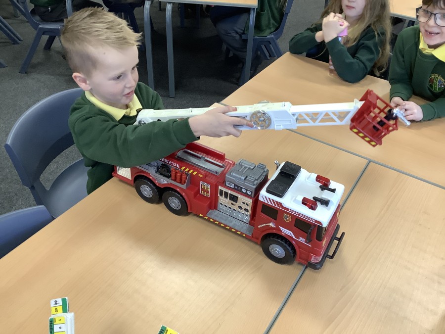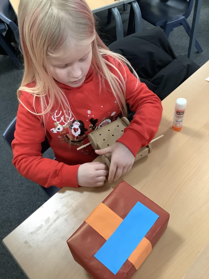 The children in Year 2 have been working hard to design and make their own fire engines. Firstly, they looked at some toy fire engines and talked about the features, describing which ones they liked and also providing reasons why. They enjoyed drawing their own engines and labelling features such as the ladder, wheels, hose and light. They also found out about specific parts that help the vehicle to move, in particular the chassis and the axle. The children were given their own cardboard chassis to build into a cuboid and then they attached two wooden axles and four wheels. Then, there was an opportunity to get creative to add the hose, windows and lights using glue, scissors and different coloured paper. Finally, the boys and girls added a wind up mechanism using a short length of doweling and some string to make the ladder move up and down. Well done!