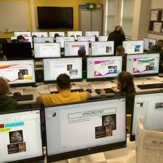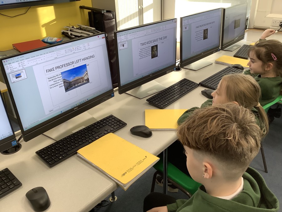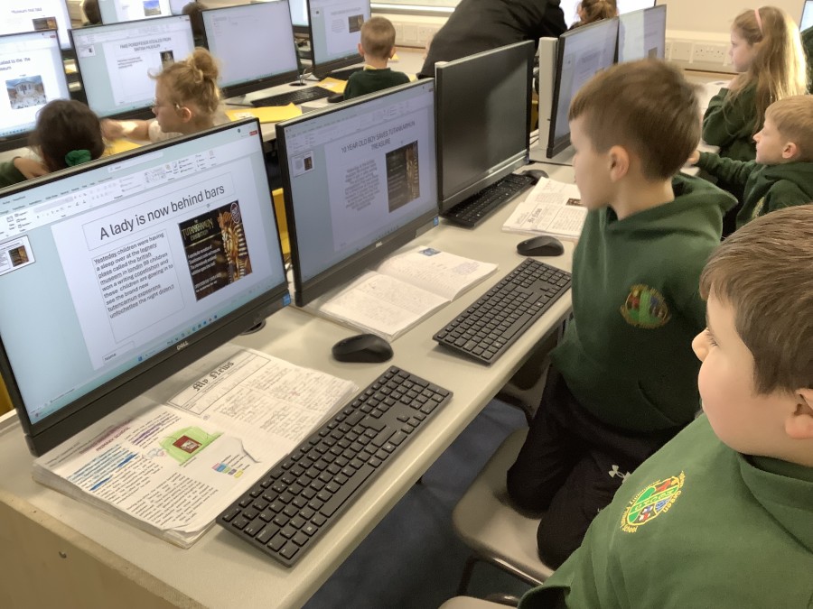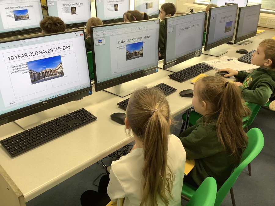 There are a huge range of skills here including holding and using the mouse, typing on the keyboards, cutting, pasting and resizing, and navigating round the menu options and functions on the computers.  After writing newspaper reports in English, the children have had the chance to type some of it up, along with adding headings and importing images.