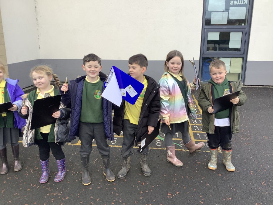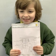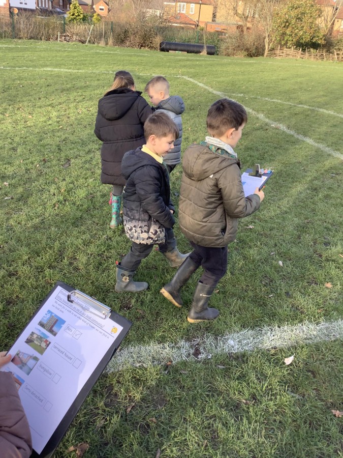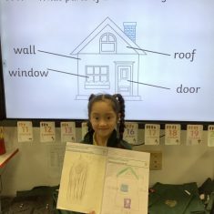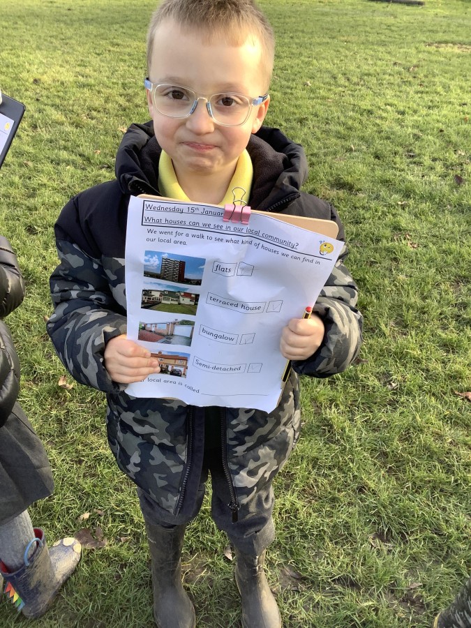 We started off the week by looking at photos and pictures of different kinds of houses. The children loved showing their class photos of their house and we learnt the names of different kinds of houses – detached, semi-detached, terraced, bungalow and flats. Afterwards, everyone drew a picture of a house and labelled it. Finally, we were keen to see different houses in our community. The pupils completed a fieldwork activity on the field to investigate what types of houses they could see.