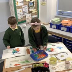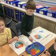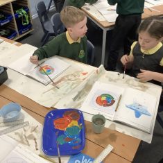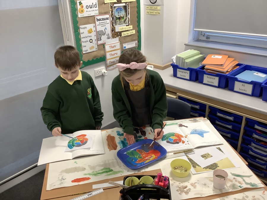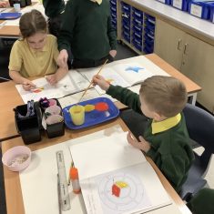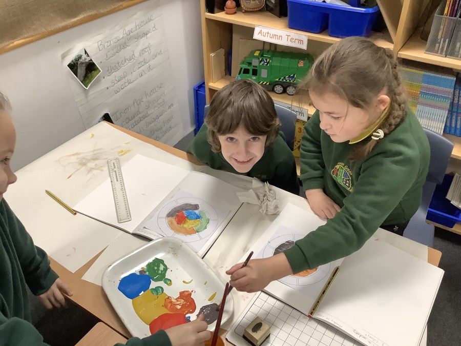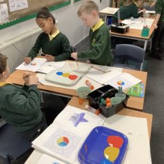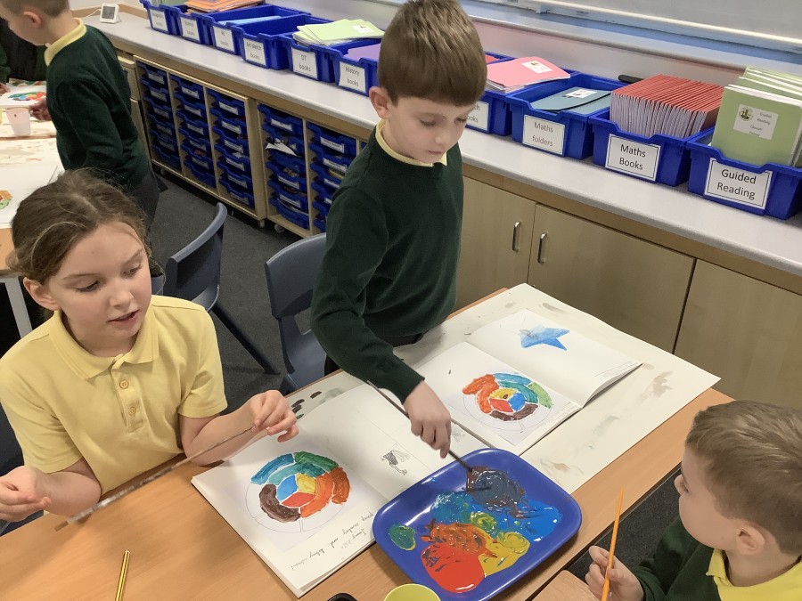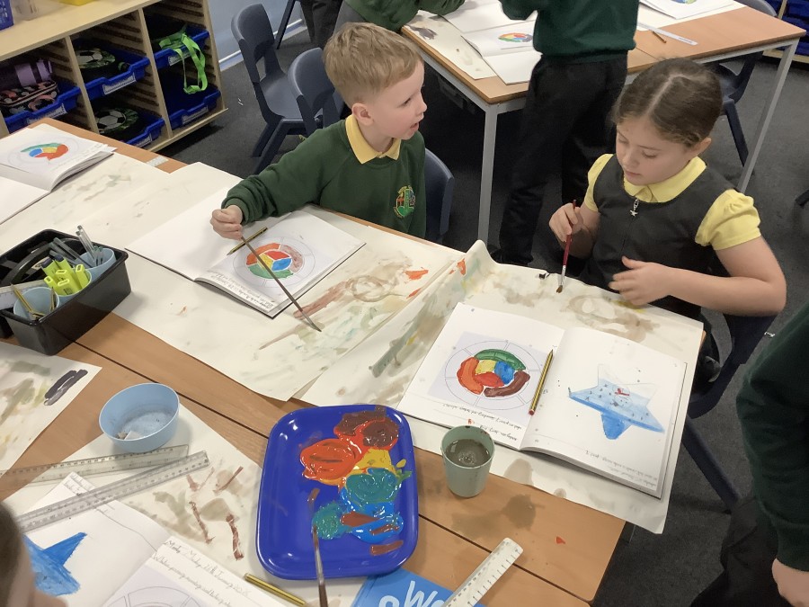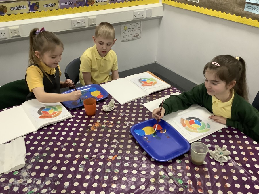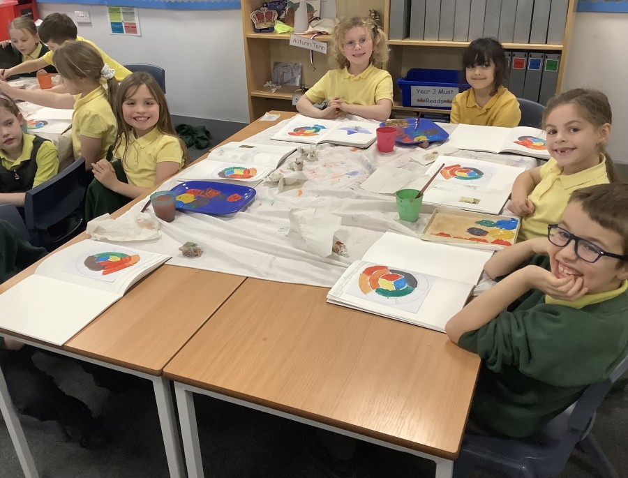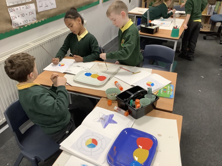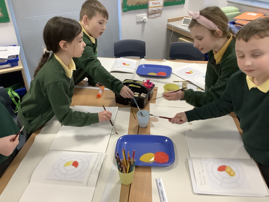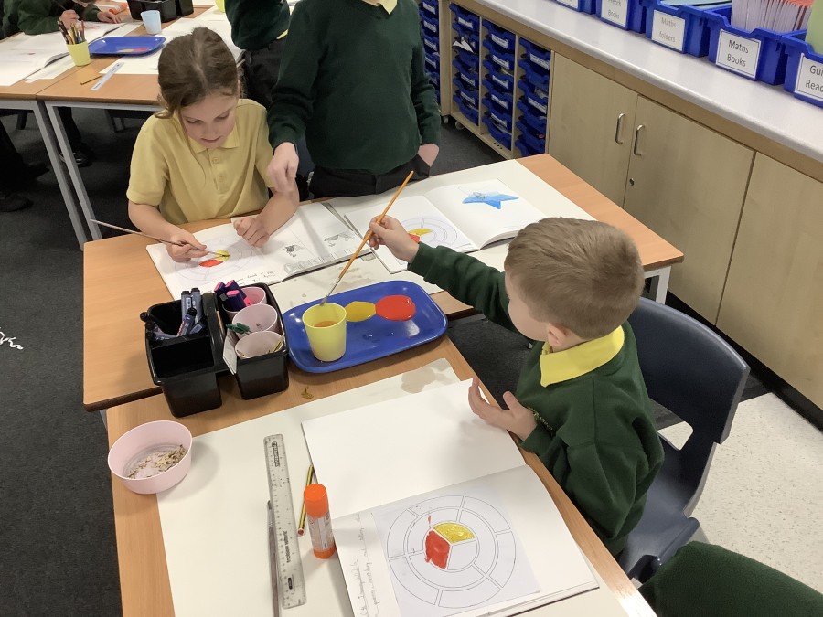 In Key Stage 1, the children learn about primary and secondary colours, and in Year 3, we add tertiary colours and then start exploring tints and tones by using white to change those colours even further.
