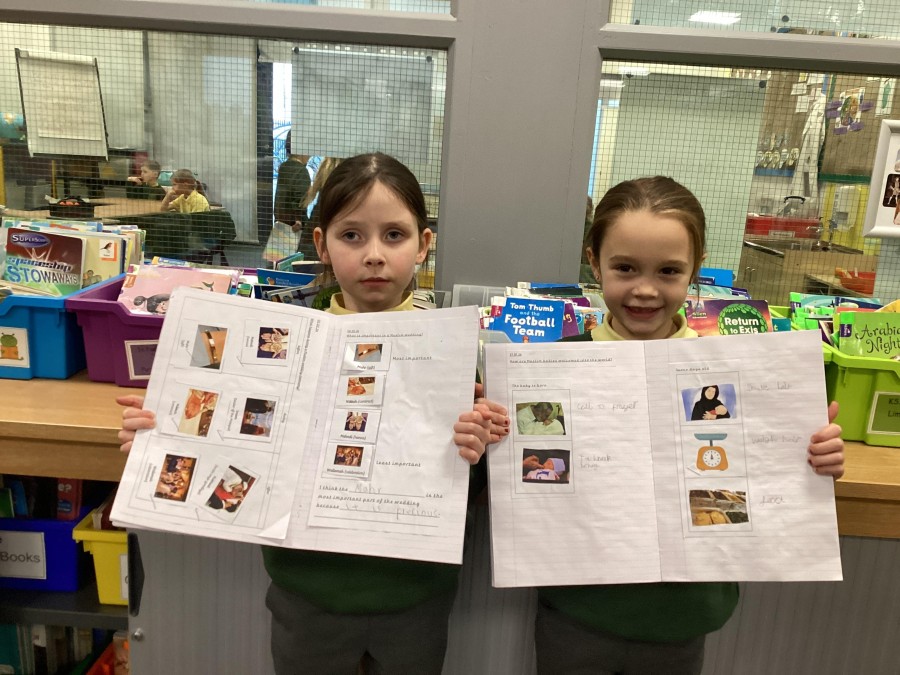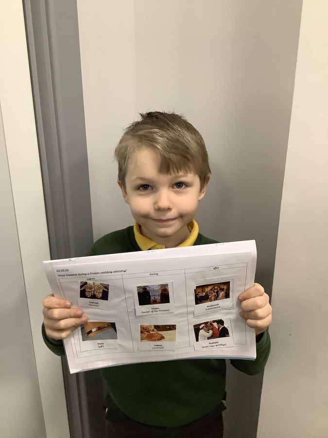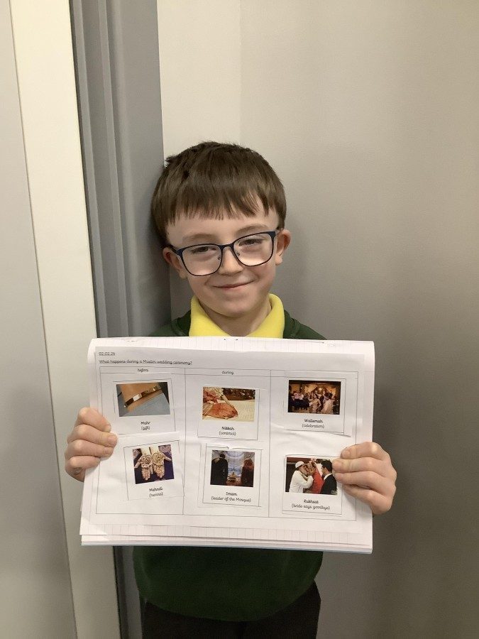Finally, the children learned about Muslim weddings. They sequenced pictures to show what happens before, during and after the ceremony, identifying similarities between the Islamic celebration and a Christian wedding. The children then reflected on which aspect of a Muslim wedding they thought was the most important. The boys and girls concluded the wedding contract was the most important as it is a legal agreement.