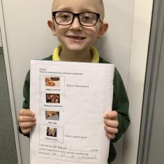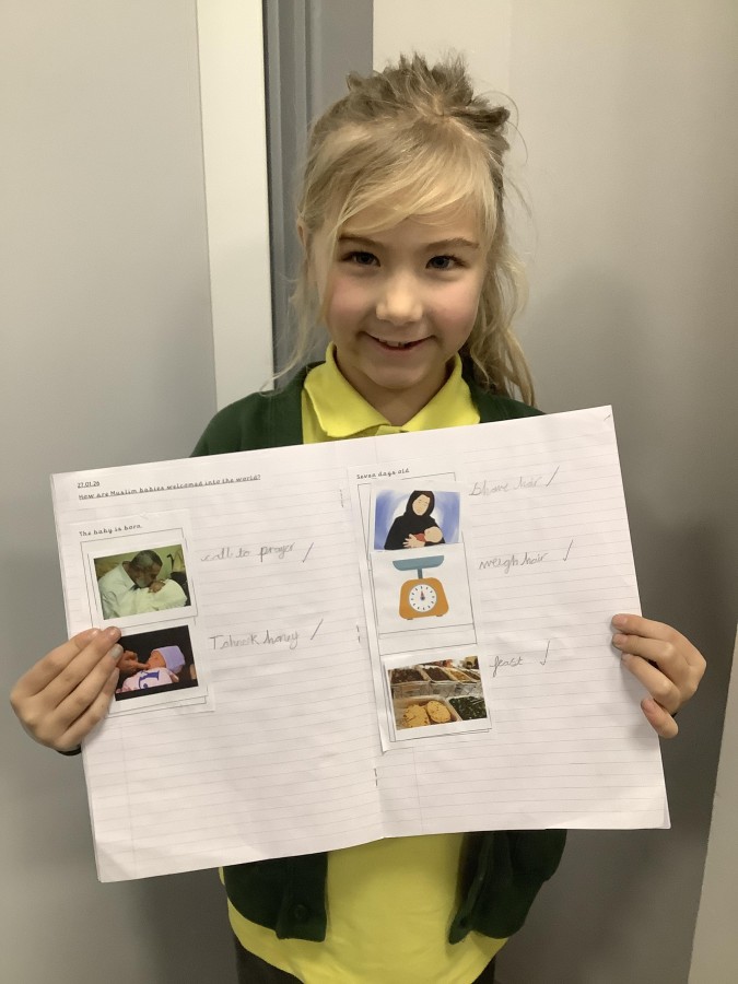 The children then learned about two Muslim celebrations in their RE lessons, including how Muslim babies are welcomed into the world. Aquiqah, or the naming ceremony, begins as soon as a baby is born. The baby’s father whispers the call to prayer into their ear and they are given something sweet. After one week, the baby’s hair is shaved and weighed to determine how much money the family will give to charity.