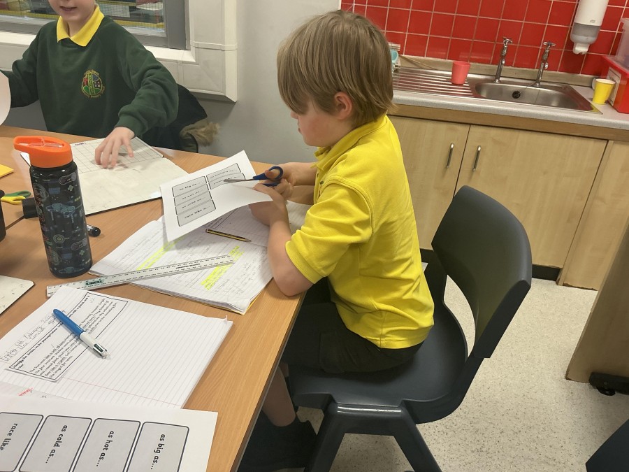 Today, the children were introduced to the language feature similes. They learnt that a simile compares one thing to another using the words ‘as’ or ‘like’. After identifying examples of similes in a model paragraph, the children took part in a fun activity using simile cards, such as ‘as hot as’, ‘as cold as’ and ‘as big as’.
