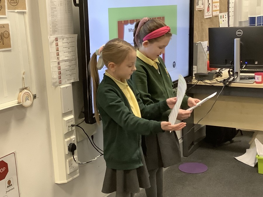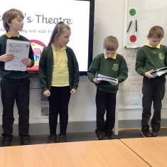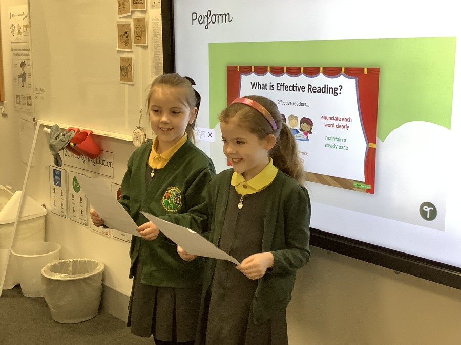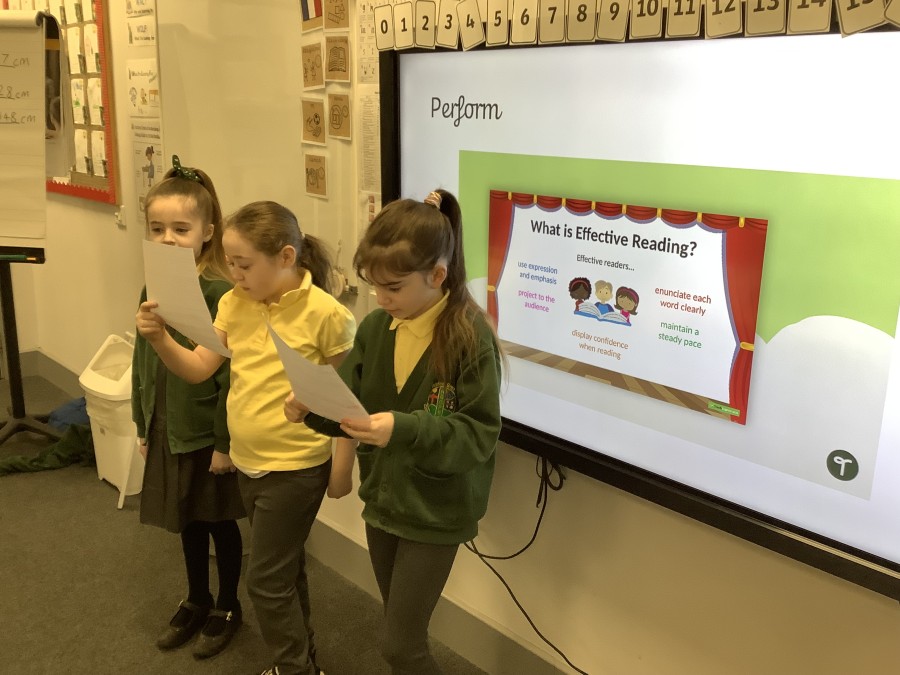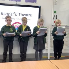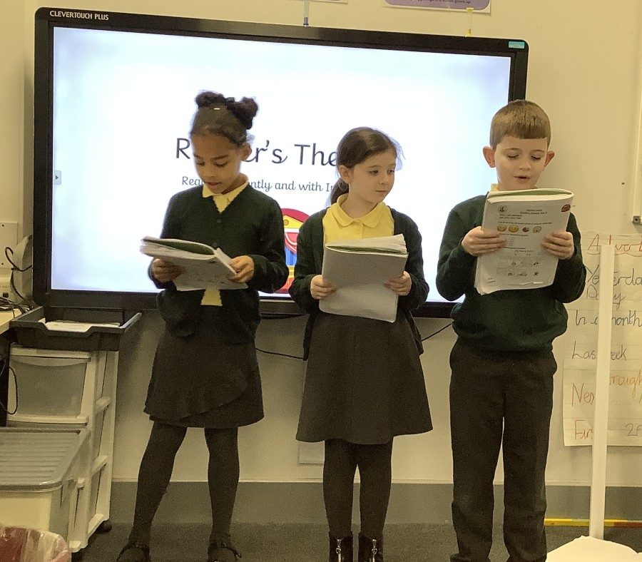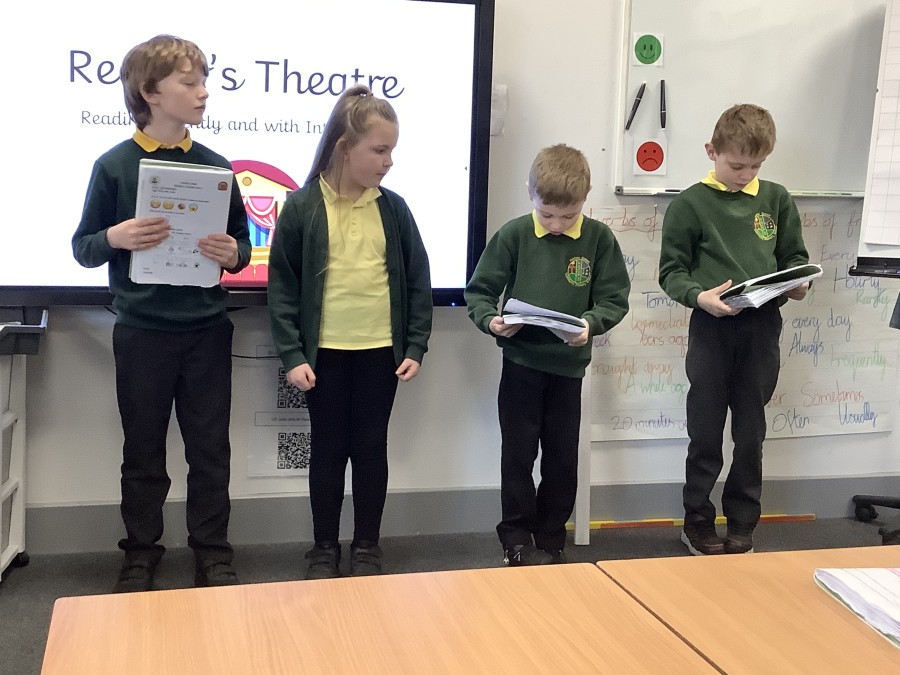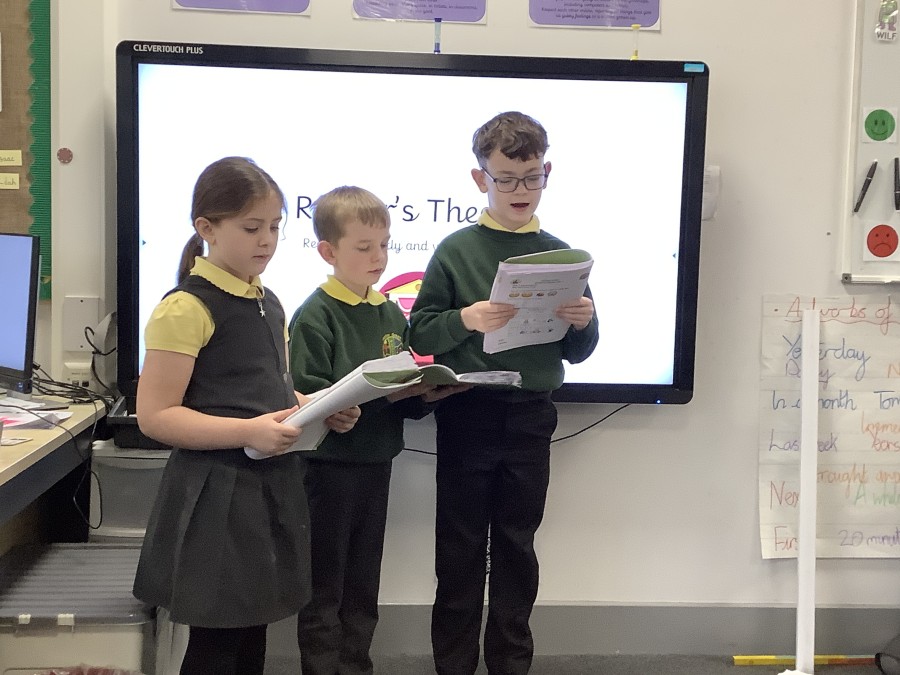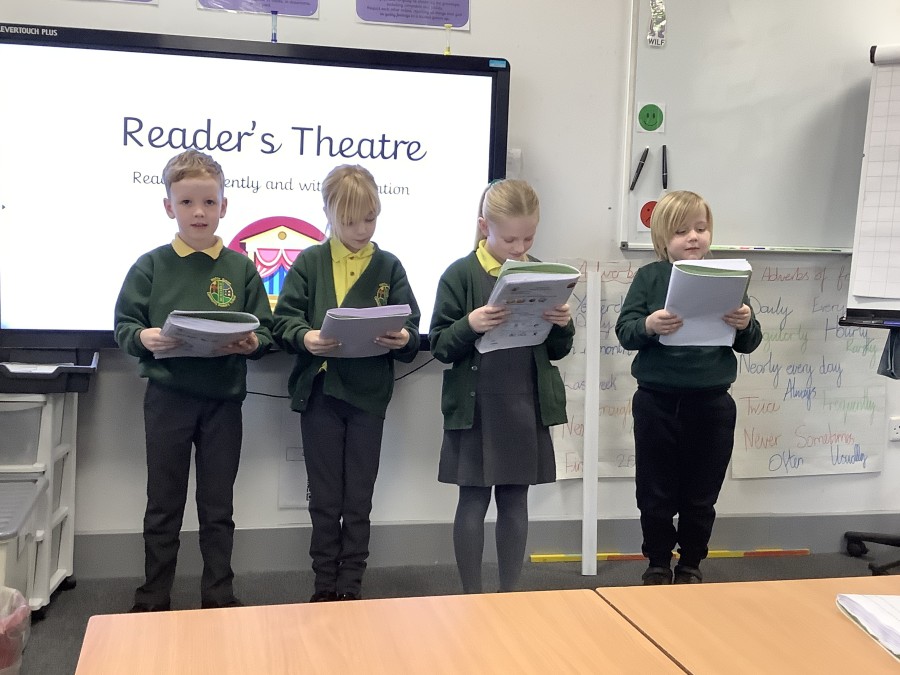 Over the course of the week, they followed the full Reader’s Theatre sequence. They began by listening to modelled reading to hear how tone, pace and expression can bring a text to life. They then took part in echo reading and choral reading, building confidence and practising fluency together. Working in groups, the children annotated their scripts, discussing key words, punctuation and character emotions to help shape their performance.