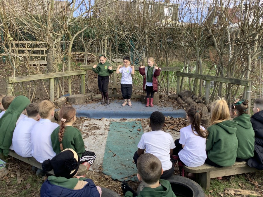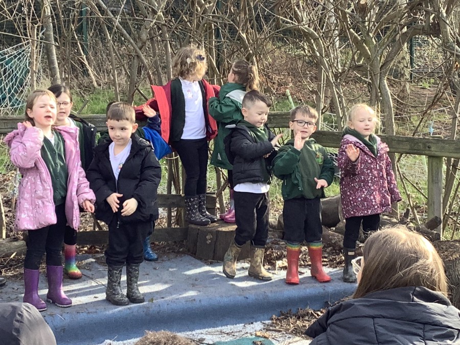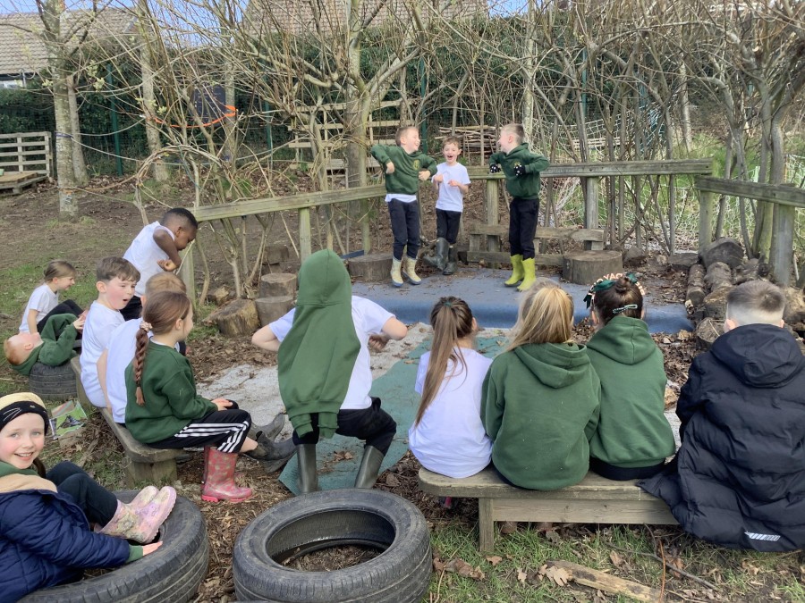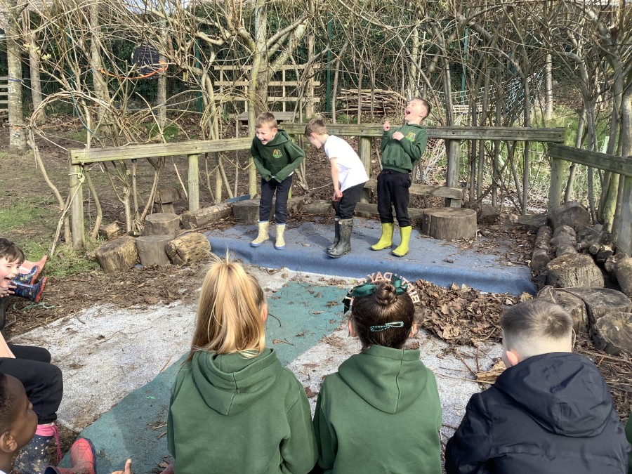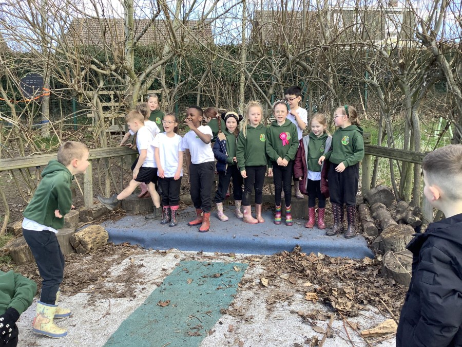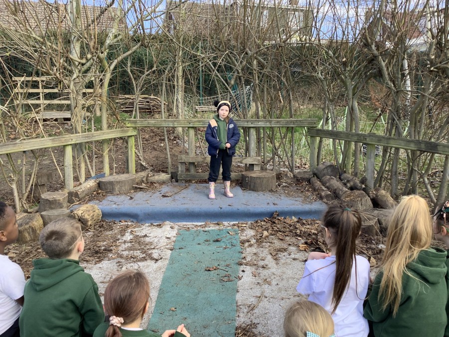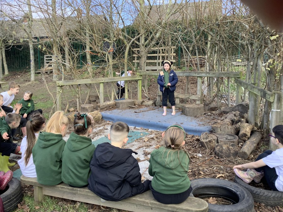 This week it has been so beautiful to have clear, expansive, blue skies, light shining down and not a breath of wind. A beginning of Spring filled with hope, after a very dark, wet winter. All Year groups are still learning about bird identification, playing games to help embed that knowledge but now we can also start enjoying the sunshine and exploring the Forest School. Before half term Miss Rowe set up a woodland stage and the children have been using it to showcase their talents. This week we did this together but the children will be able to access this in their free play time.