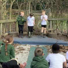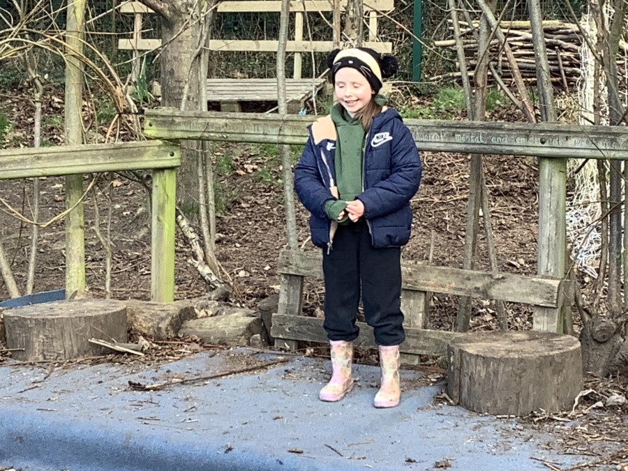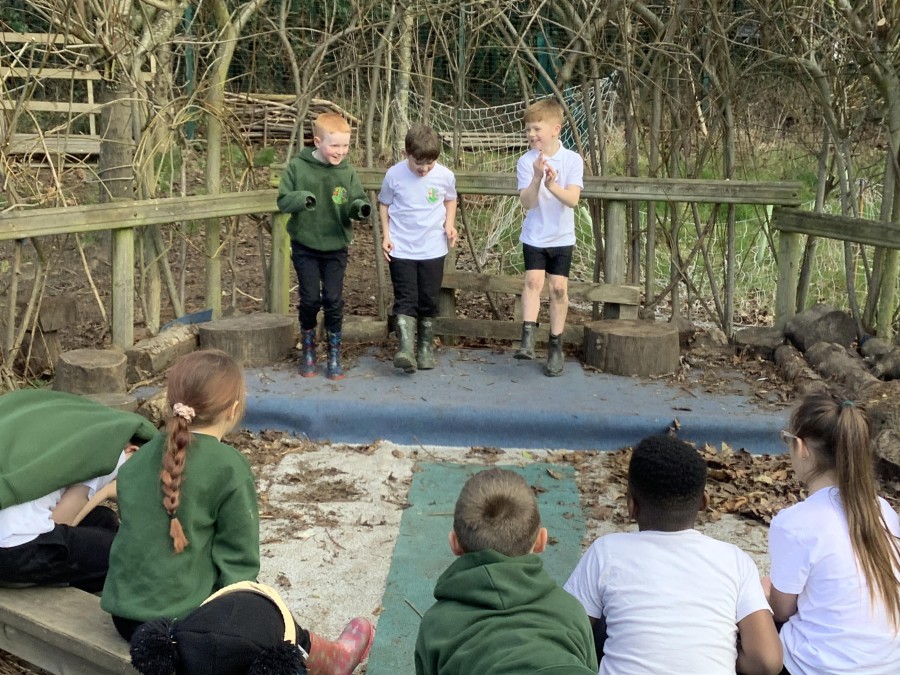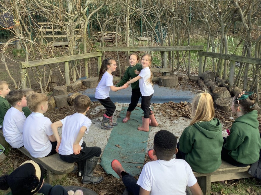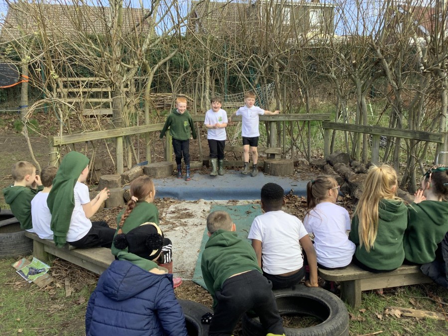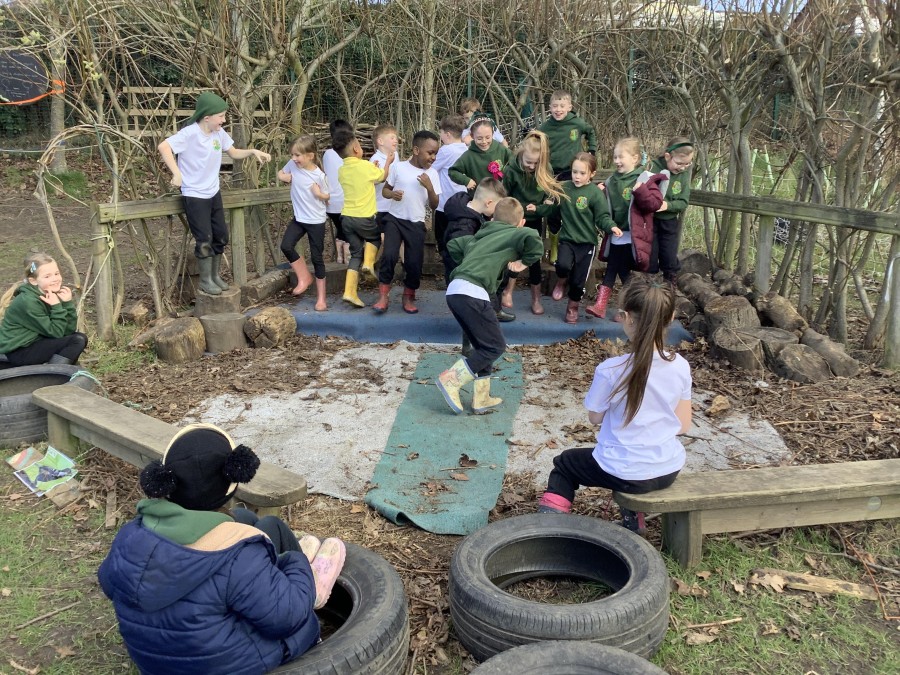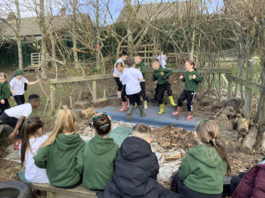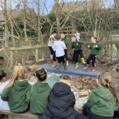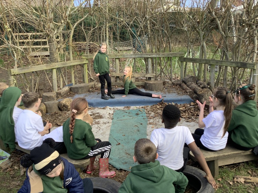 This week it has been so beautiful to have clear, expansive, blue skies, light shining down and not a breath of wind. A beginning of Spring filled with hope, after a very dark, wet winter. All Year groups are still learning about bird identification, playing games to help embed that knowledge but now we can also start enjoying the sunshine and exploring the Forest School. Before half term Miss Rowe set up a woodland stage and the children have been using it to showcase their talents. This week we did this together but the children will be able to access this in their free play time.