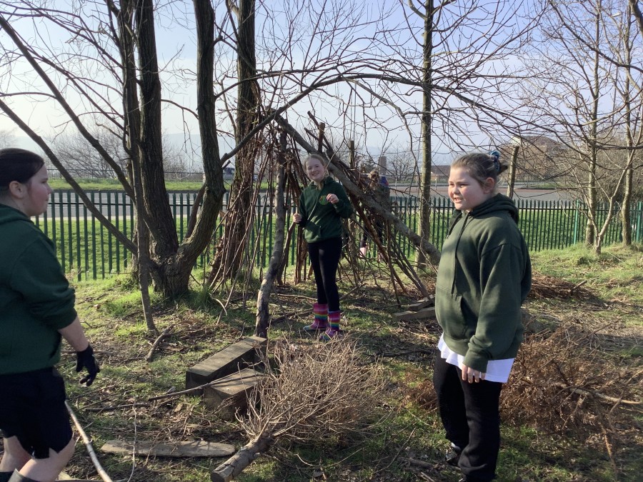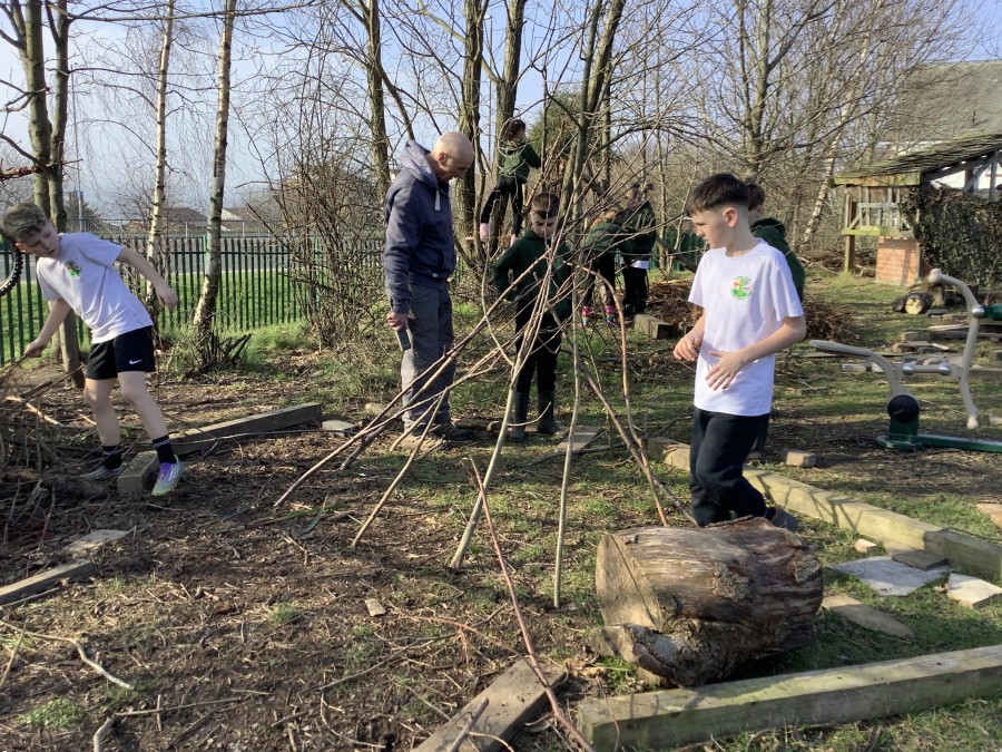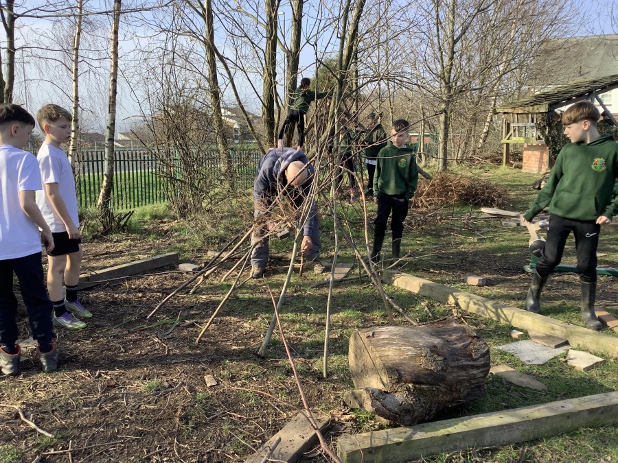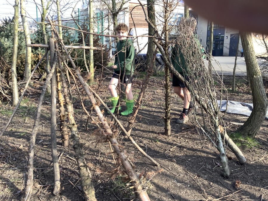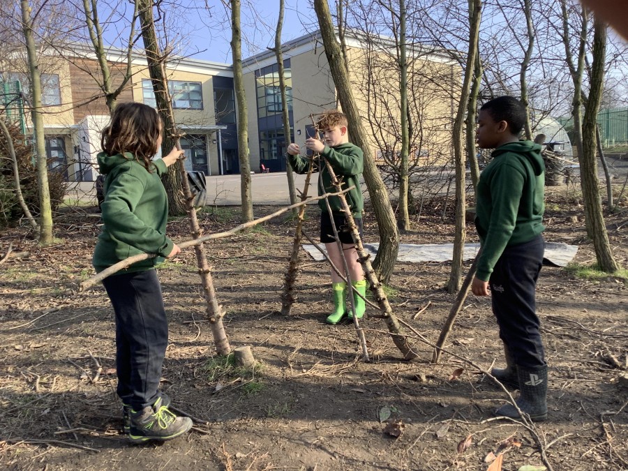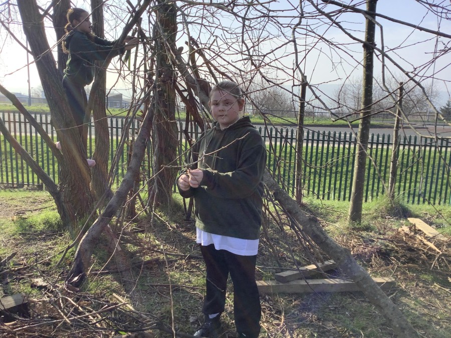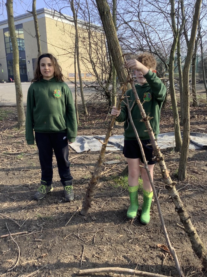 Year 6 tried their hand at freestanding shelters and the adults had a go too. This is really challenging, especially without tools or fastenings. They will progress their skills over this half term, looking at making woodland beds and really understanding using natural materials for weather-proofing.