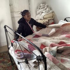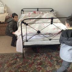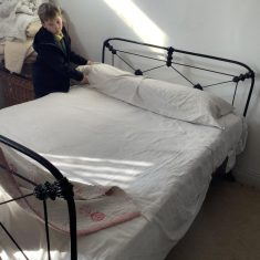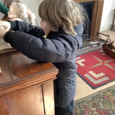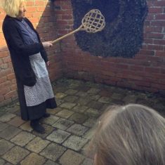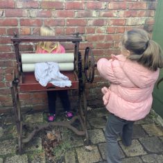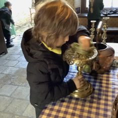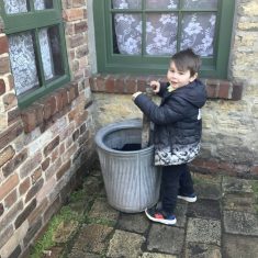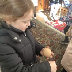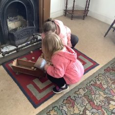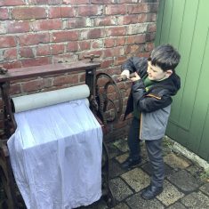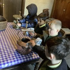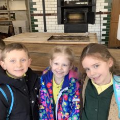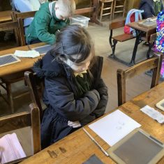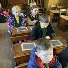 We also visited the Victorian school room. It was so different to our school. The children had to line up in a separate line for boys and girls and we had to call the teacher “Ma’am” at all times. Everyone had to sit on wooden benches and wrote letters on a chalkboard. We even had a go at reading some words. The teacher was very strict and insisted that everyone should work in silence. Later we learnt about Noah’s Ark and read the words to All Things Bright and Beautiful.