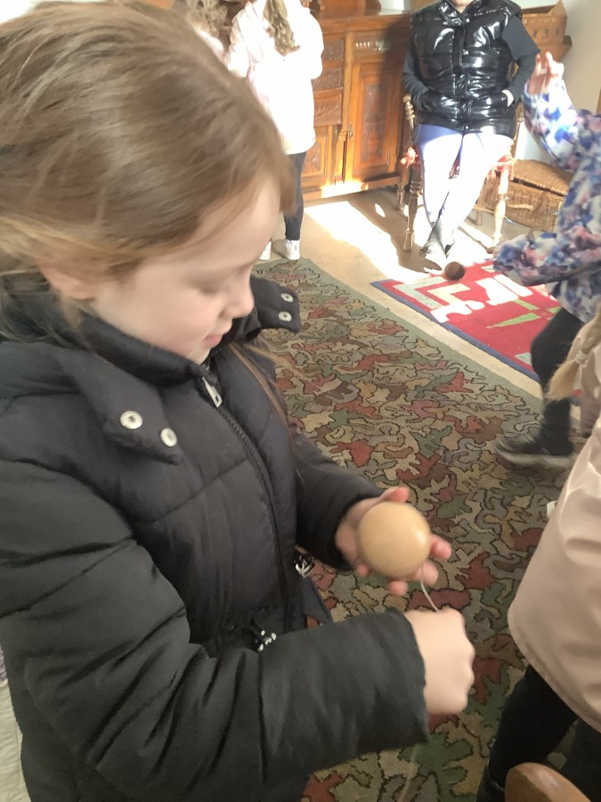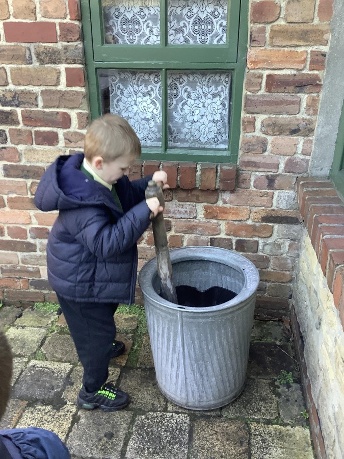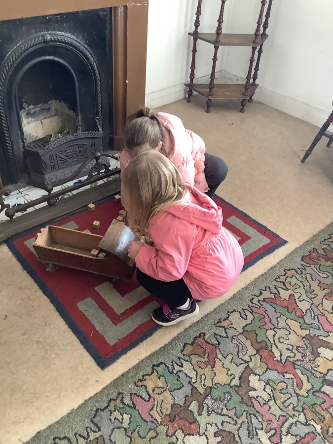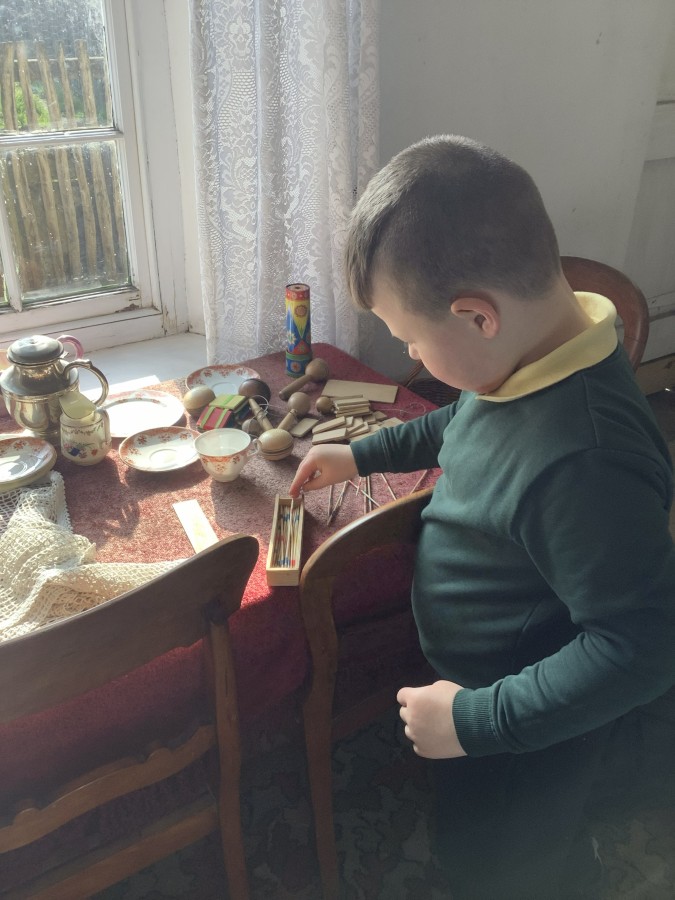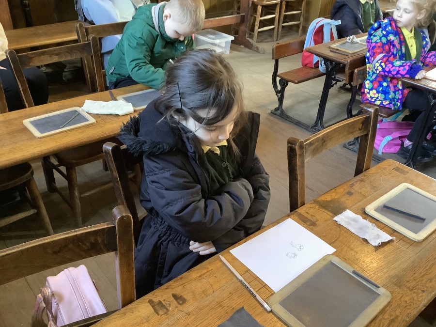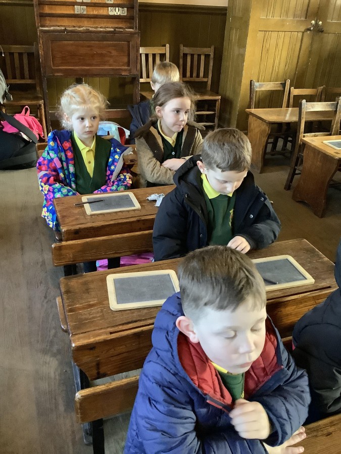 We also visited the Victorian school room. It was so different to our school. The children had to line up in a separate line for boys and girls and we had to call the teacher “Ma’am” at all times. Everyone had to sit on wooden benches and wrote letters on a chalkboard. We even had a go at reading some words. The teacher was very strict and insisted that everyone should work in silence. Later we learnt about Noah’s Ark and read the words to All Things Bright and Beautiful.