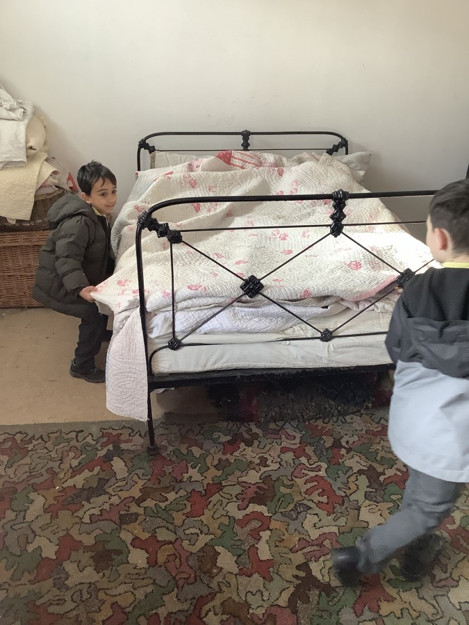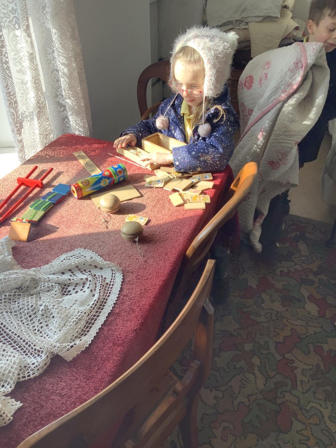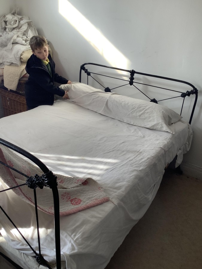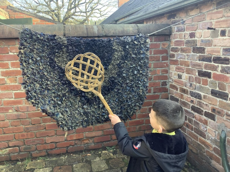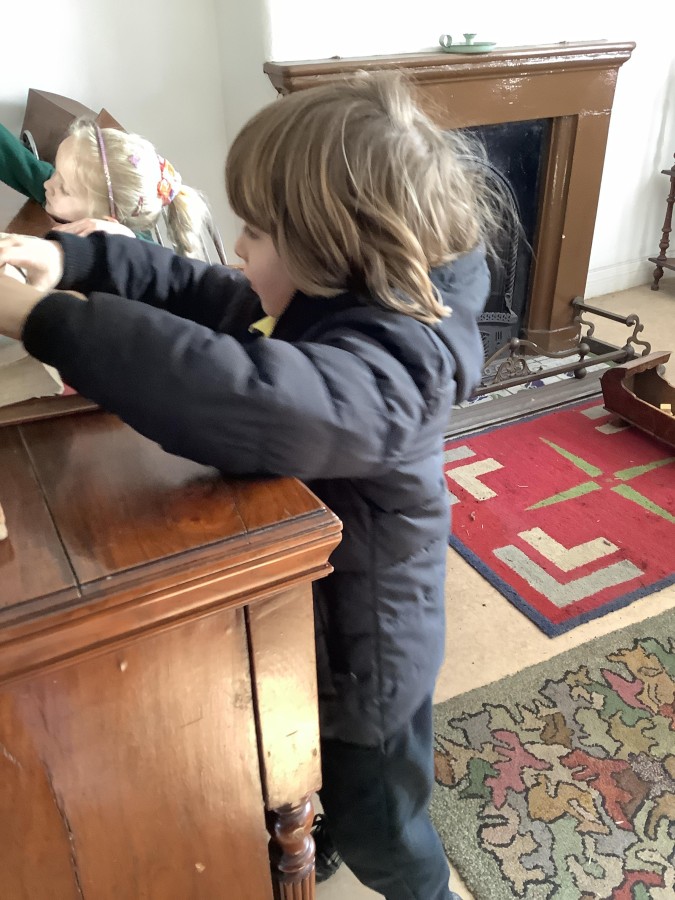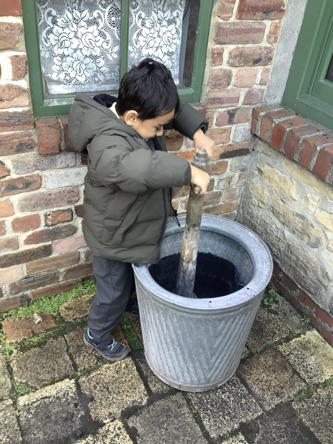 We also visited the Victorian school room. It was so different to our school. The children had to line up in a separate line for boys and girls and we had to call the teacher “Ma’am” at all times. Everyone had to sit on wooden benches and wrote letters on a chalkboard. We even had a go at reading some words. The teacher was very strict and insisted that everyone should work in silence. Later we learnt about Noah’s Ark and read the words to All Things Bright and Beautiful.