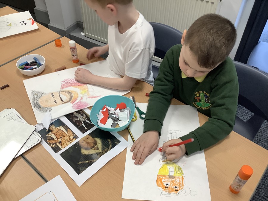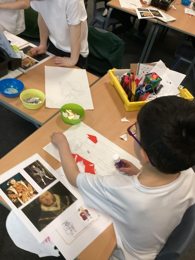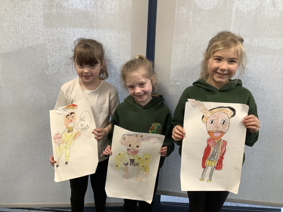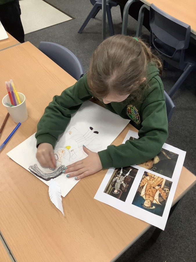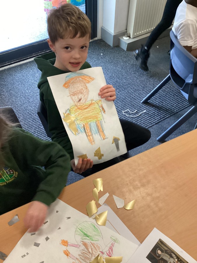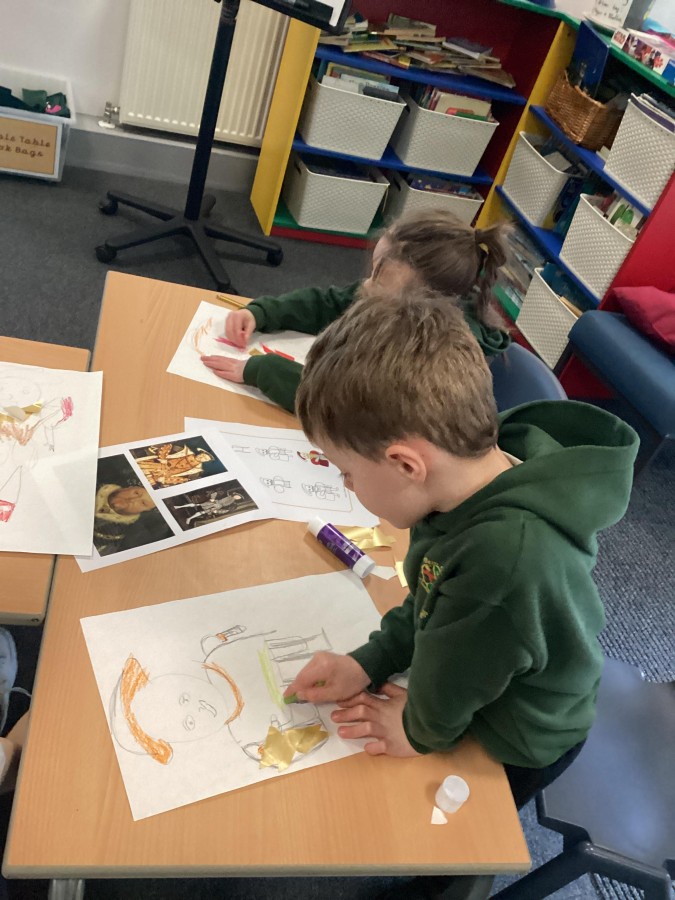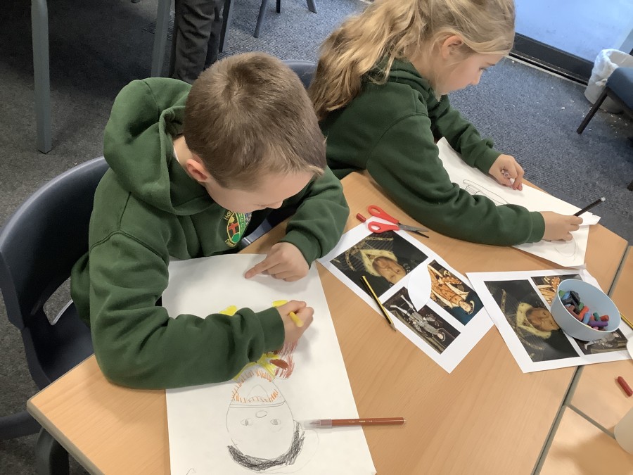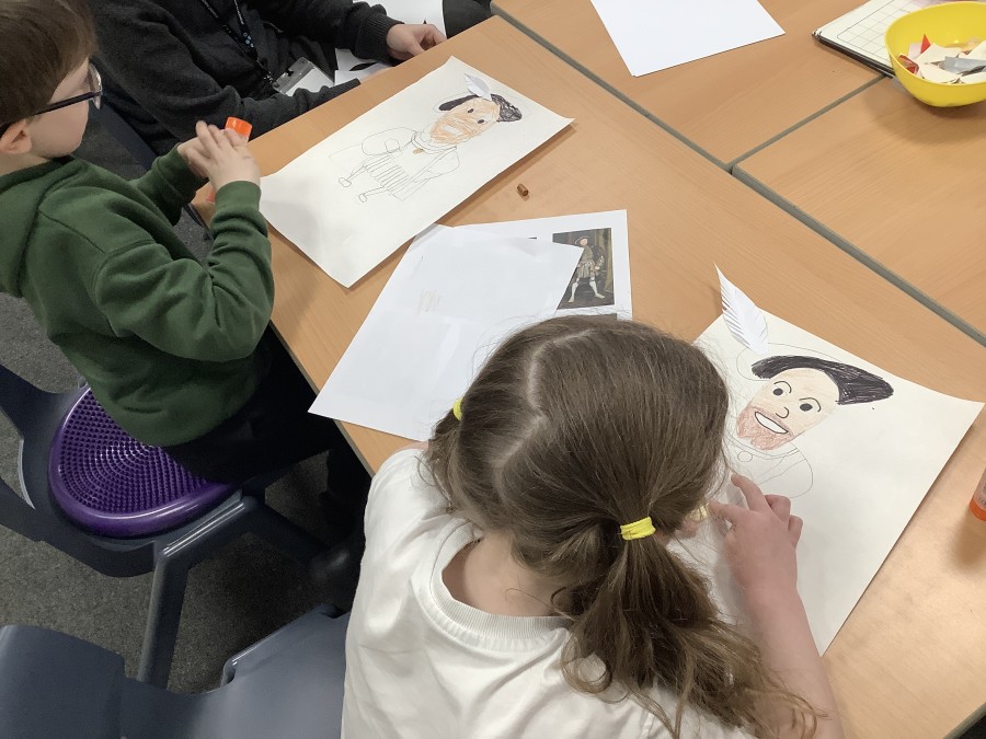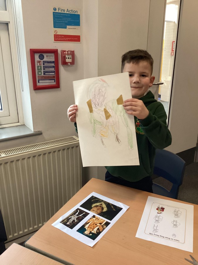 Finally, the children followed a step-by-step guide to draw a portrait of Henry VIII. They used crayons and felt tips to colour, before adding luxurious jewels and a feather.