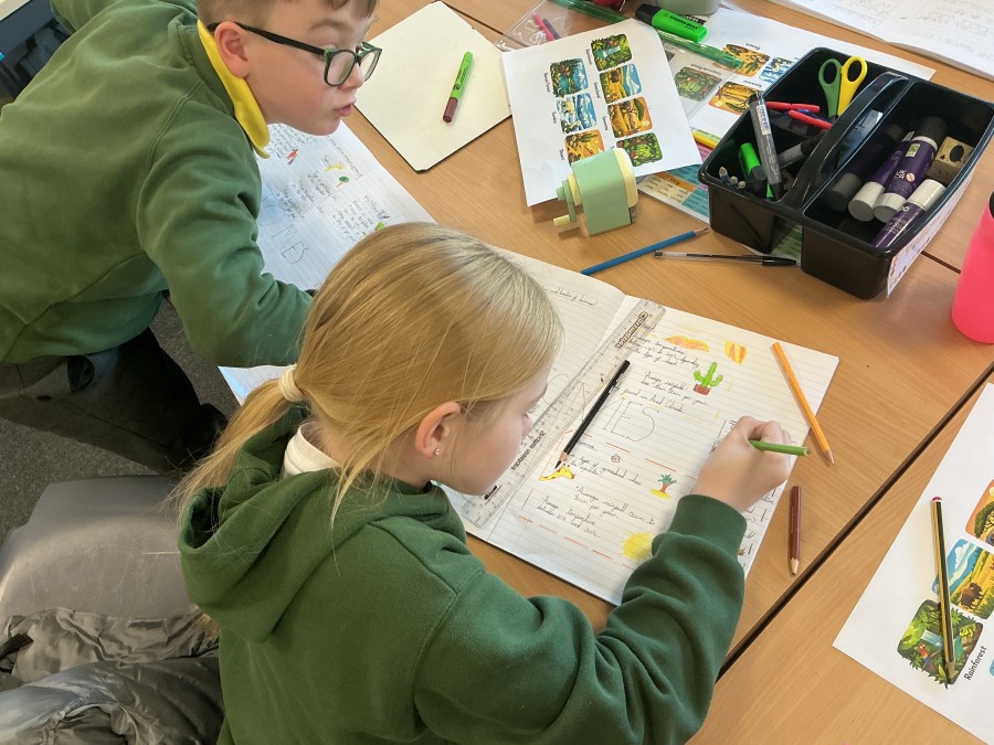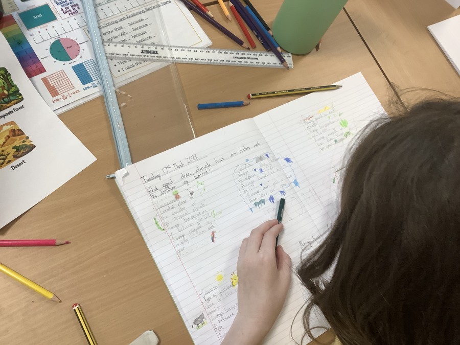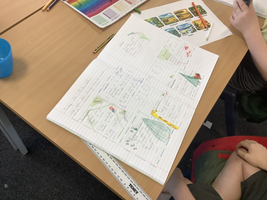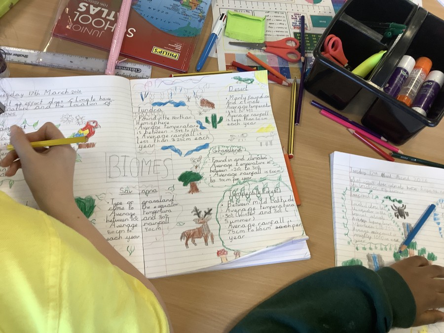 The children investigated key features of each biome, including typical weather patterns, levels of rainfall, and the plants and animals that live there. They then applied their knowledge by creating detailed double-page spreads. The children took great care with their presentation, using colour and illustrations inspired by each biome to enhance their work.
