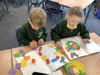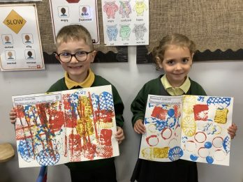 This week has seen the start of our art block of work. It all started with learning about primary colours. We learnt that the primary colours are red, yellow and blue. Every child coloured a red, yellow and blue primary colour wheel. The colouring was so neat! Next the children investigate