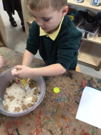 In Nursery the children have been learning about the celebration of Bonfire Night. We learnt that Bonfire Night happens on the 5th November each year, as a remembrance of Guy Fawkes who tried to blow up the Houses of Parliament with gunpowder in 1605. To recreate the gunpowder theme Nursery took par