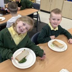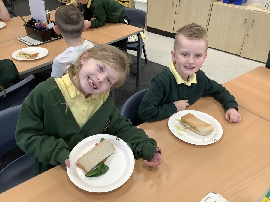 In DT, Year Two have designed and made a healthy sandwich. To begin the children compared a cheese salad sandwich and a chocolate spread sandwich. They identified the ingredients and sorted them onto the Eat Well Plate. The boys and girls quickly realised that the cheese salad sandwich was a healt